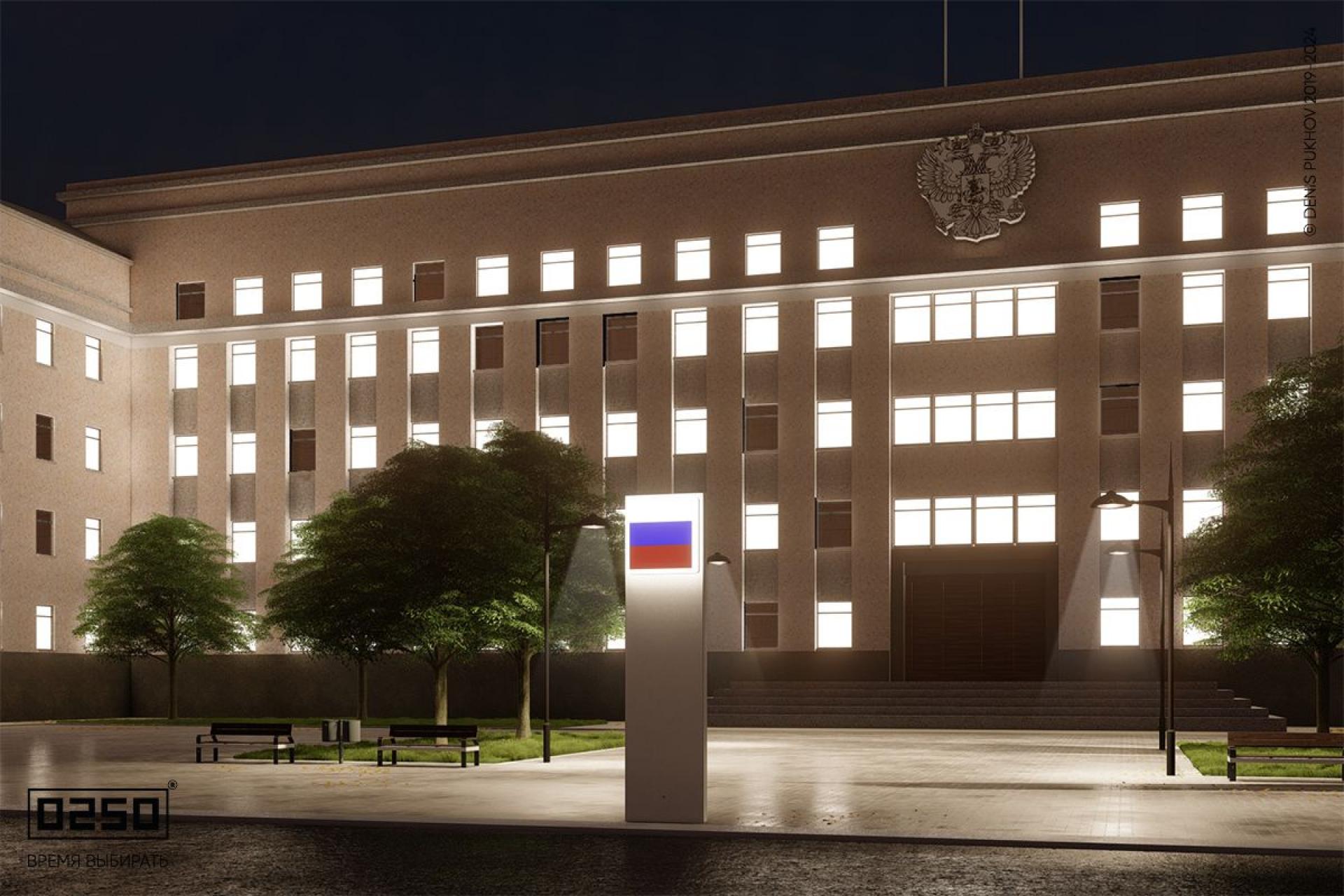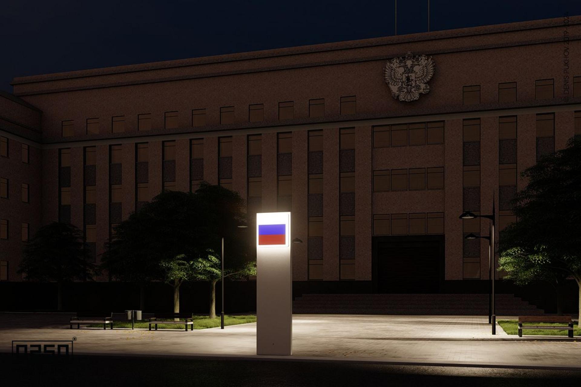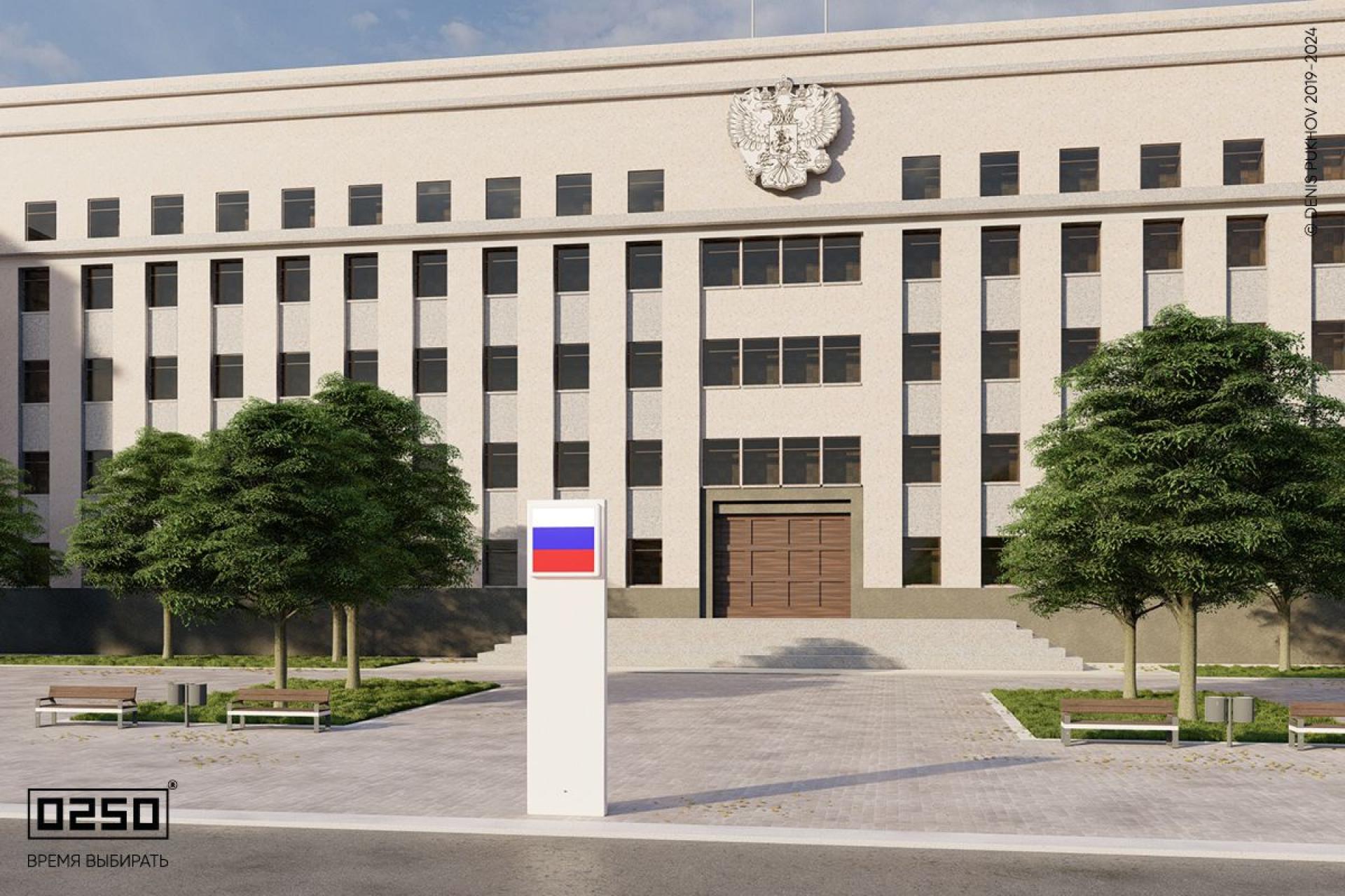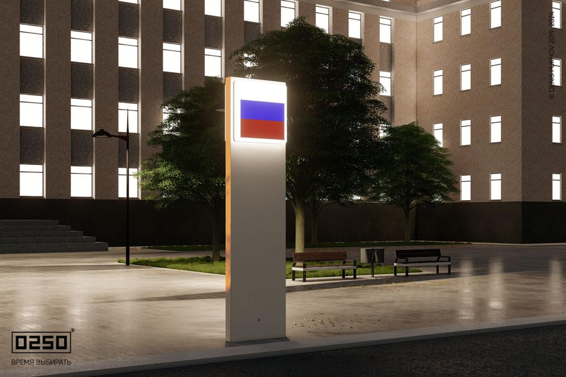 Стела представляет собой современное произведение искусства, выполненное из архитектурного бетона. Основным элементом дизайна является триколор, который символизирует национальные цвета и культуру. Композиция сочетает в себе строгие геометрические формы и гармоничное использование цветовых акцентов