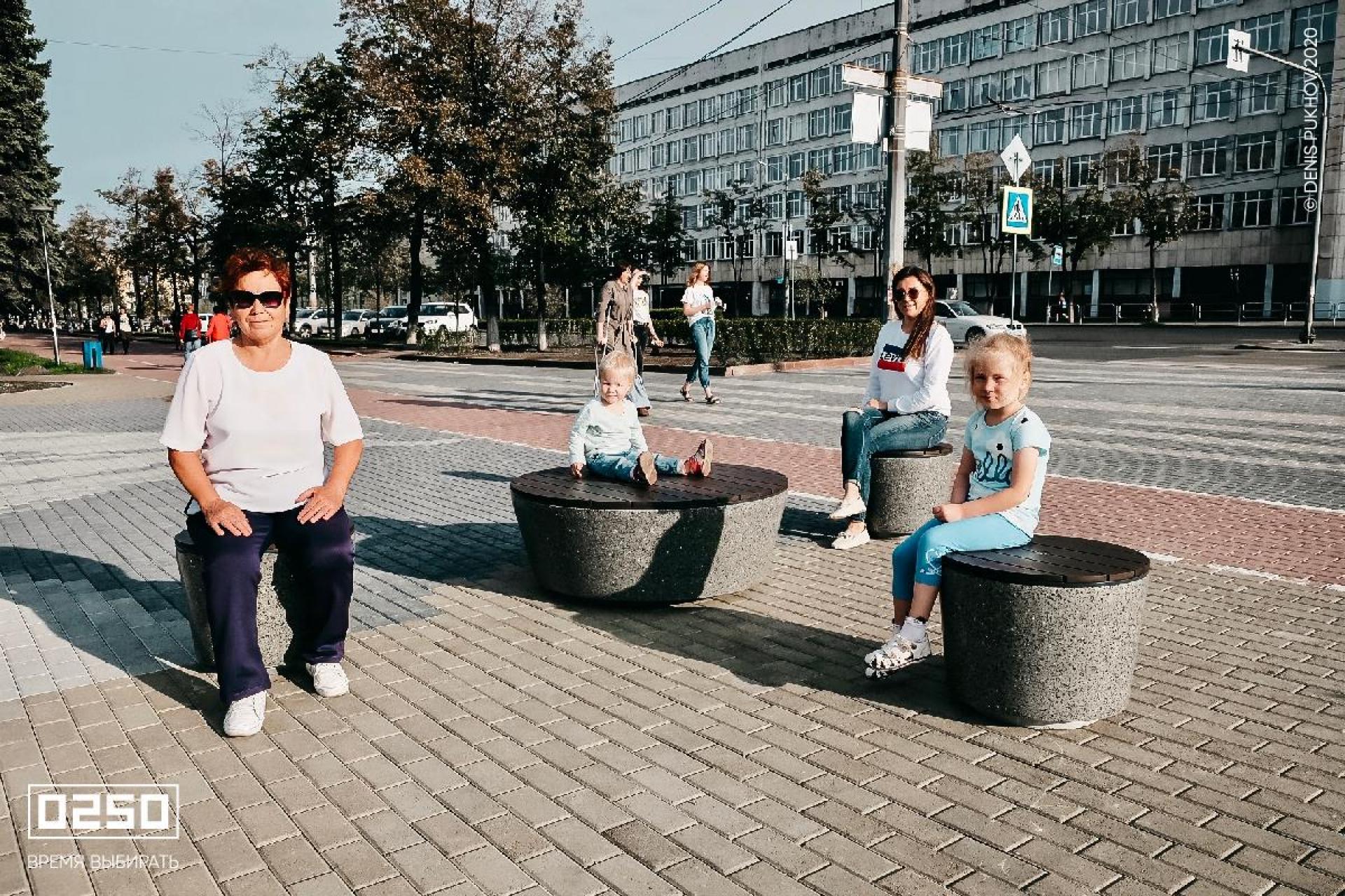 Фактуры гладкого камня и насыщенных оттенков дерева гармонируют с городскими объектами. Круглые скамейки в виде шайбы особенно эффектно выглядят