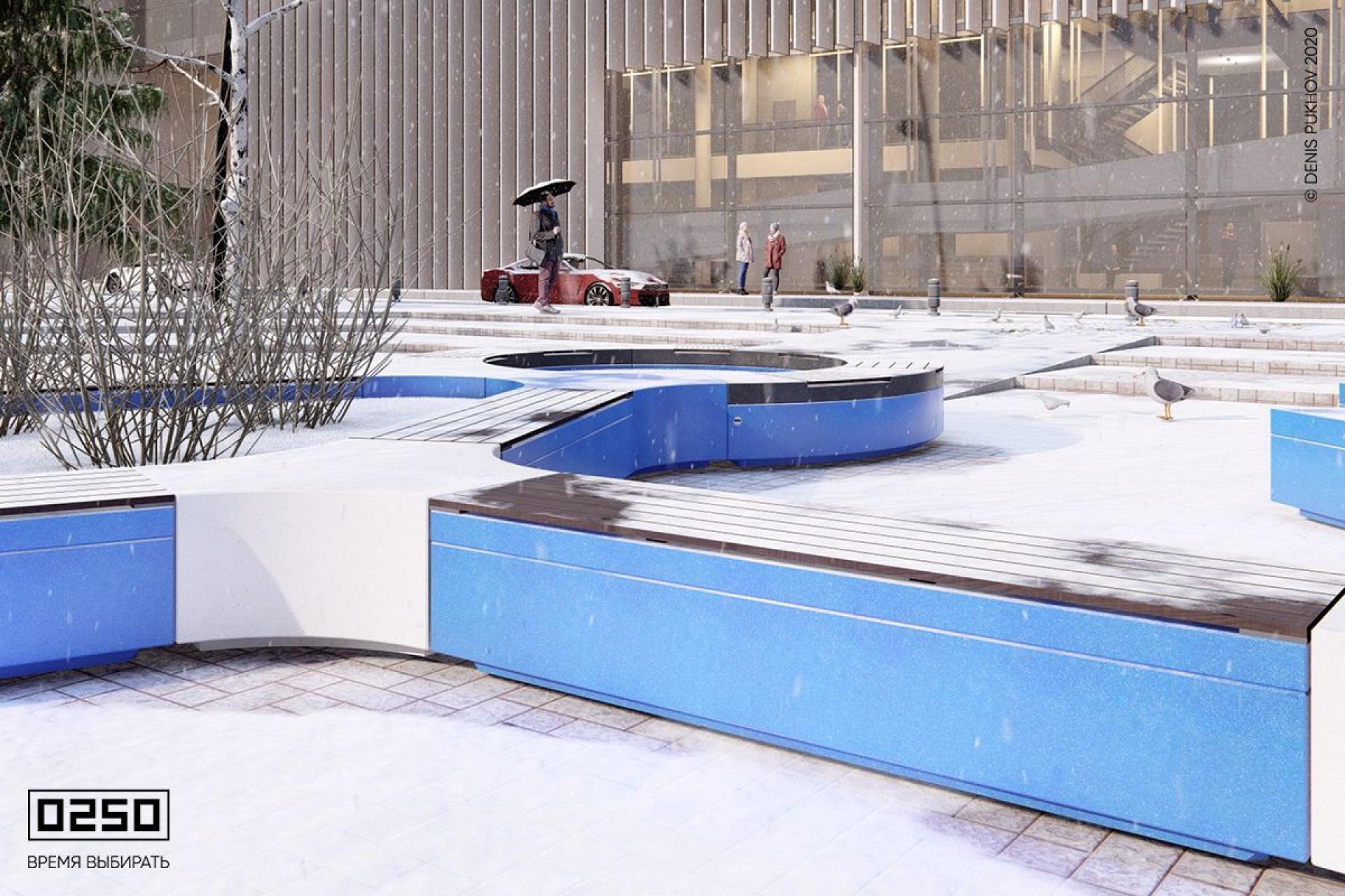 - Материалы скамейки: Скамейка из бетона и древесины (полированный ультра-прочный UHPС бетон 6 — цветов, уф-защищенная термодревесина темного цвета)