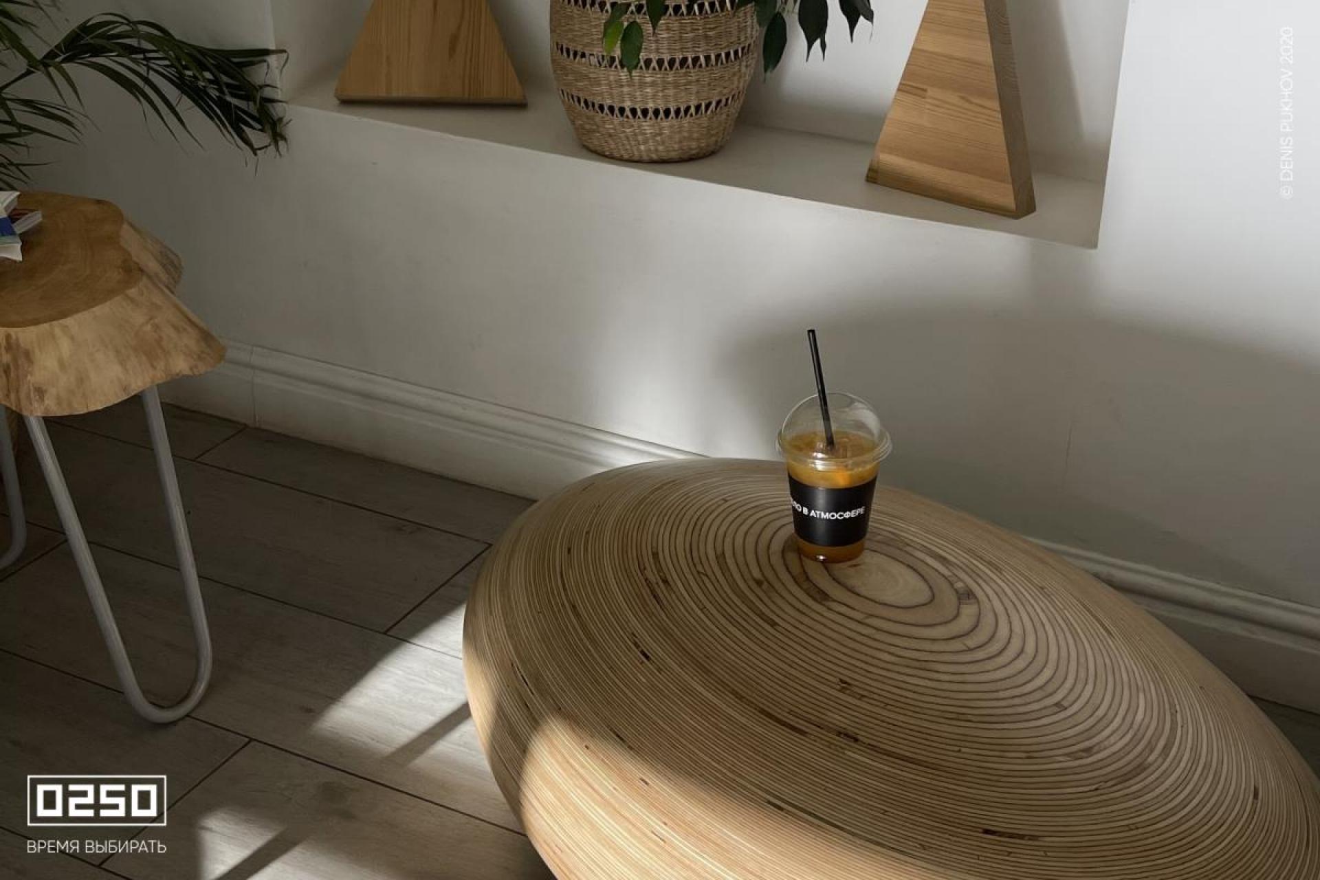 Разместили функциональный арт-объект из натуральных материалов и природных оттенков, подходящих интерьеру кафе. Объект должен играть роль скамьи или стола.