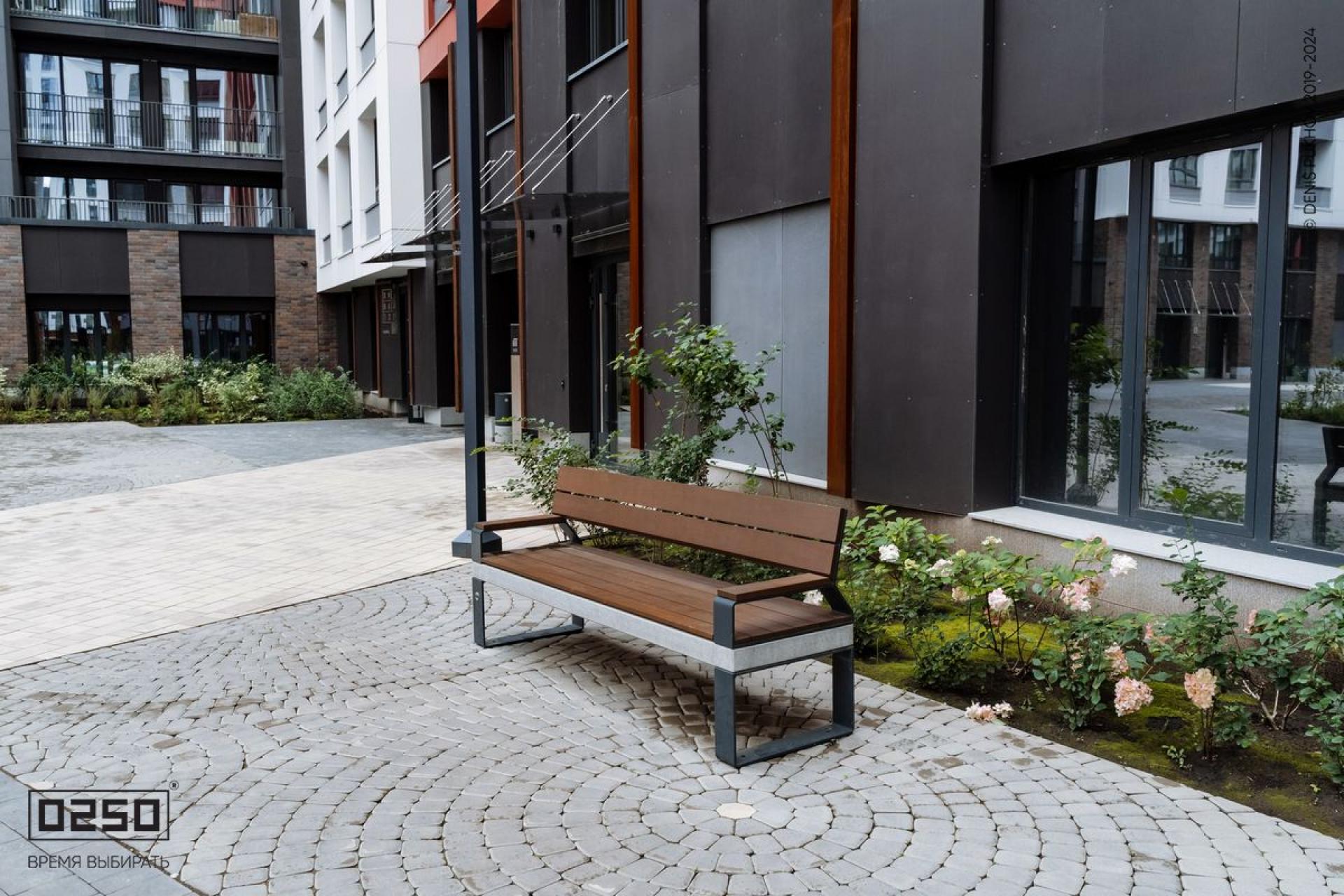 - Материалы скамейки: Скамейка из бетона металла и древесины (полированный ультра-прочный UHPС бетон 6 — цветов, полимеризованный алюминий цвет RAL - 7016 , уф-защищенная термодревесина темного цвета