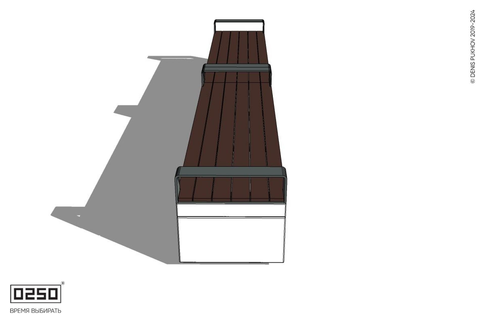 - Материалы скамейки: Скамейка из бетона металла и древесины (полированный ультра-прочный UHPС бетон 6 — цветов, полимеризованный алюминий цвет RAL - 7016 , уф-защищенная термодревесина темного цвета