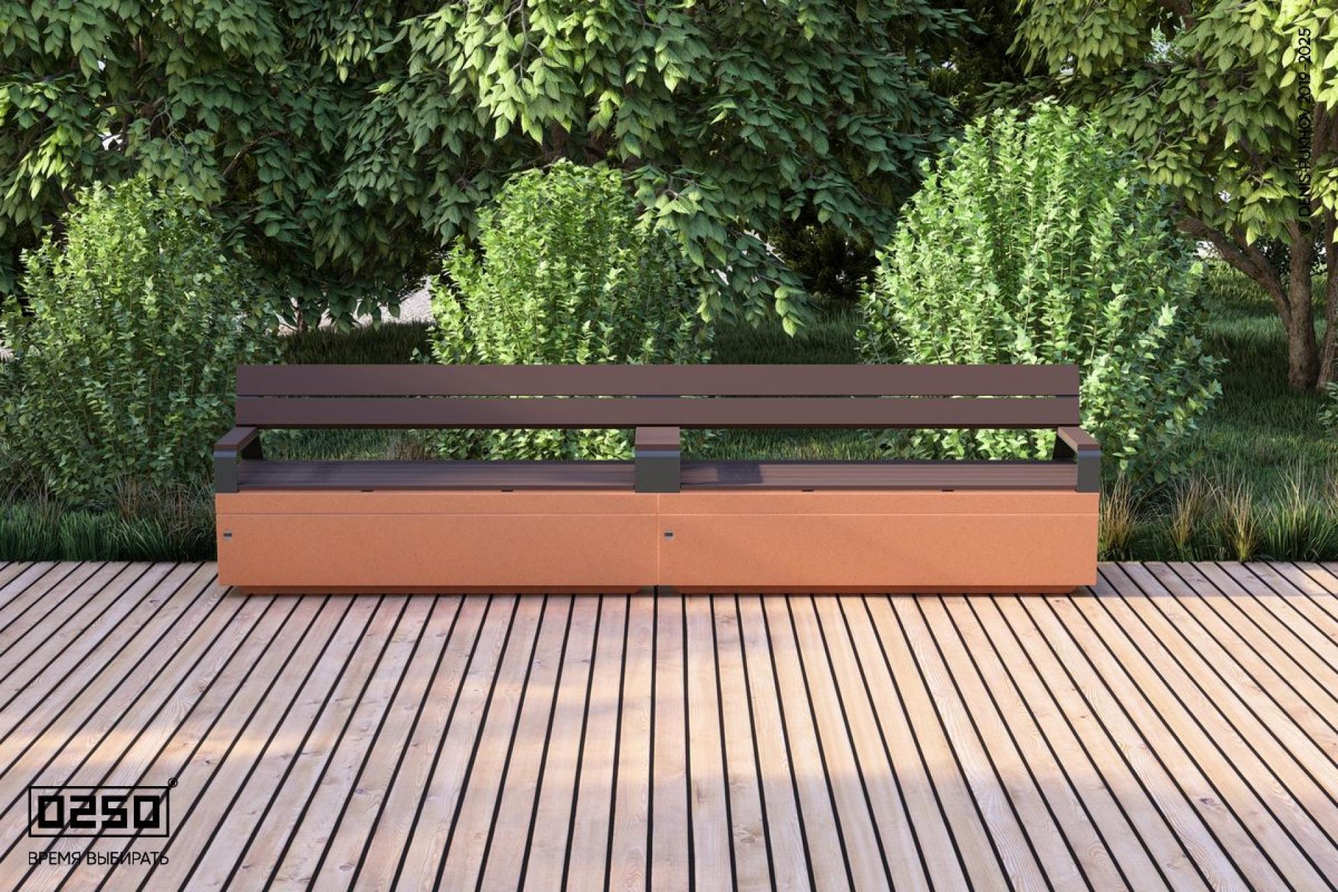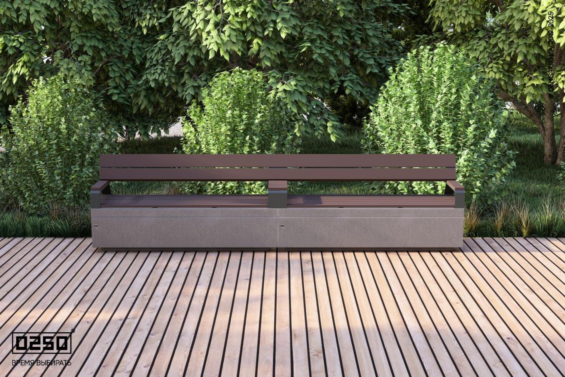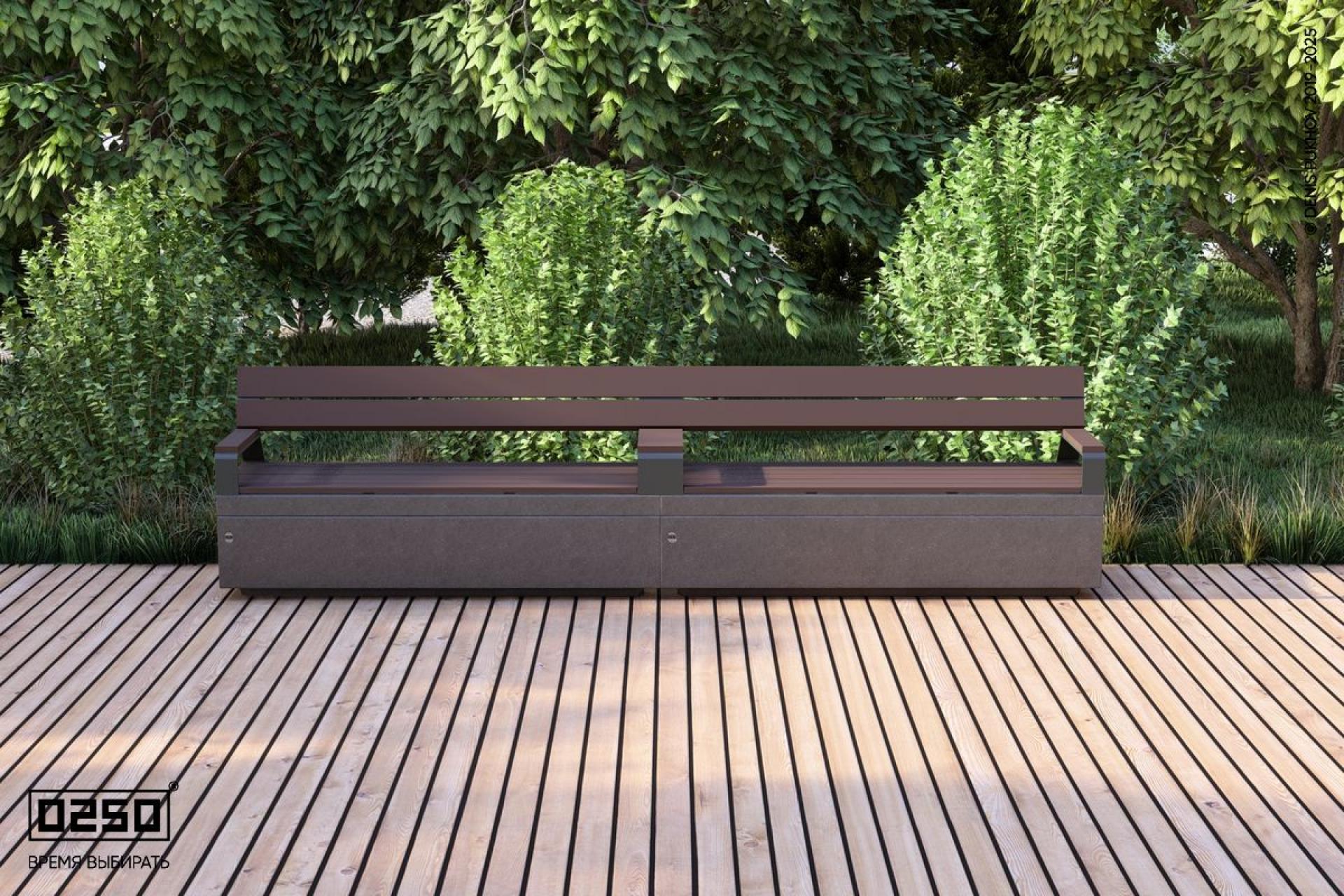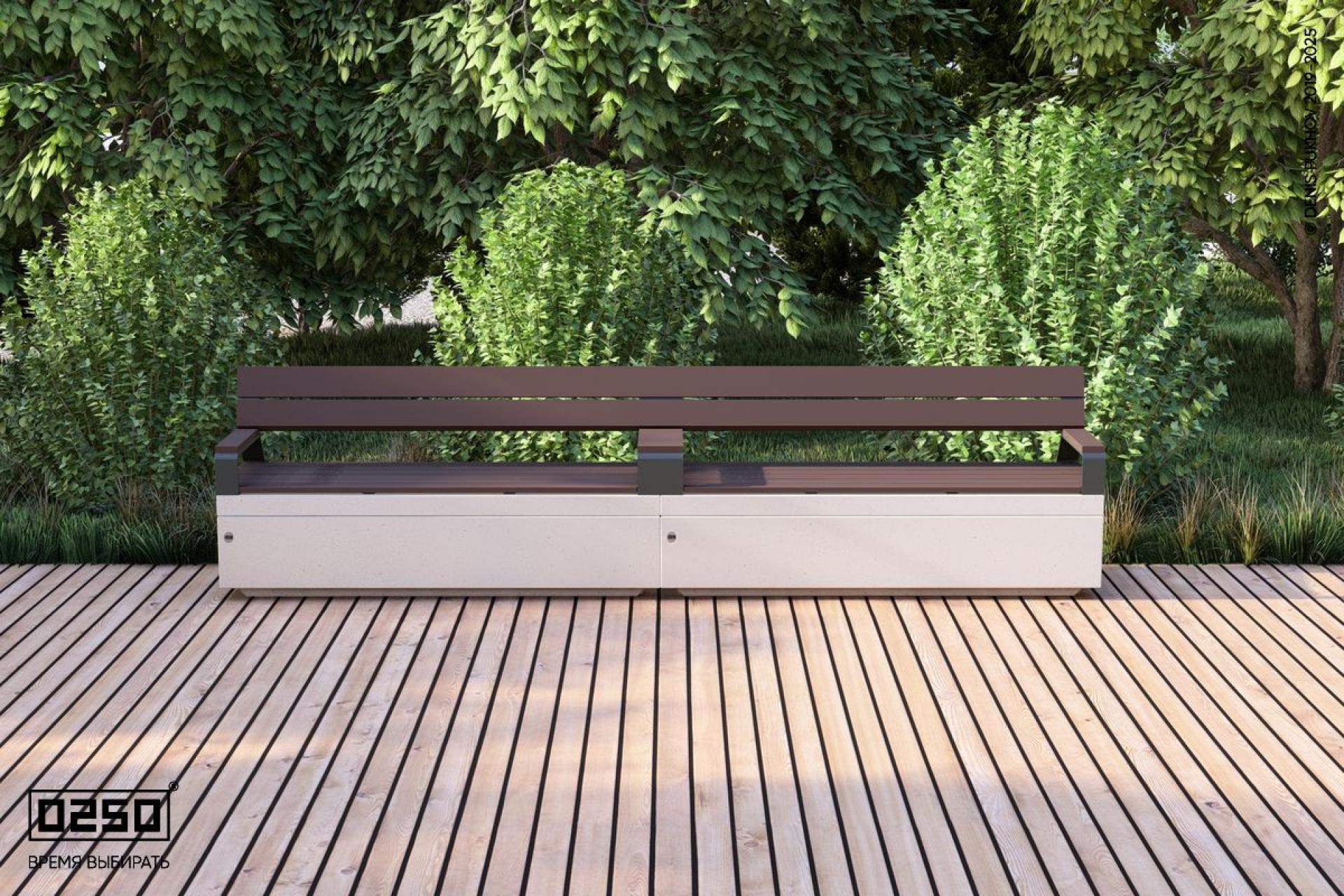 - Материалы скамейки: Скамейка из бетона металла и древесины (полированный ультра-прочный UHPС бетон 6 — цветов, полимеризованный алюминий цвет RAL - 7016 , уф-защищенная термодревесина темного цвета