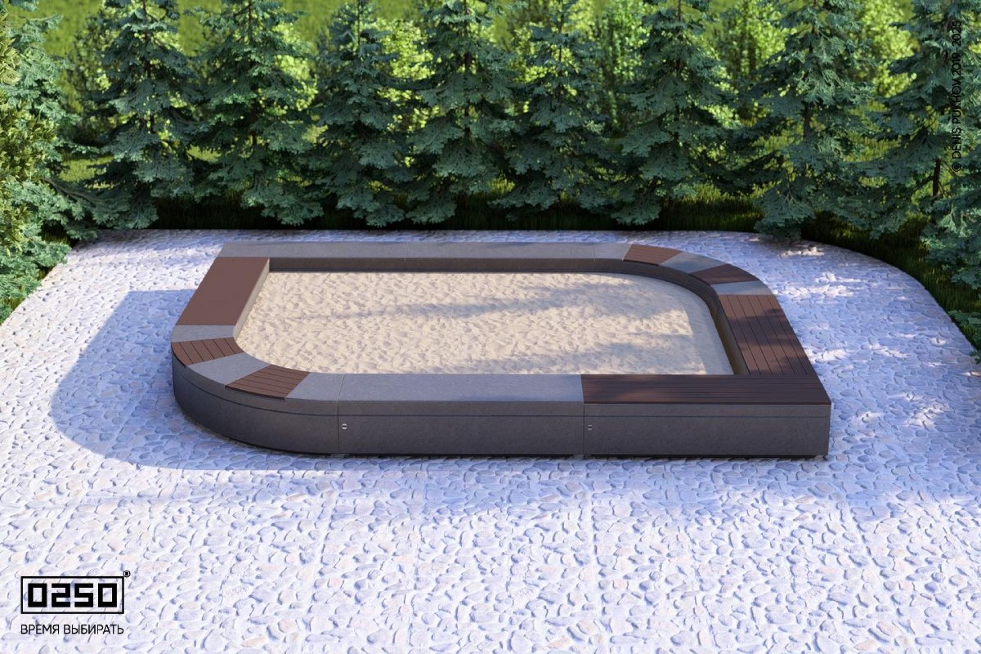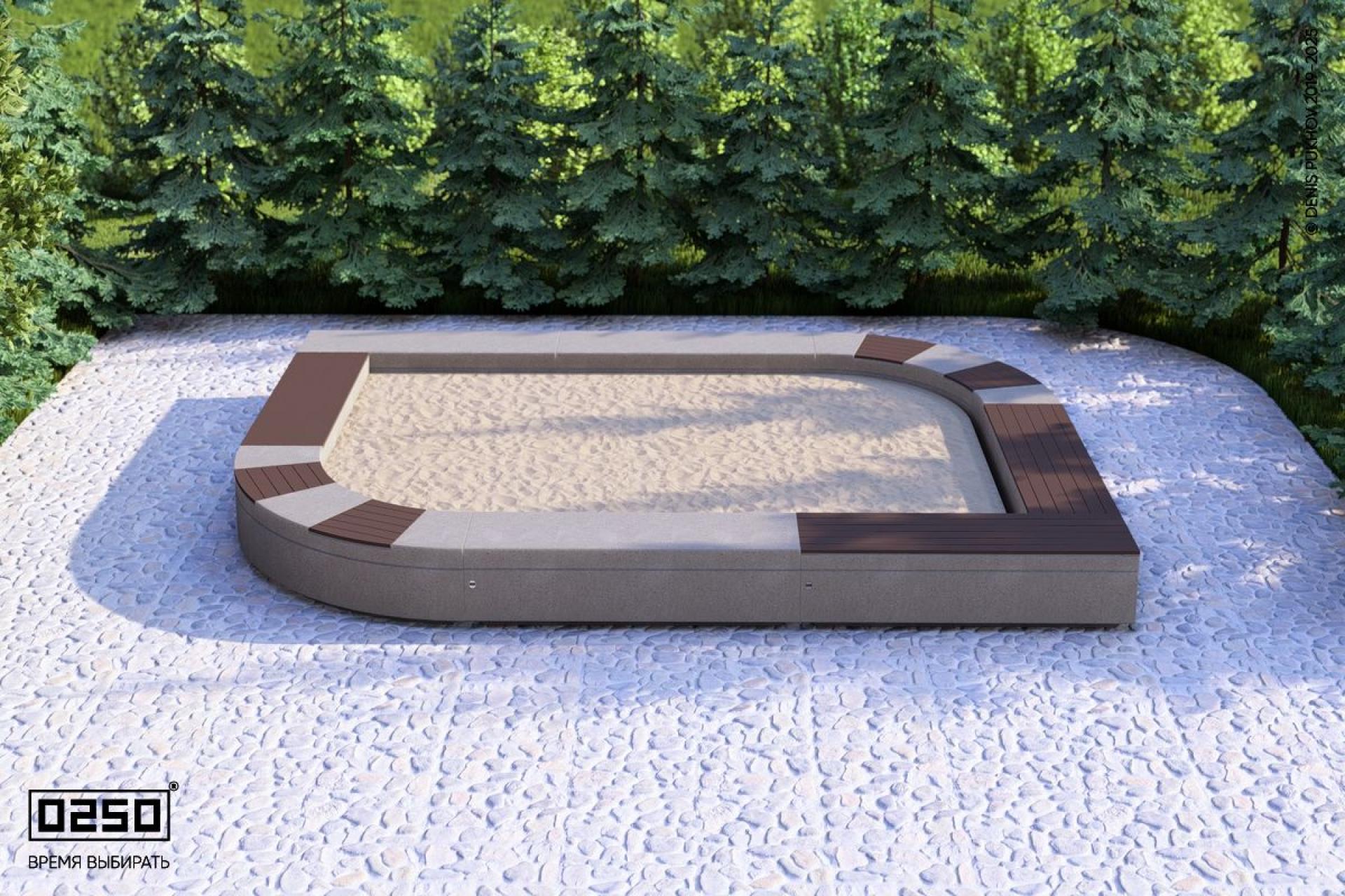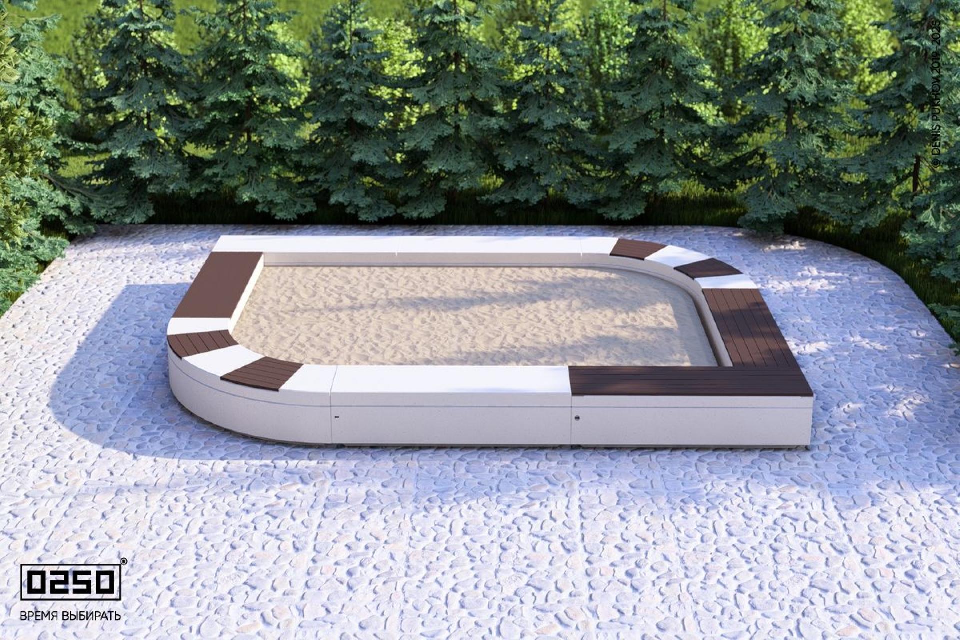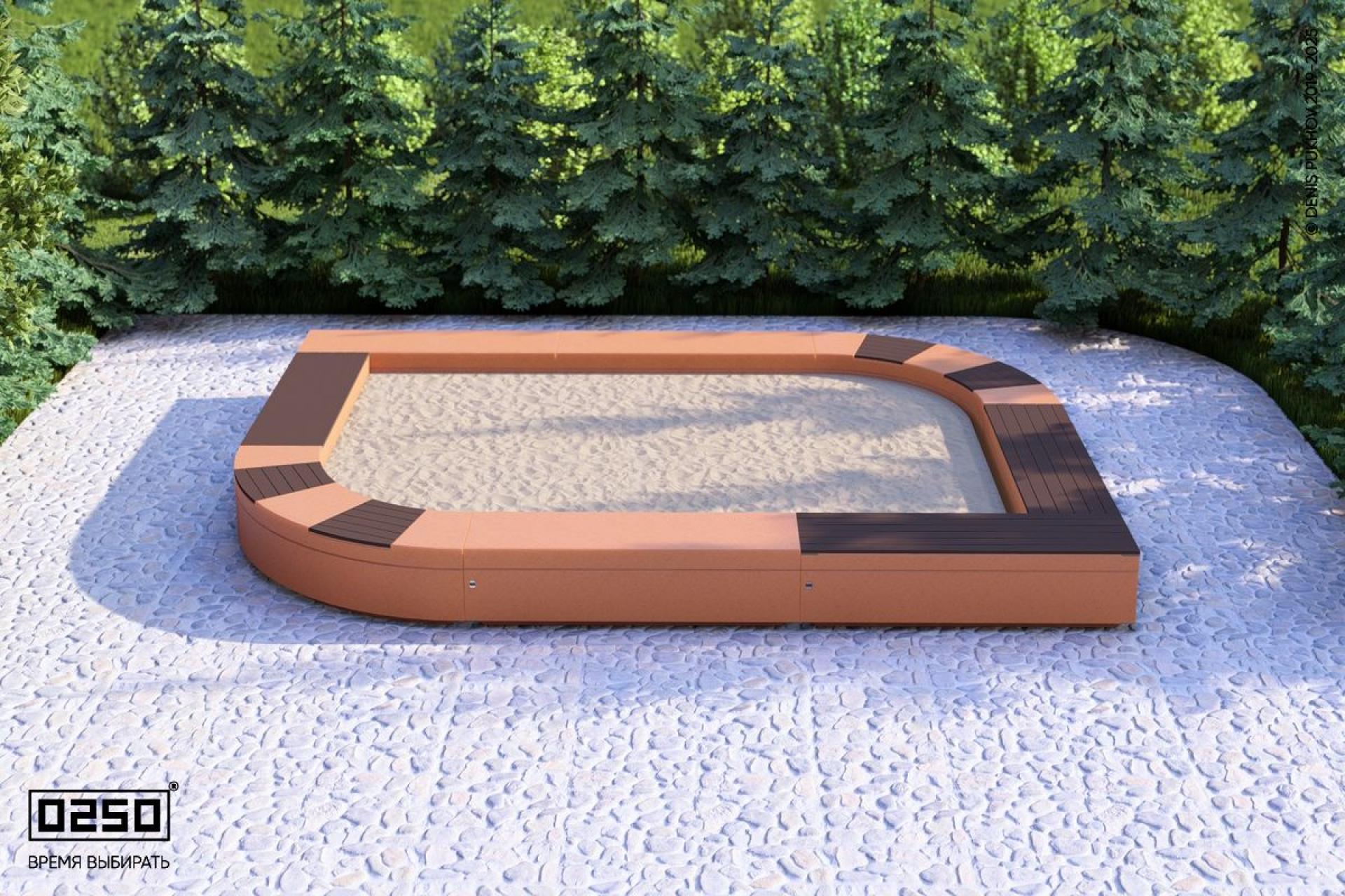 - Описание: Уличная для благоустройства общественных мест. Замкнутая модульная на блоке внутренне пространство которой заполнено песком, предназначенным для игр детей младшего возраста. листообразная Имеет из нескольких типов сидений с настилом из термодревесины и сидений из полированного бетона.
