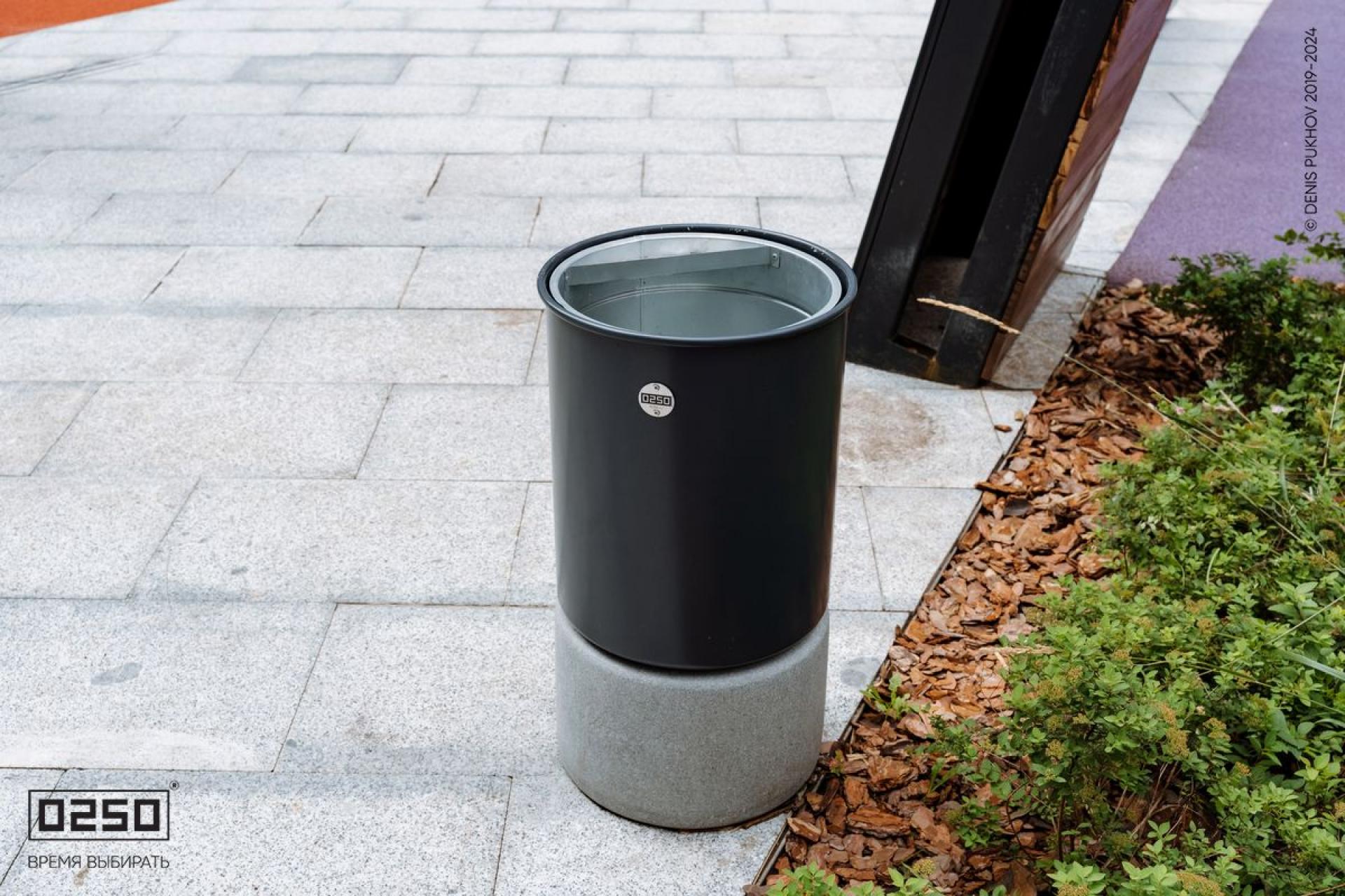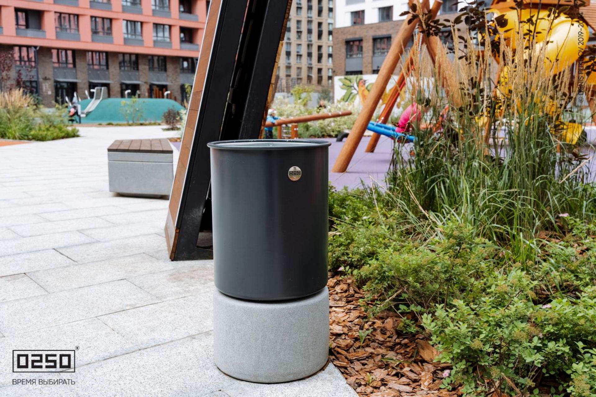 Дизайн урны для мусора соответствует требованиям урбанистики и направлениям современной архитектуры.