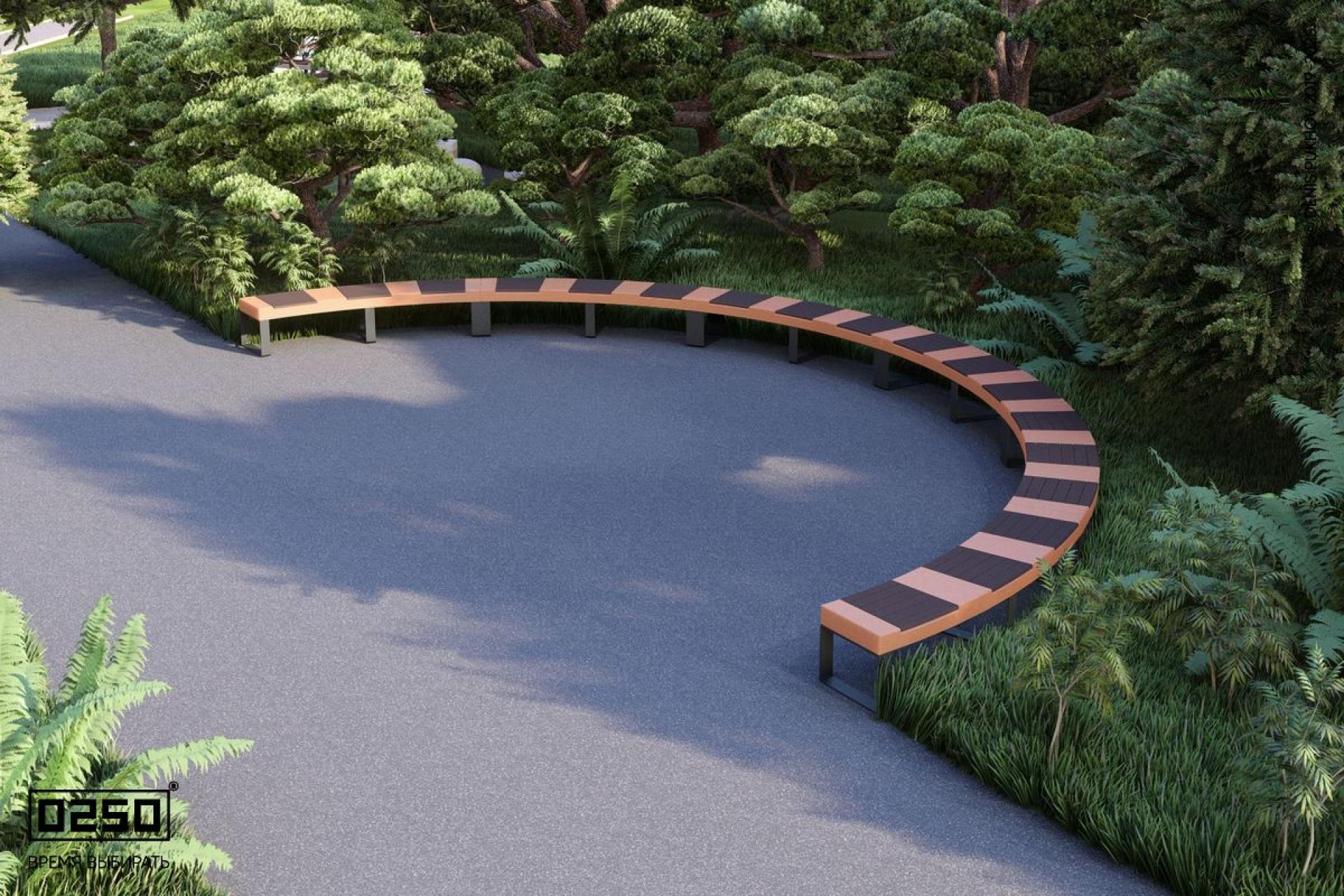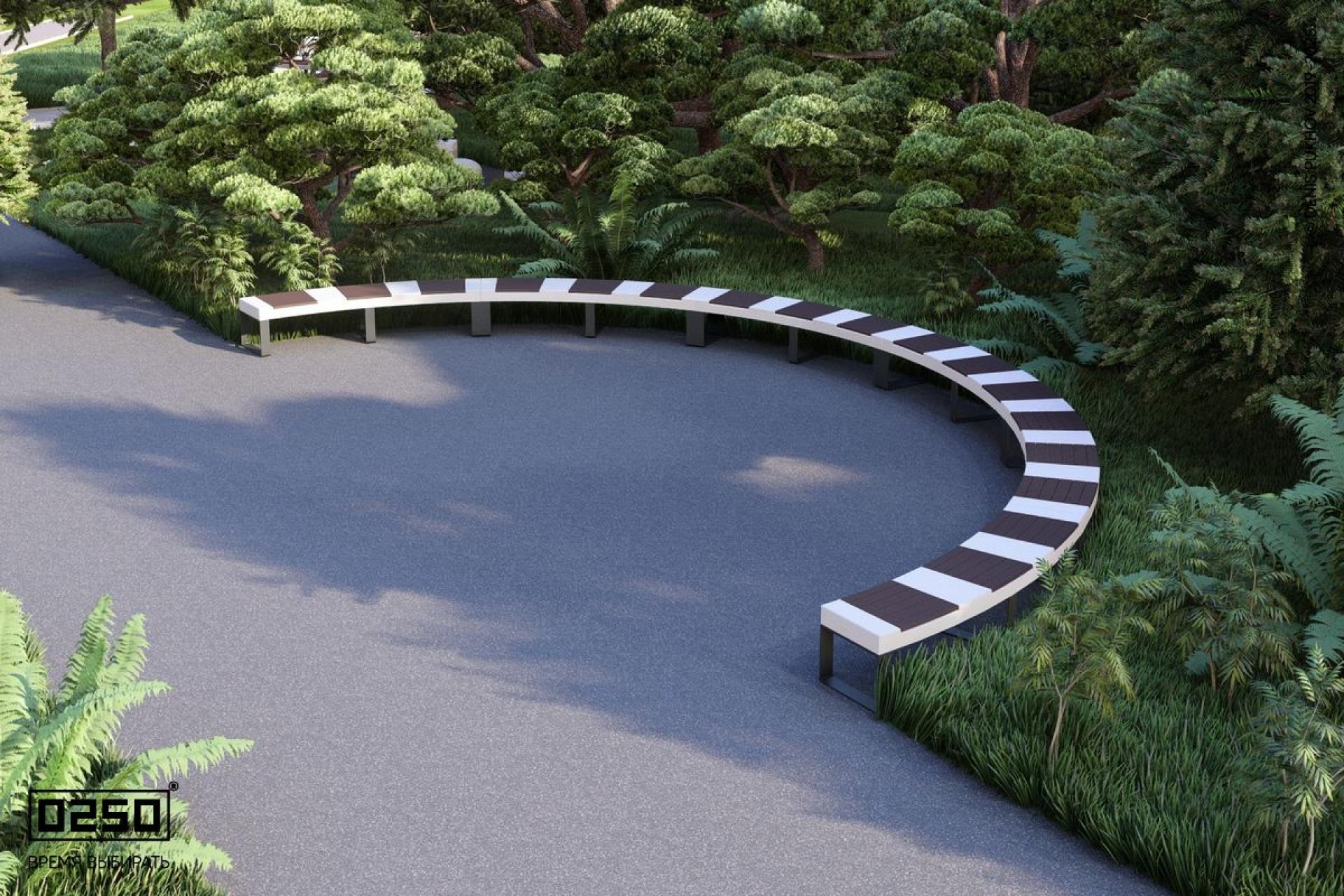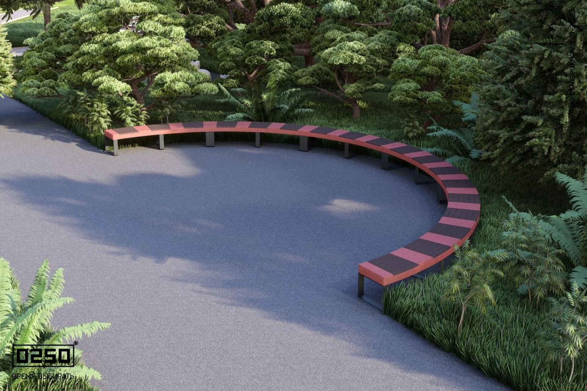 - Описание: Уличная для благоустройства общественных мест. Радиальная модульная форме которой сверху образует полукольцо.(состоит из скамеек Состоит из частей кольца с углом дуги 30 градусов диаметром 10 метров.). Состоит из частей кольца с углом дуги 30 градусов диаметром 10 метров. Опора на ножках из полимеризированного алюминия.