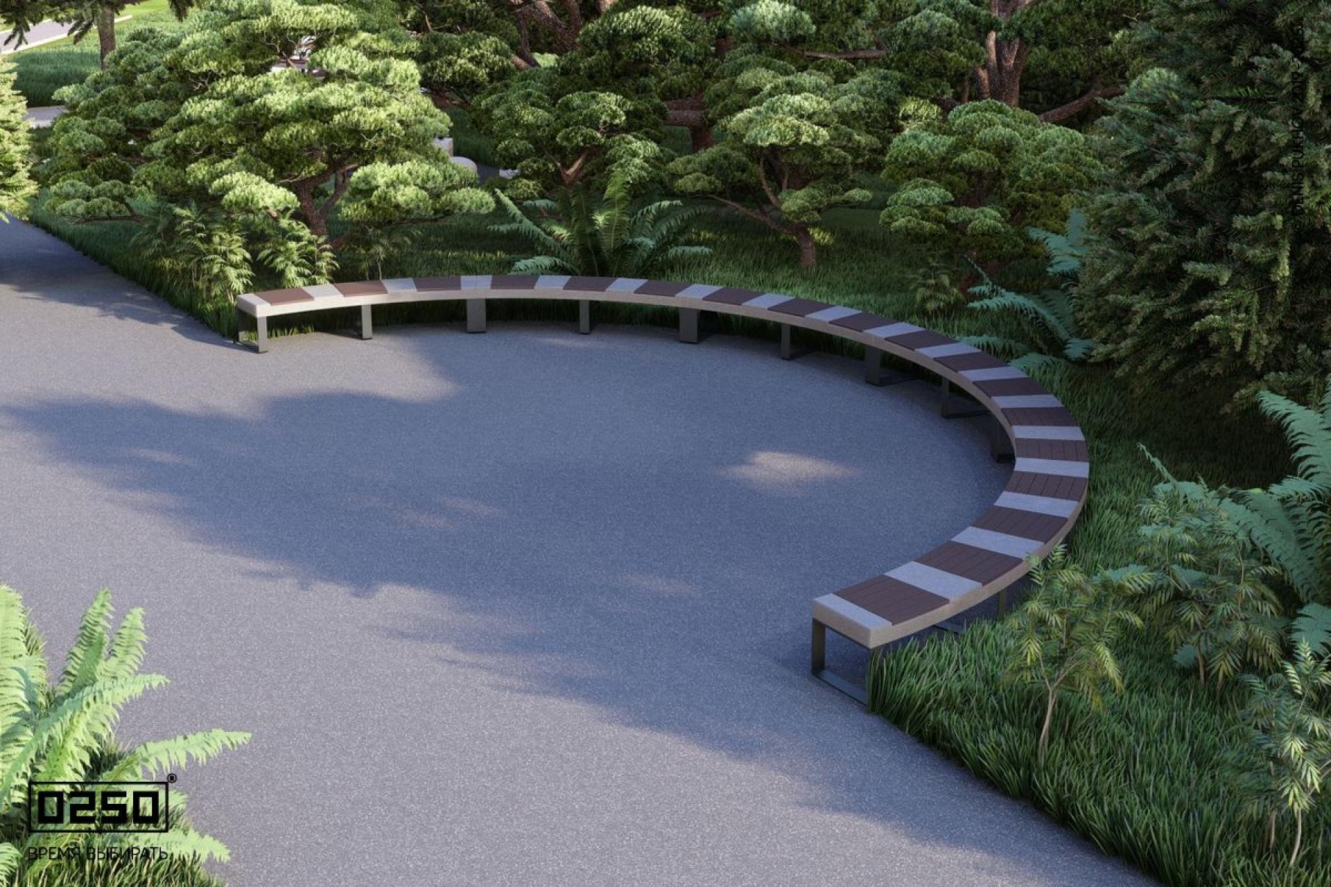 - Состав модулей: Бетонная скамейка большого радиуса на ножках с настилом — 6 шт.