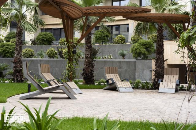 Зона у бассейна оборудована стильными шезлонгами, на которых жители смогут с комфортом загорать или просто наслаждаться видами. В отличии от переносных аналогов, шезлонги производства 0250 из ультрабетона и термодревесины работают на имидж гостиничного комплекса, выглядят дорого и дольше сохраняют первоначальный вид.