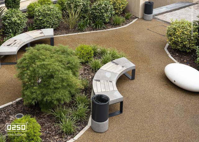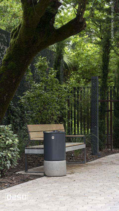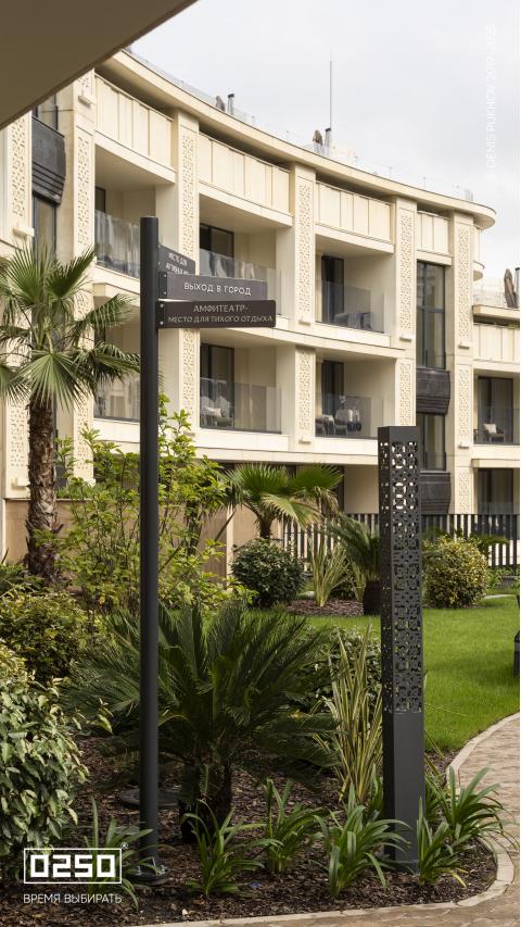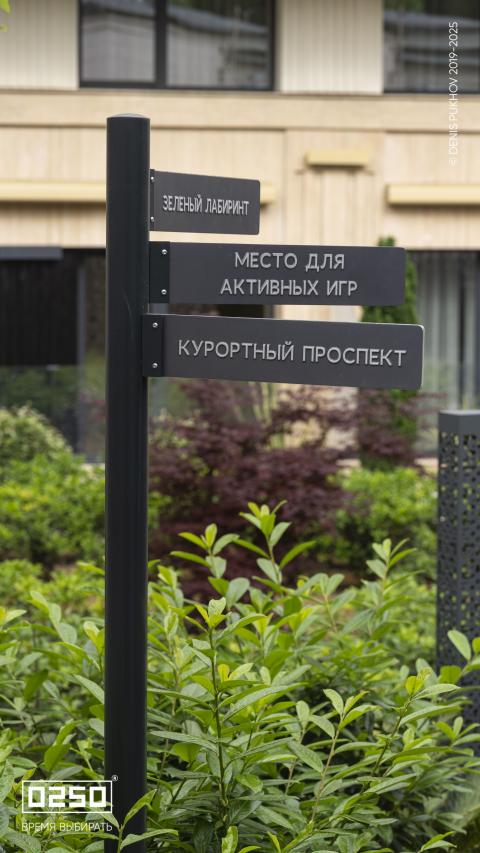 Прямые и радиальные скамьи создают точечные зоны отдыха и общения, минималистичные удобные урны помогают поддерживать чистоту, а уличные указатели – не заблудиться в инфраструктуре комплекса.