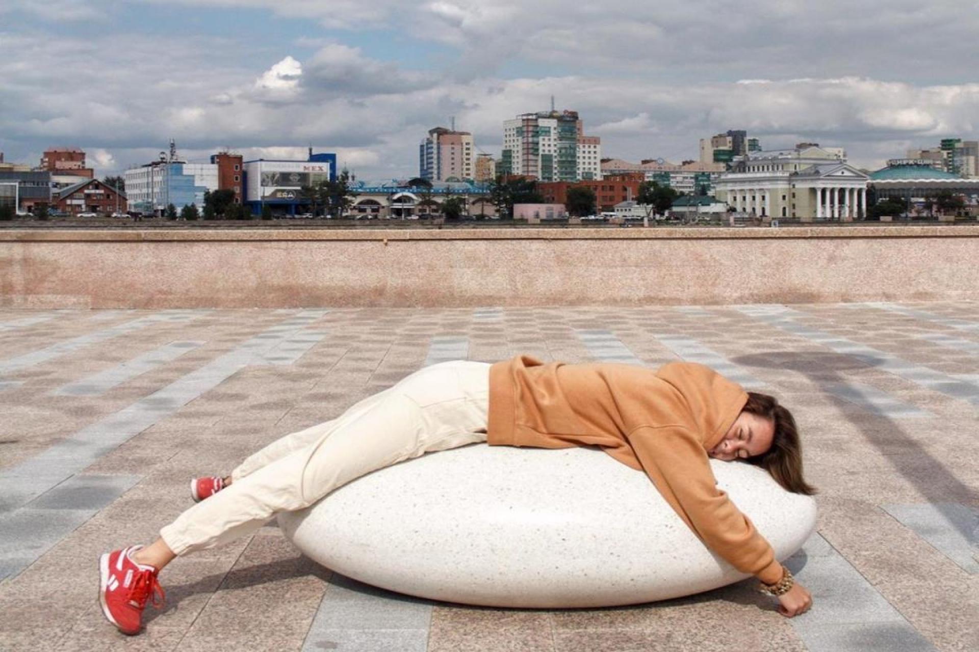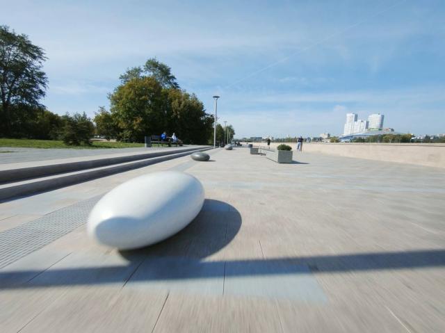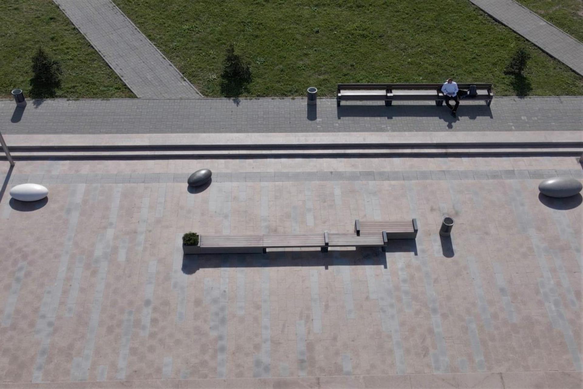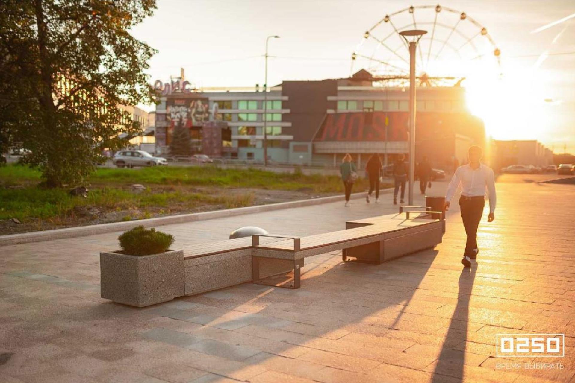 Для этого решили привлечь внимание с помощью необычных конструкций из модульных скамей и арт-объектов. На протяжении всей набережной расположили 5 композиций из скамей, вазонов и арт-объектов Камень Времени и урны.