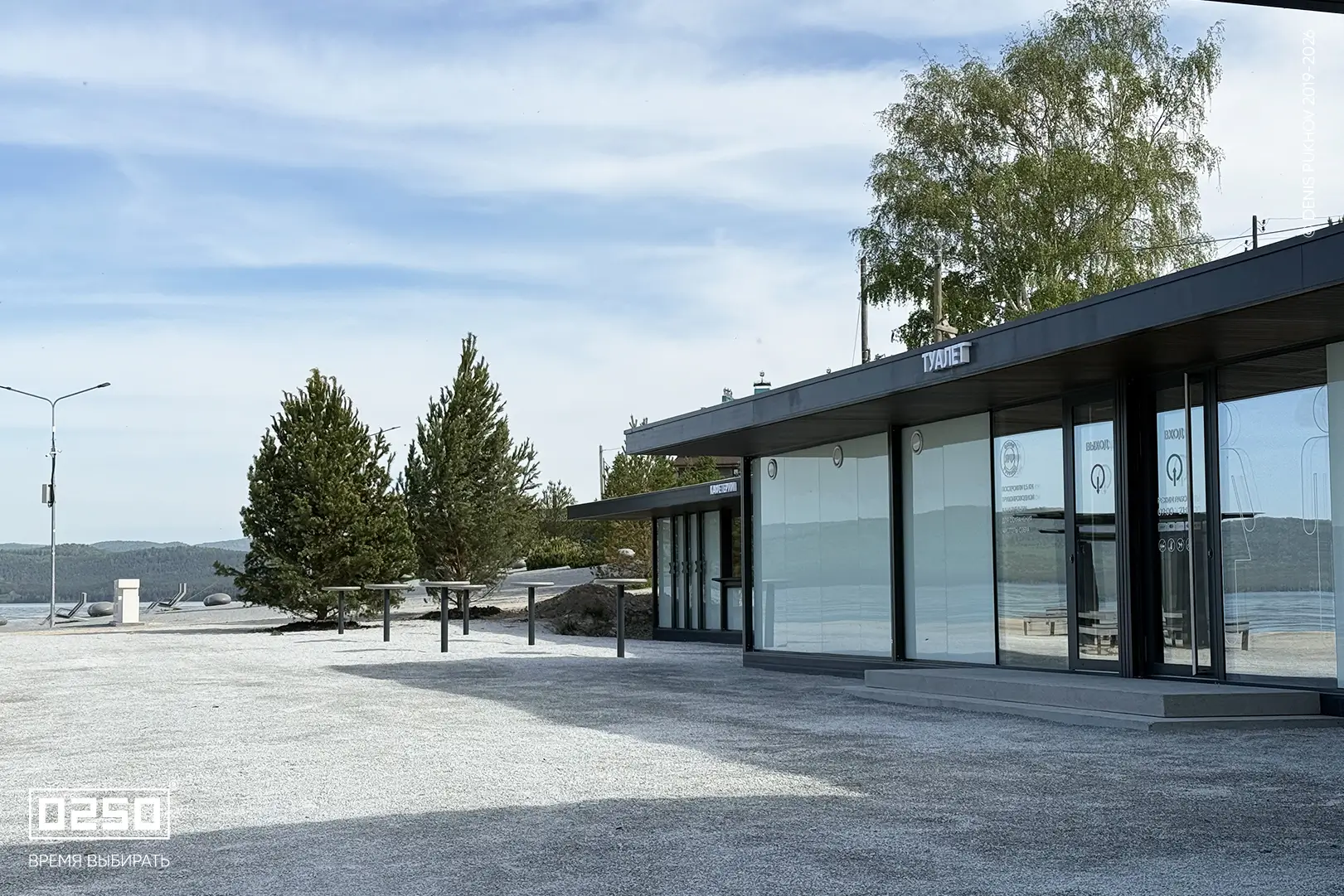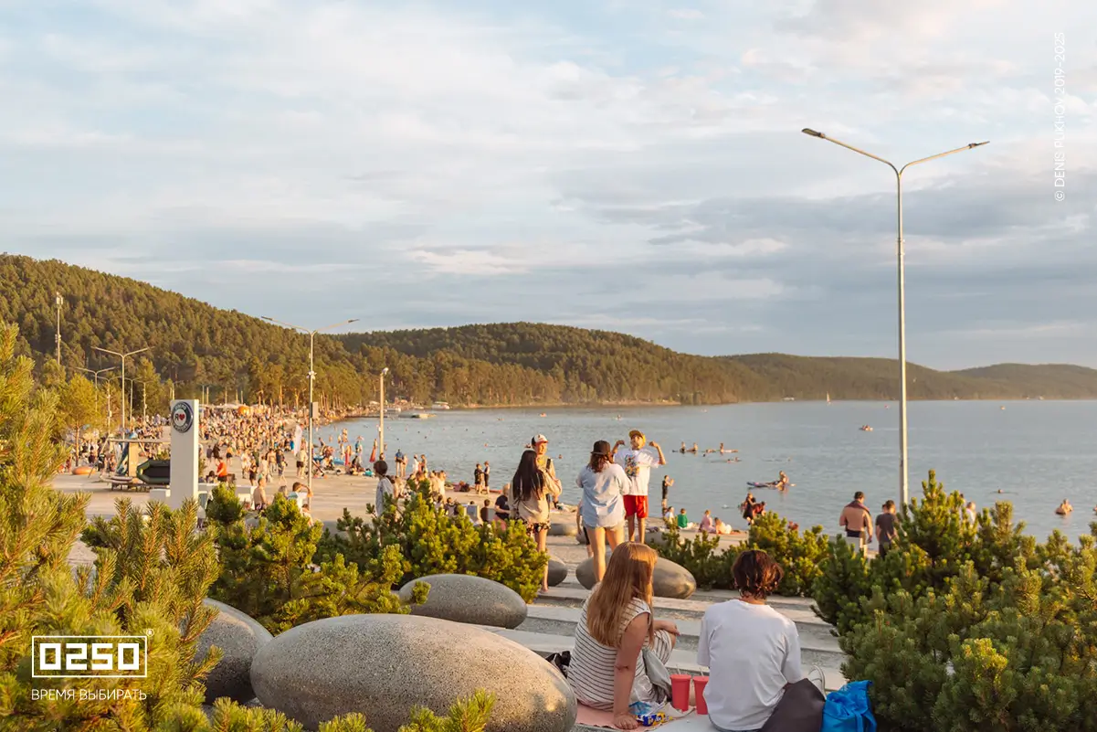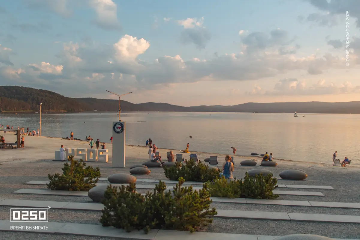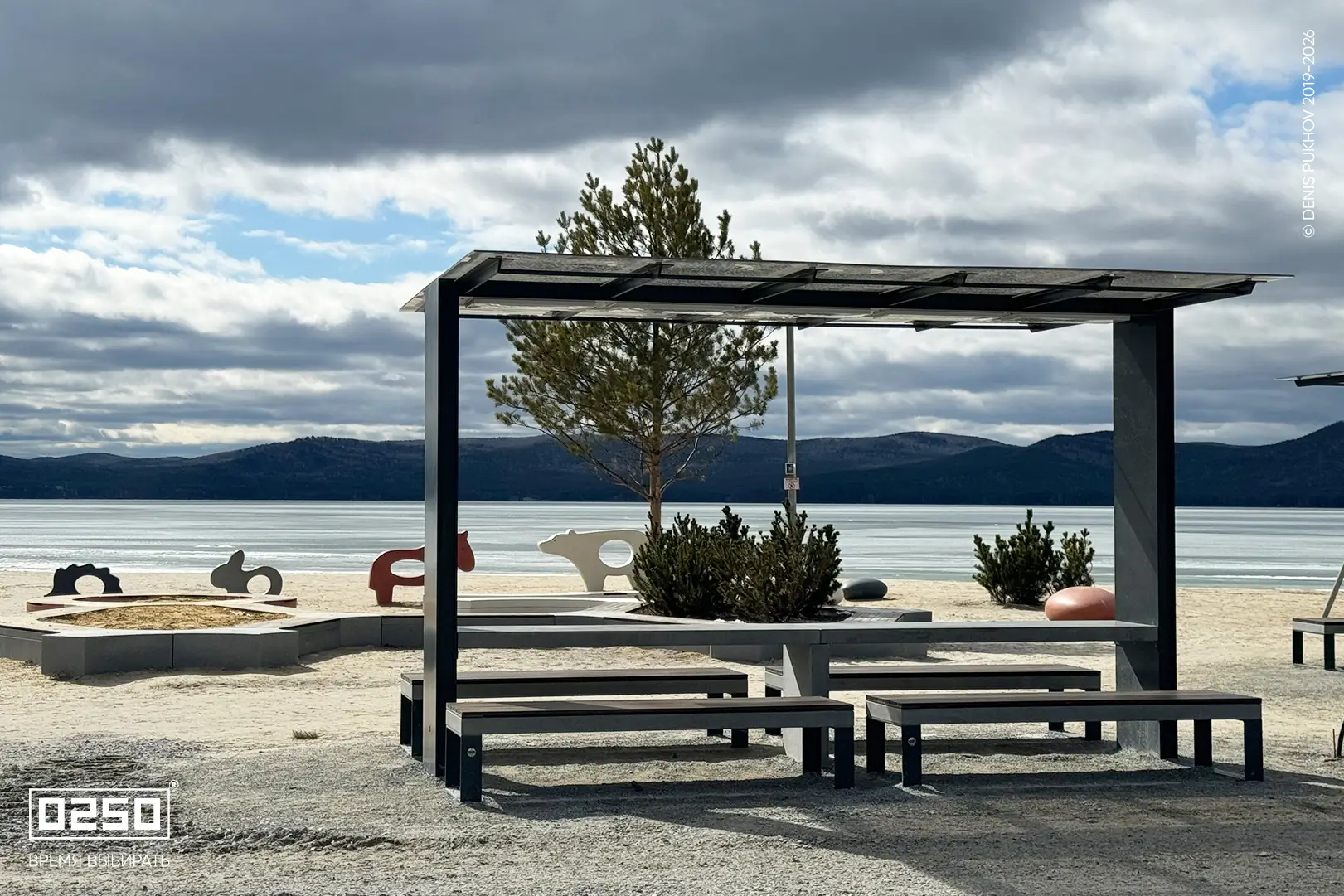 Пляж благоустроили большими ступенями из архитектурного бетона. Фактуры и оттенки объектов эстетично сочетаются с местными горными склонами и водной гладью Тургояка. Так мы сформировали основу будущего общественного пространства.
