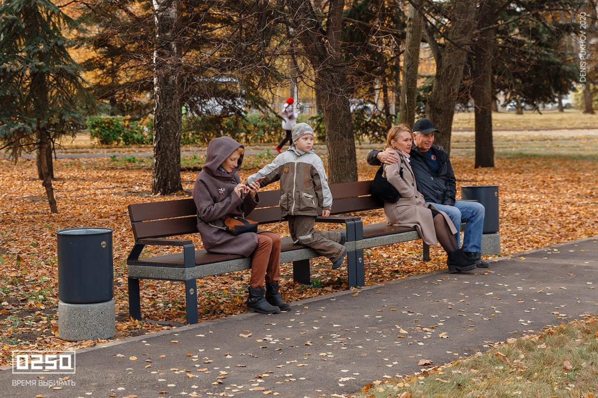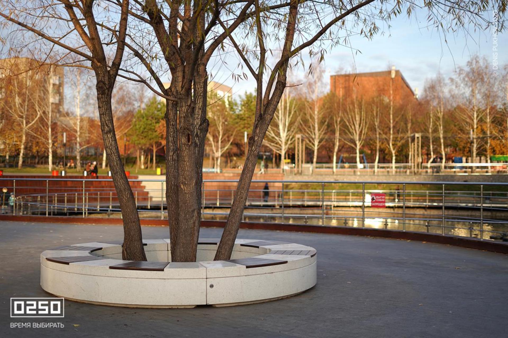 При выборе скамеек придерживались принципа заботы о тех, кто будет на них сидеть: так рядом с детскими площадками появились скамейки со спинками и подлокотниками, на которых родителям удобно ждать, пока наиграются их детки. В других частях парка скамейки комбинированные — это обеспечивает визуальное разнообразие пространства.
