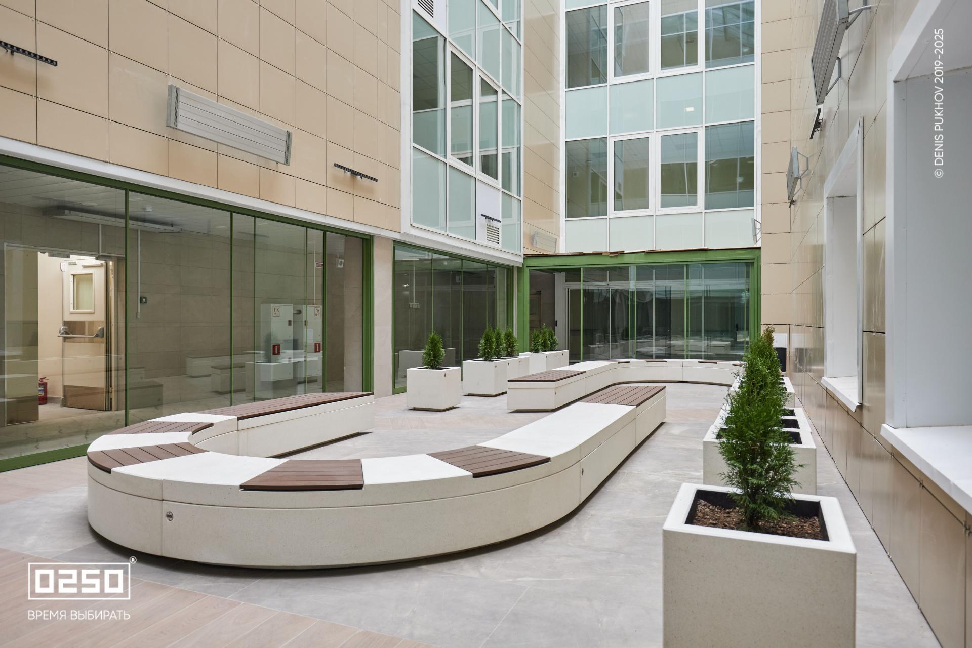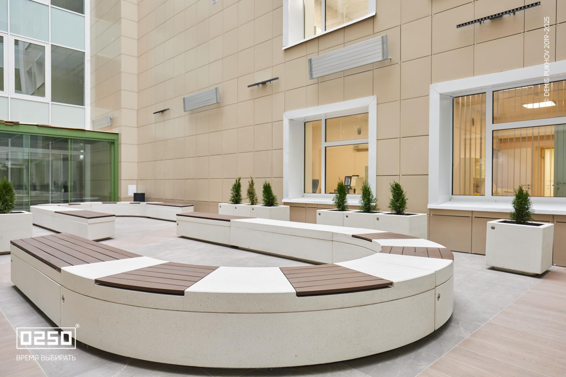 Здесь – стильная модульная сборка из бетонных скамей на блоке. На них сотрудники и пациенты могут разместиться для отдыха и беседы. Белоснежная фактура ультрабетона идеально вписывается в интерьер и поддерживает общий визуальный стиль центра. Не стоит пугаться белого цвета – полированный ультрабетон прост в уходе и легко очищается, сохраняя свежесть цвета на долгие годы.