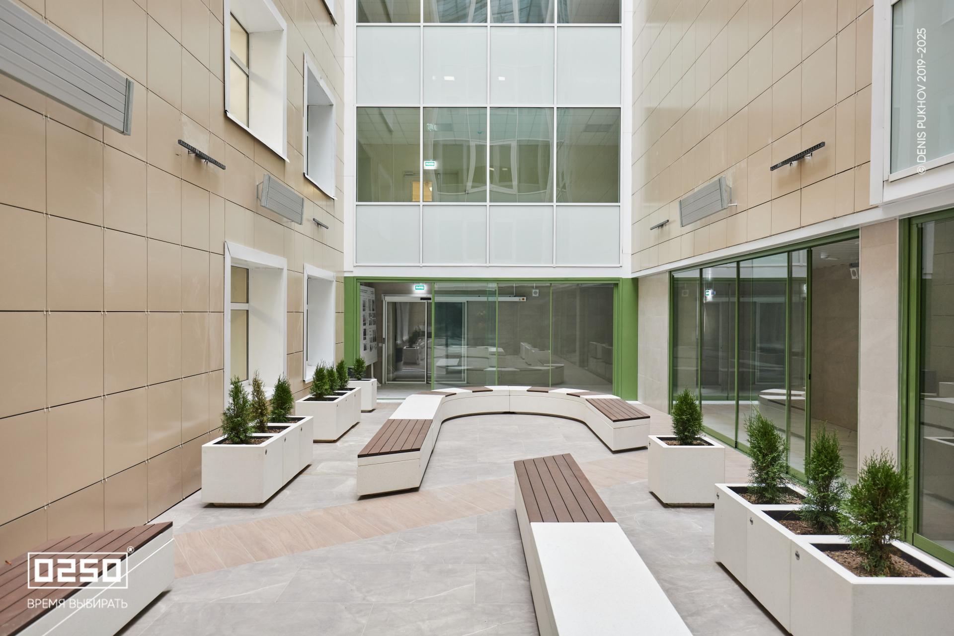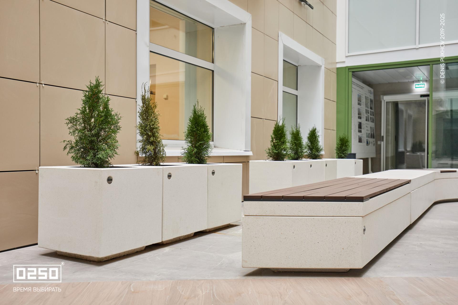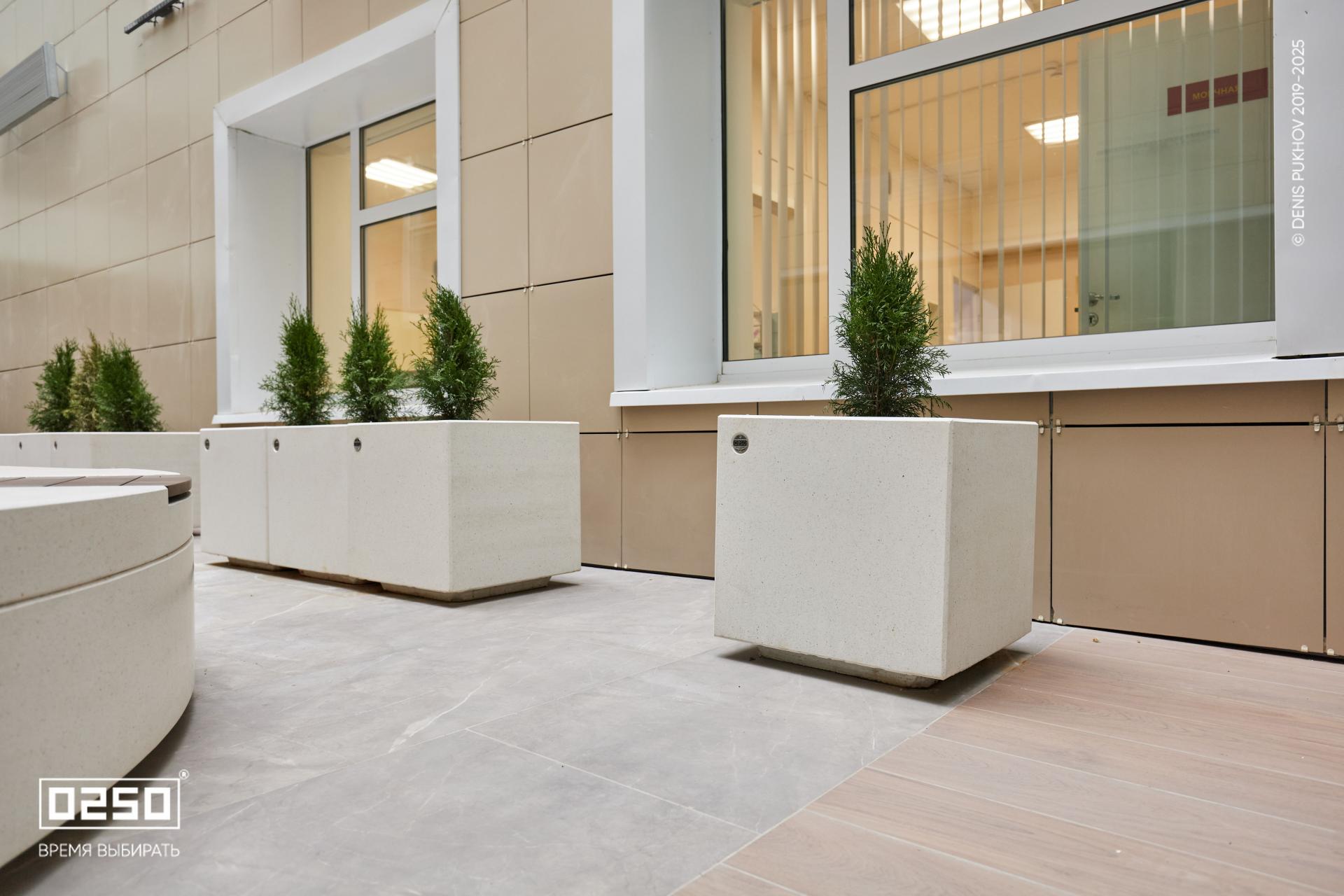 Для создания атмосферы и возможности контактировать с природой даже в стенах центра – вазоны КУБЭ с вечнозелеными хвойными растениями. Для поддержания идеальной чистоты рядом установлены современные урны УРБАН-2.