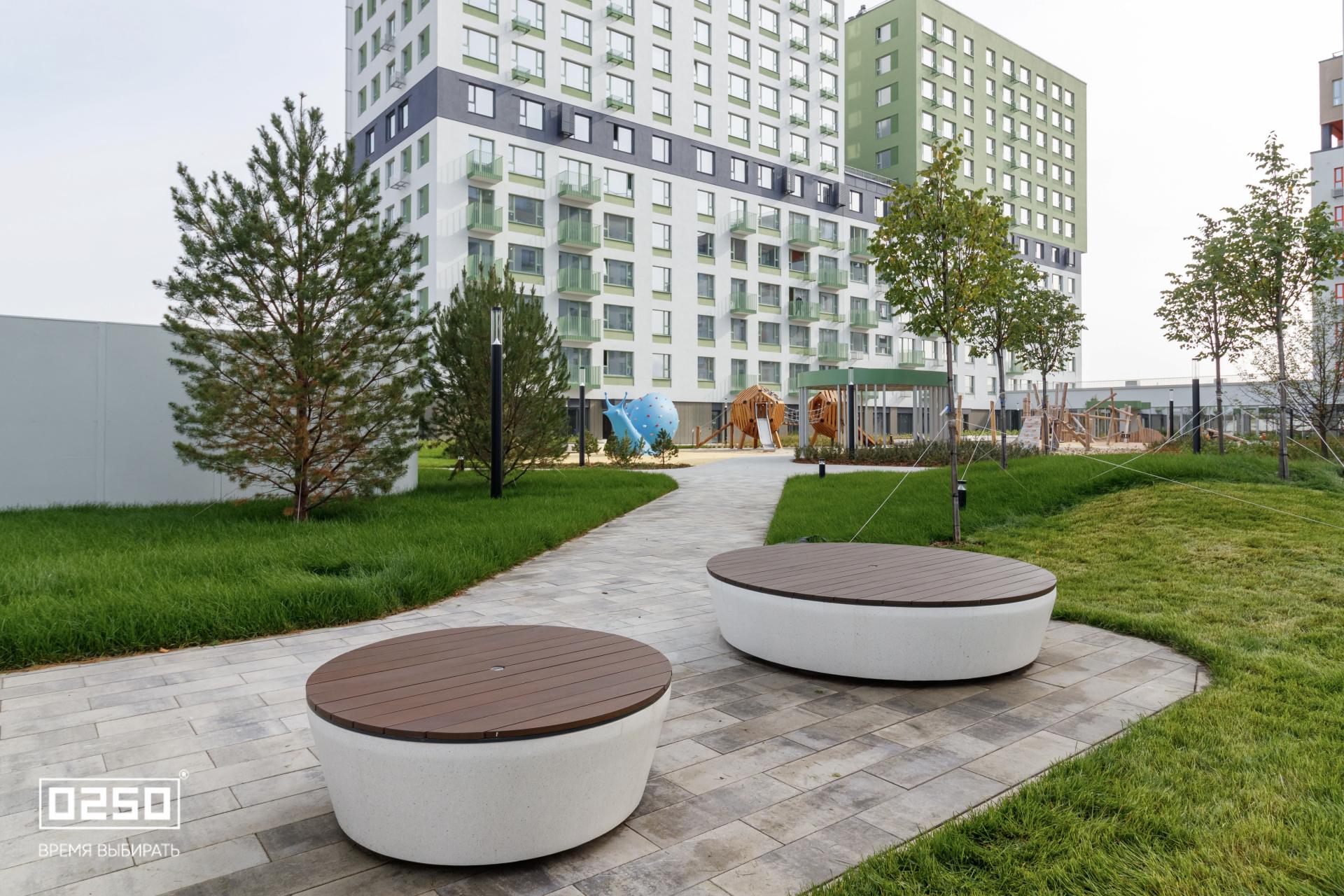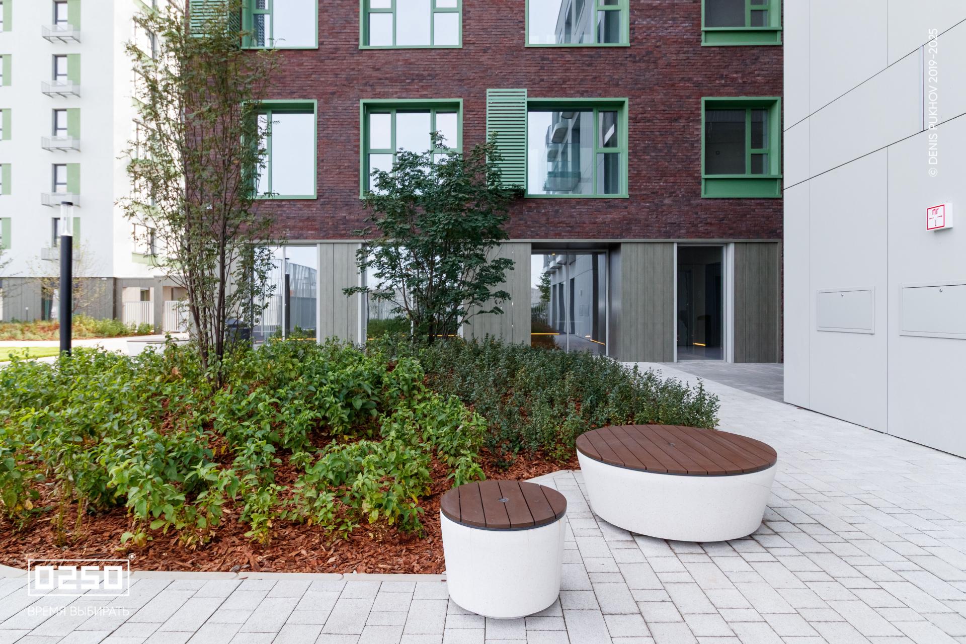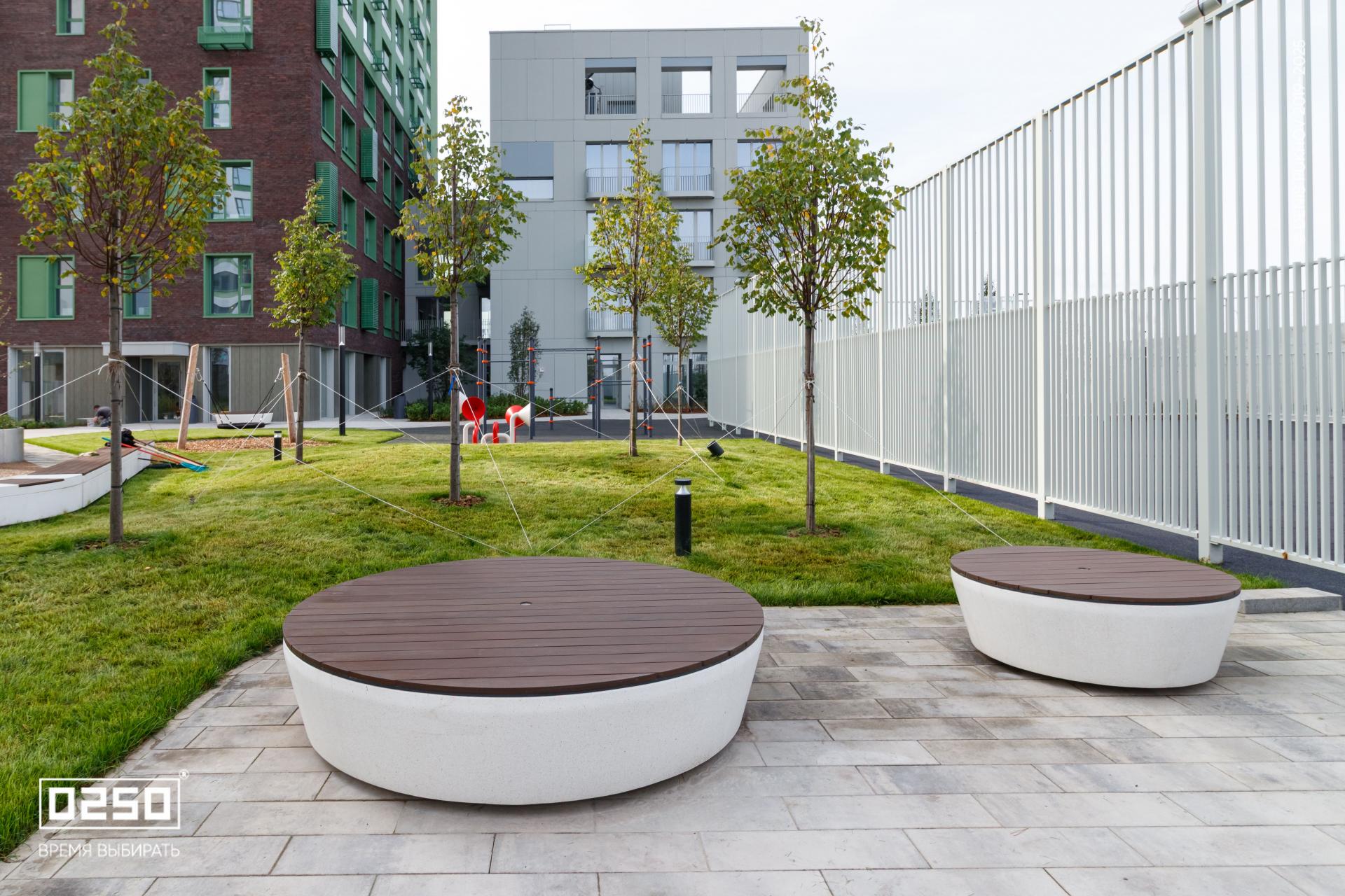 Круглые скамьи Шайбы идеальны для быстрой передышки на прогулке или для детей во время активных игр. Они органично вписались в уникальный стиль ЖК, не разрывая архитектурно-пространственную среду.