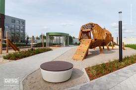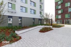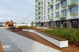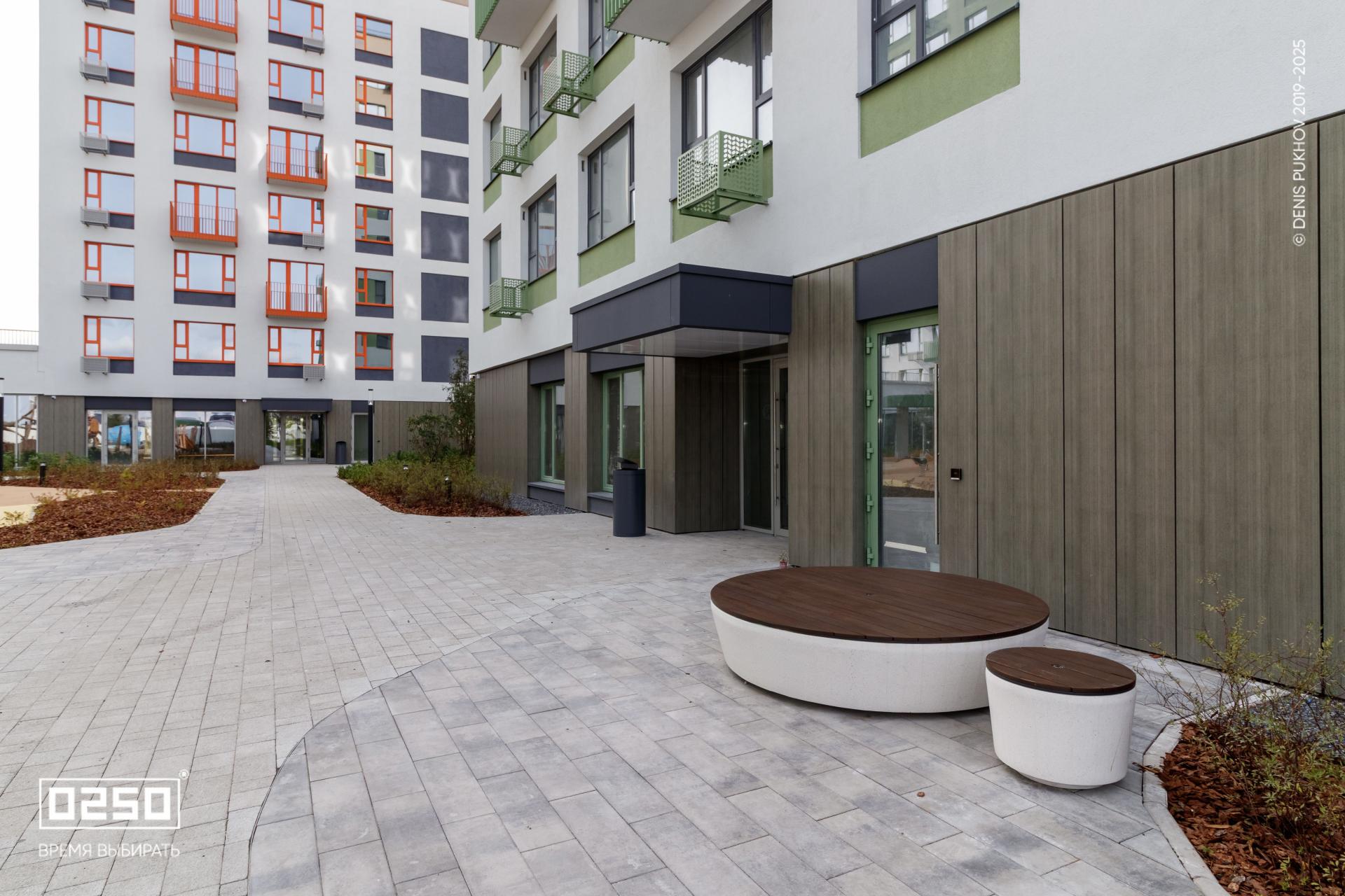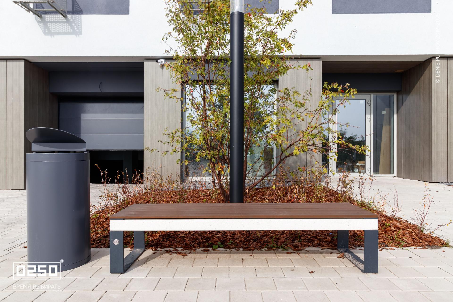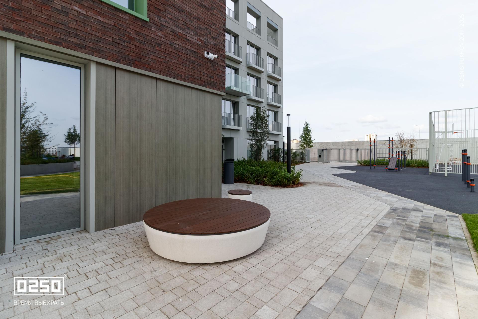 Круглые скамьи Шайбы идеальны для быстрой передышки на прогулке или для детей во время активных игр. Они органично вписались в уникальный стиль ЖК, не разрывая архитектурно-пространственную среду.