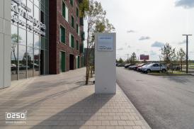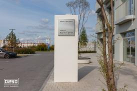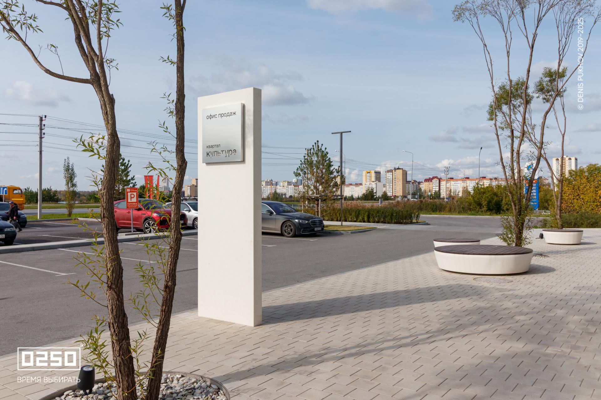 Отдельное внимание уделено оформлению офиса продаж. Ведь именно он создает для покупателя первое впечатление и влияет на общее впечатление от ЖК при обдумывании покупки недвижимости. Рядом с входной группой установили бренд-стелу – сильный инструмент для создания узнаваемого стиля и имиджа.