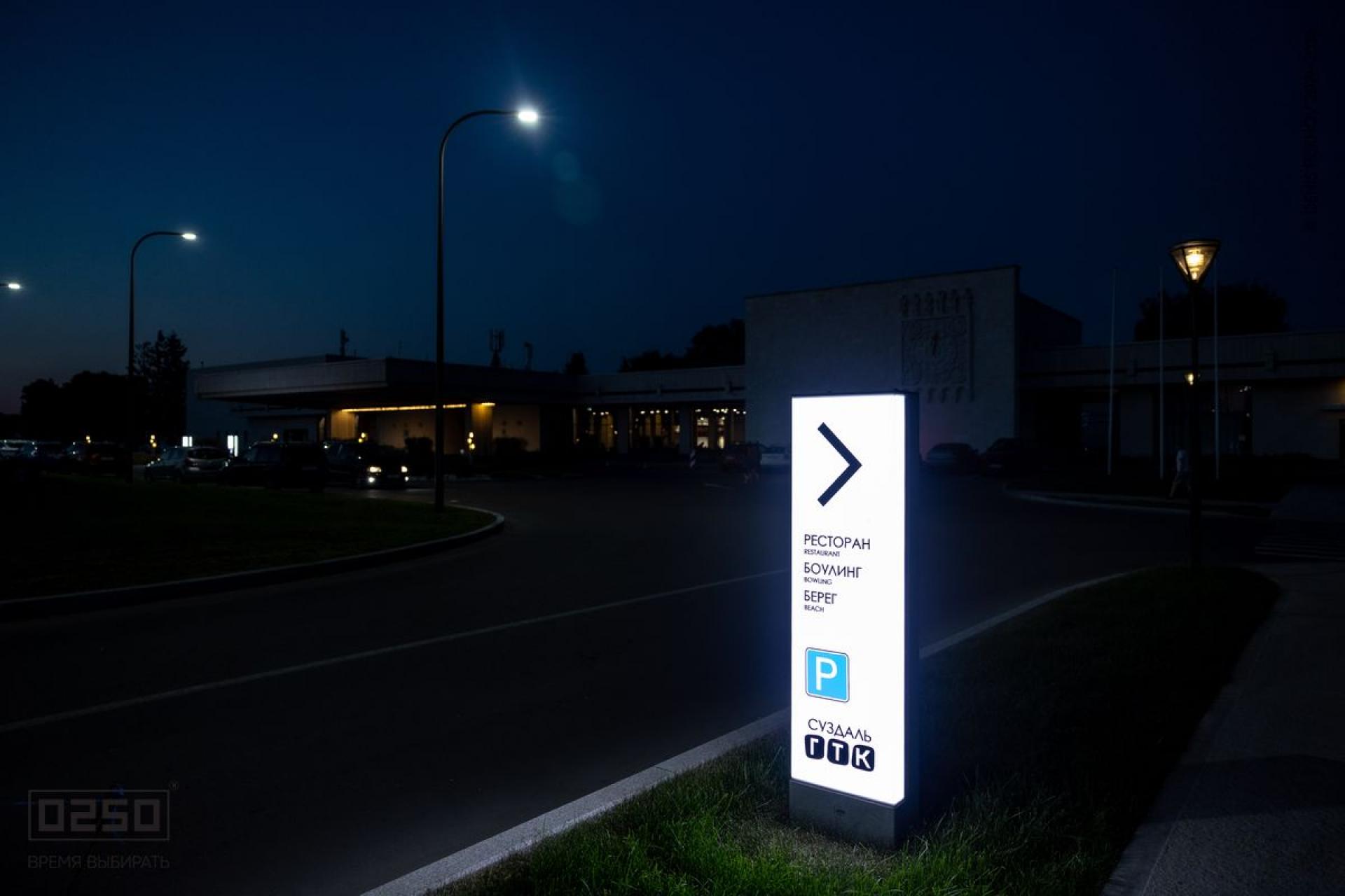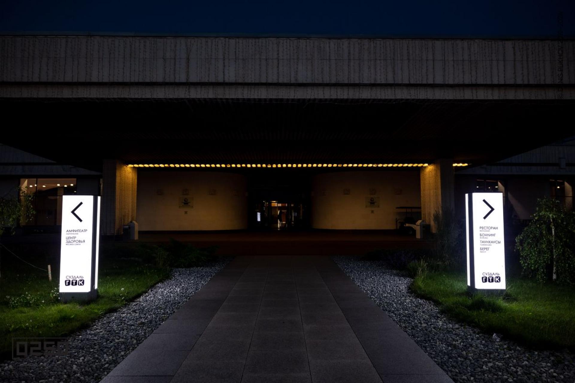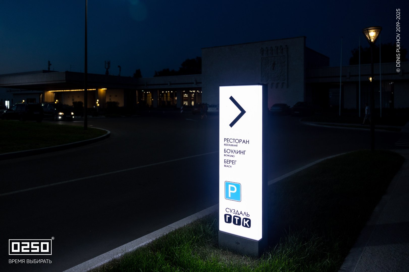 Специально для этого проекта была разработана понятная и эстетичная система навигации — световые указатели Сигна Драйв. На создание этого изделия повлияли особенности локации: Суздаль Арена является местом проведения крупных мероприятий, располагает на своей территории множество объектов (кафе, отель и тд.), работает в тёмное время суток. Посетители Арены — это не только взрослые, но и дети.