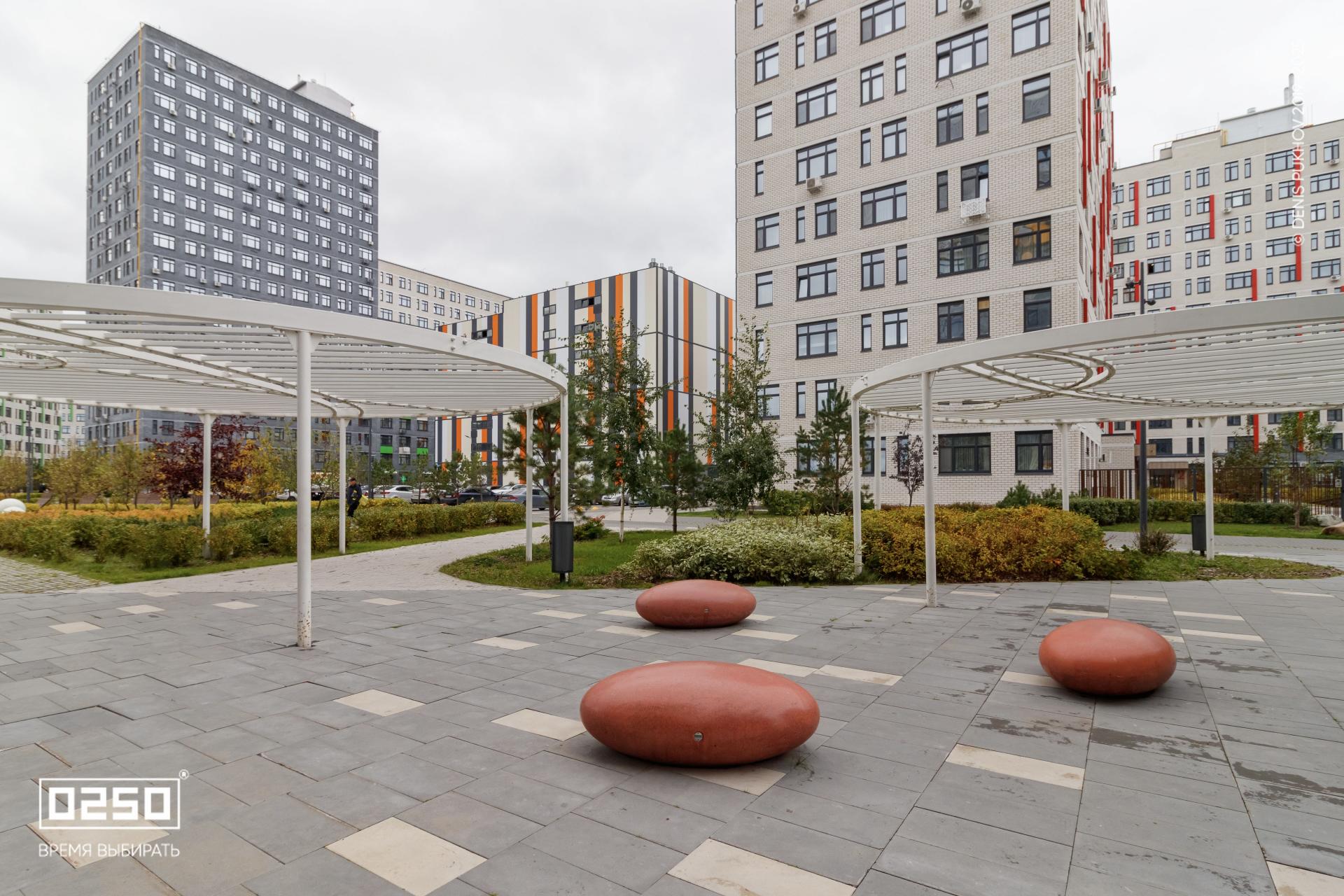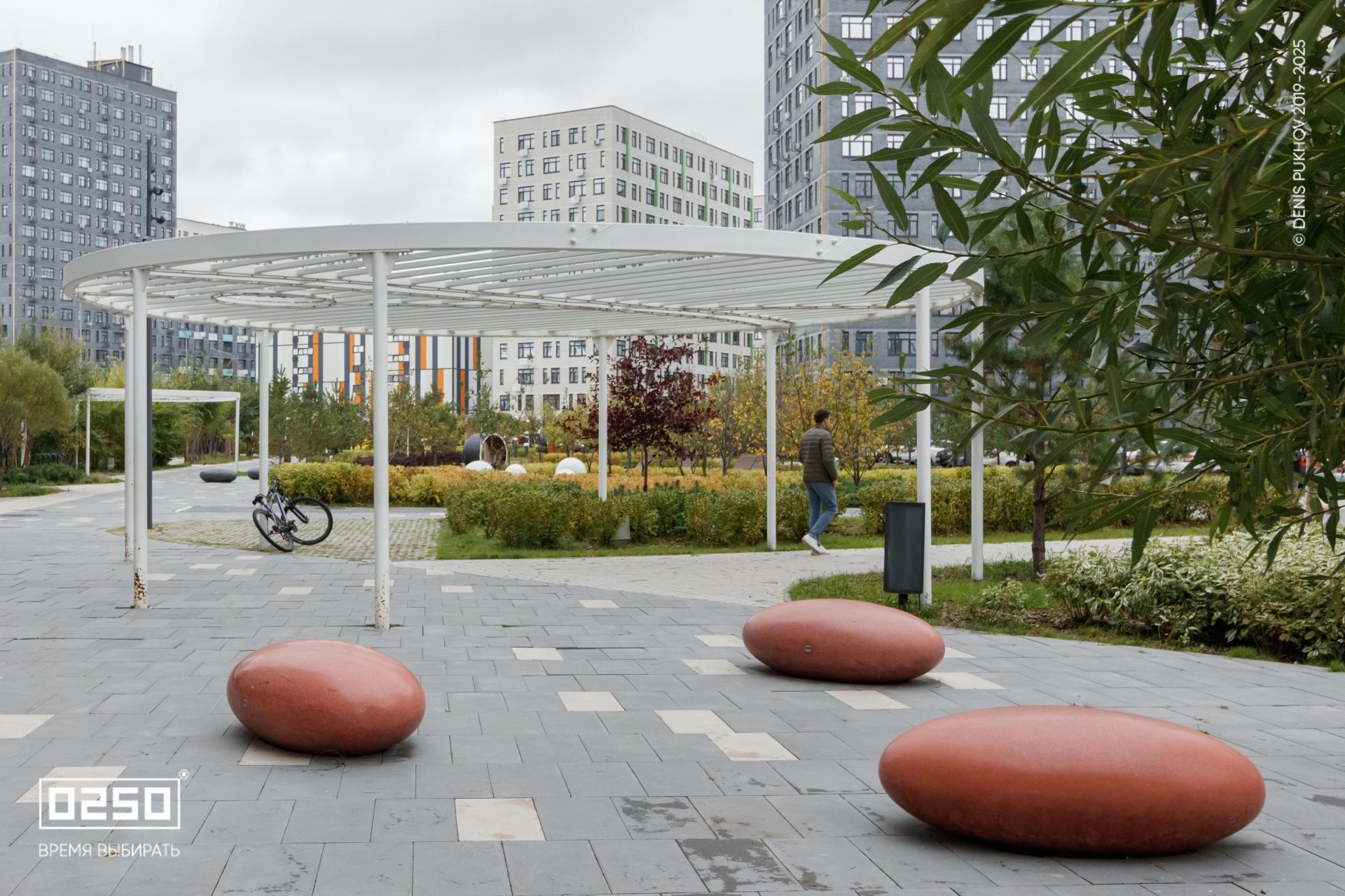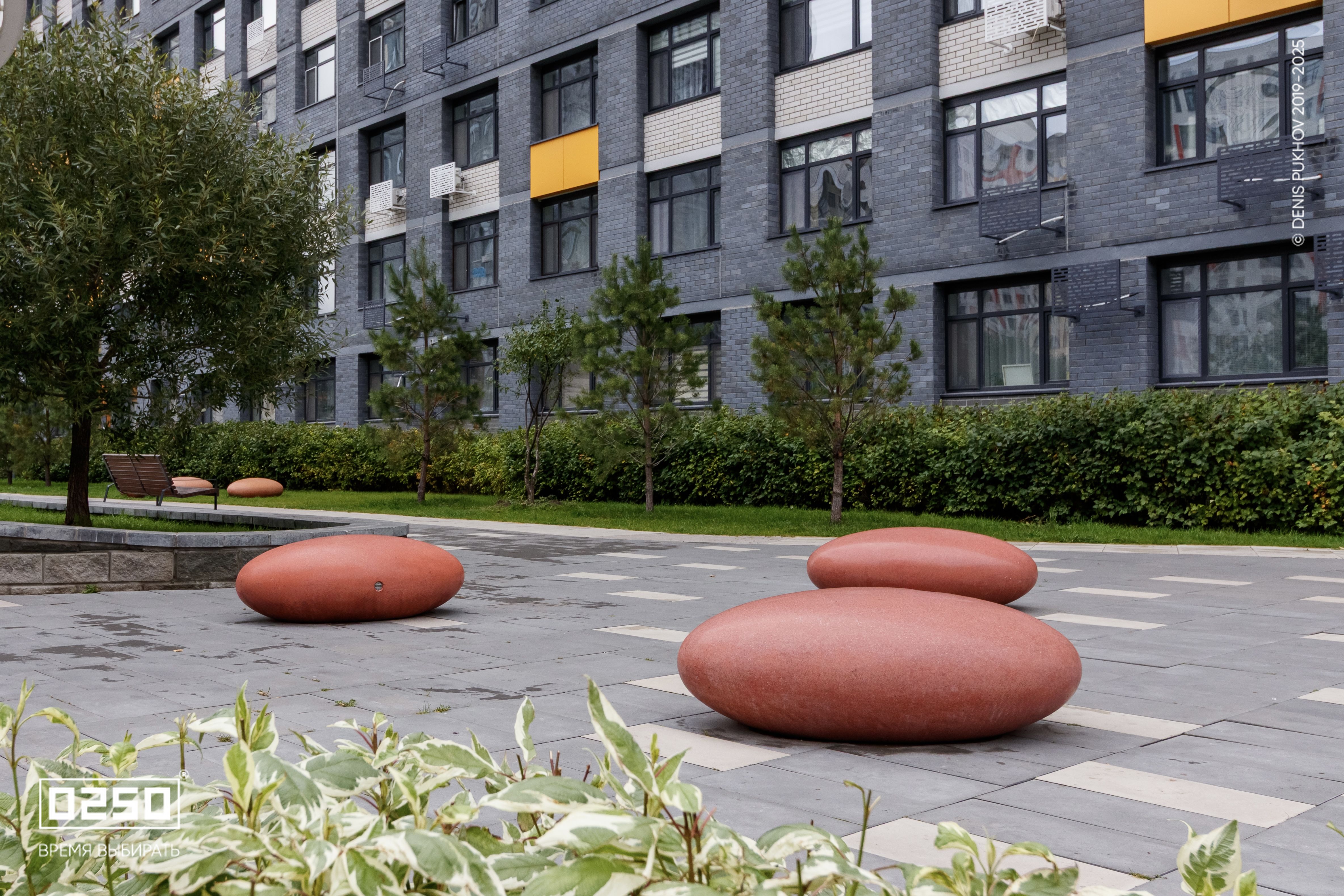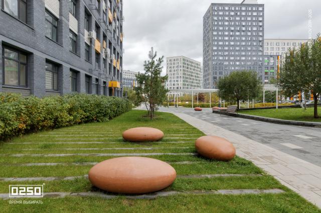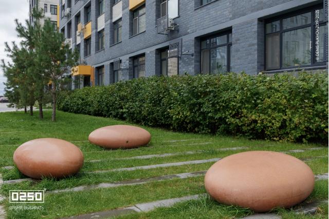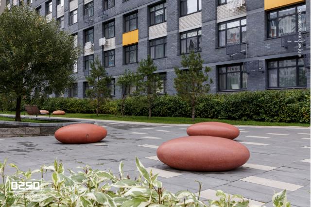 Большое внимание уделено созданию эстетичной и современной дворовой зоны. Здесь, словно космические тела, размещены Камни Времени. В проекте использованы три расцветки фактуры изделия: космические Красный Марс и Лунный Кратер, а также трендовый Рыжий Кортен.