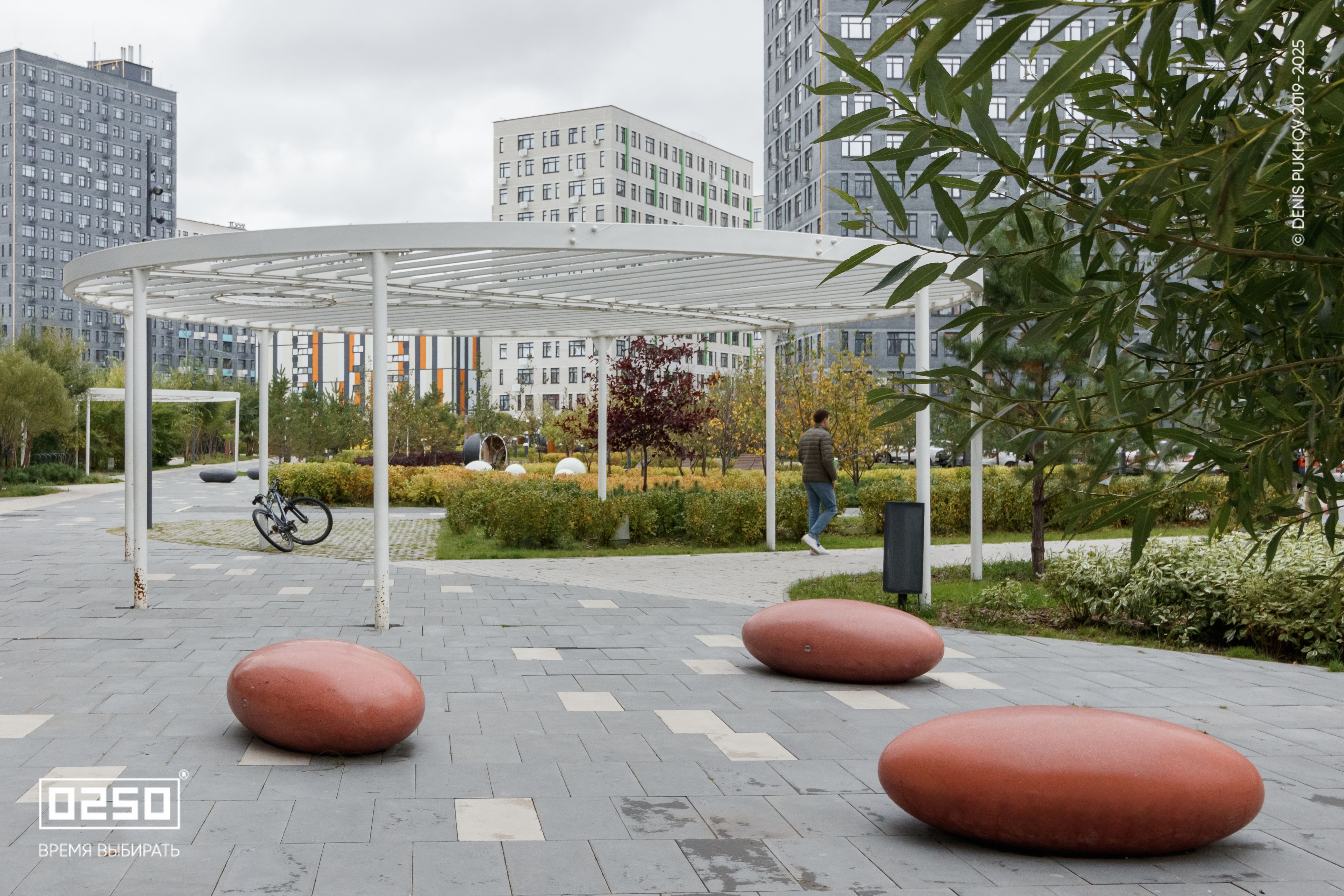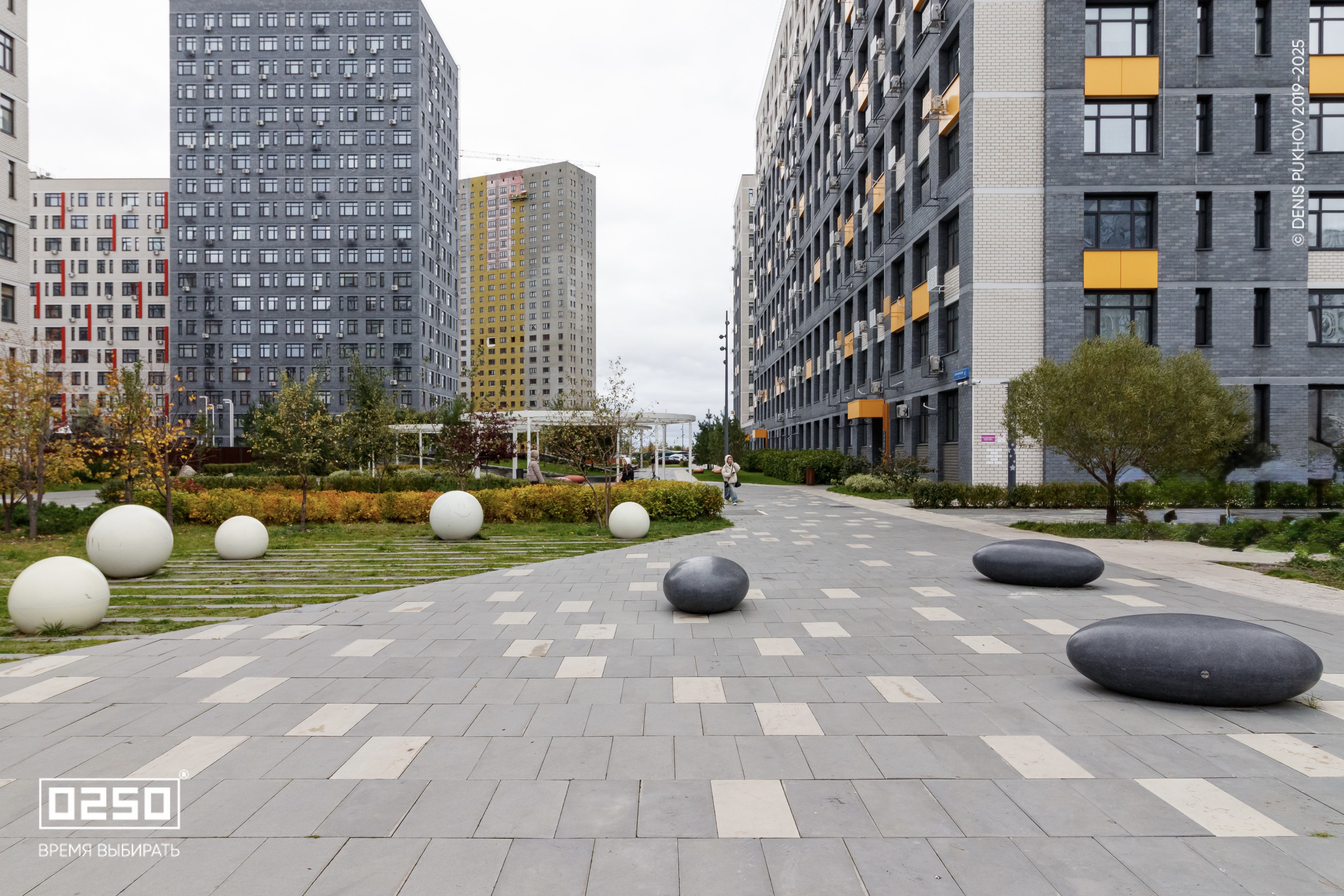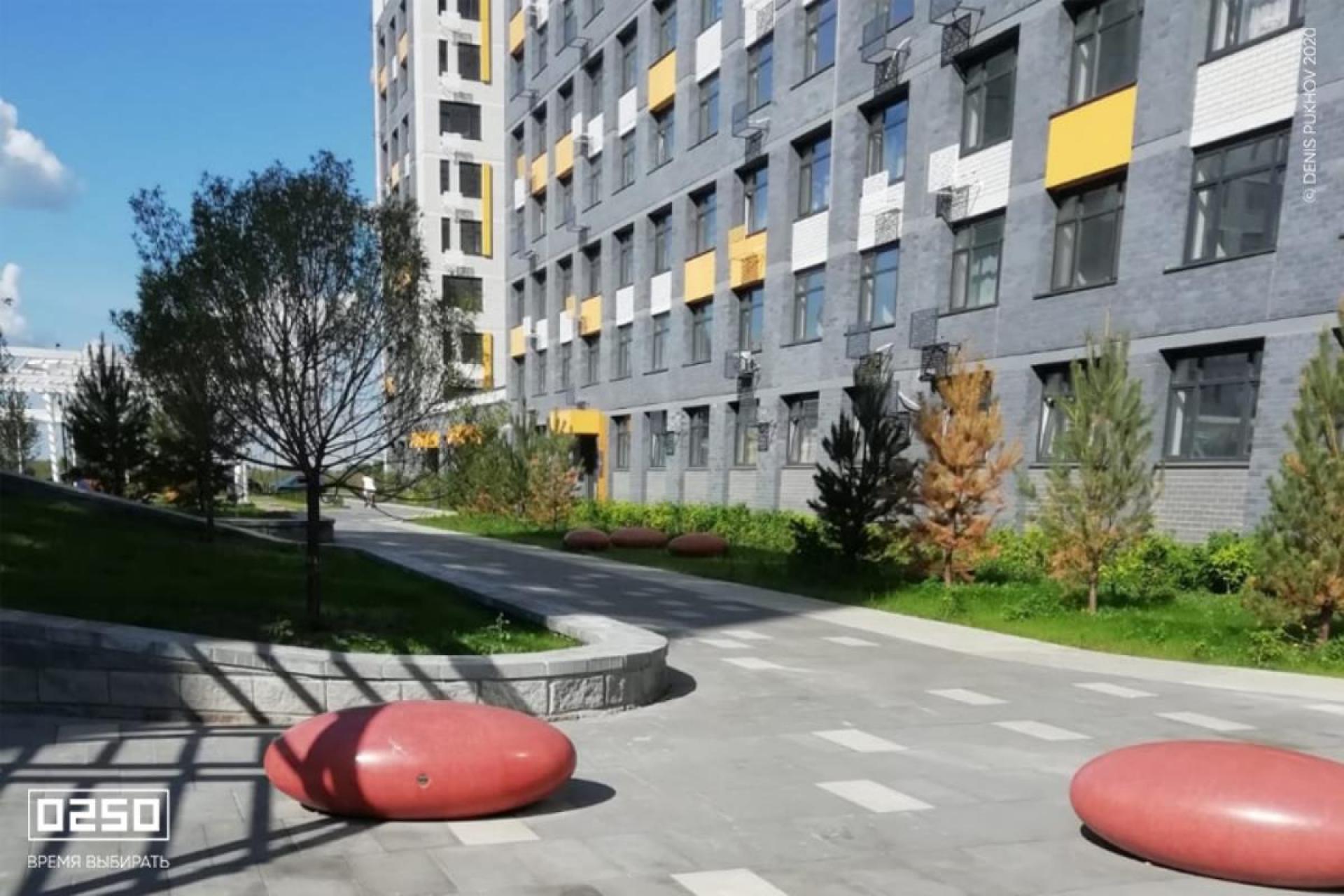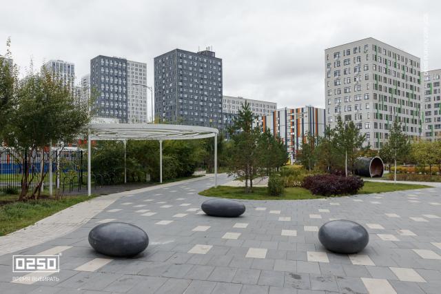 Большое внимание уделено созданию эстетичной и современной дворовой зоны. Здесь, словно космические тела, размещены Камни Времени. В проекте использованы три расцветки фактуры изделия: космические Красный Марс и Лунный Кратер, а также трендовый Рыжий Кортен.