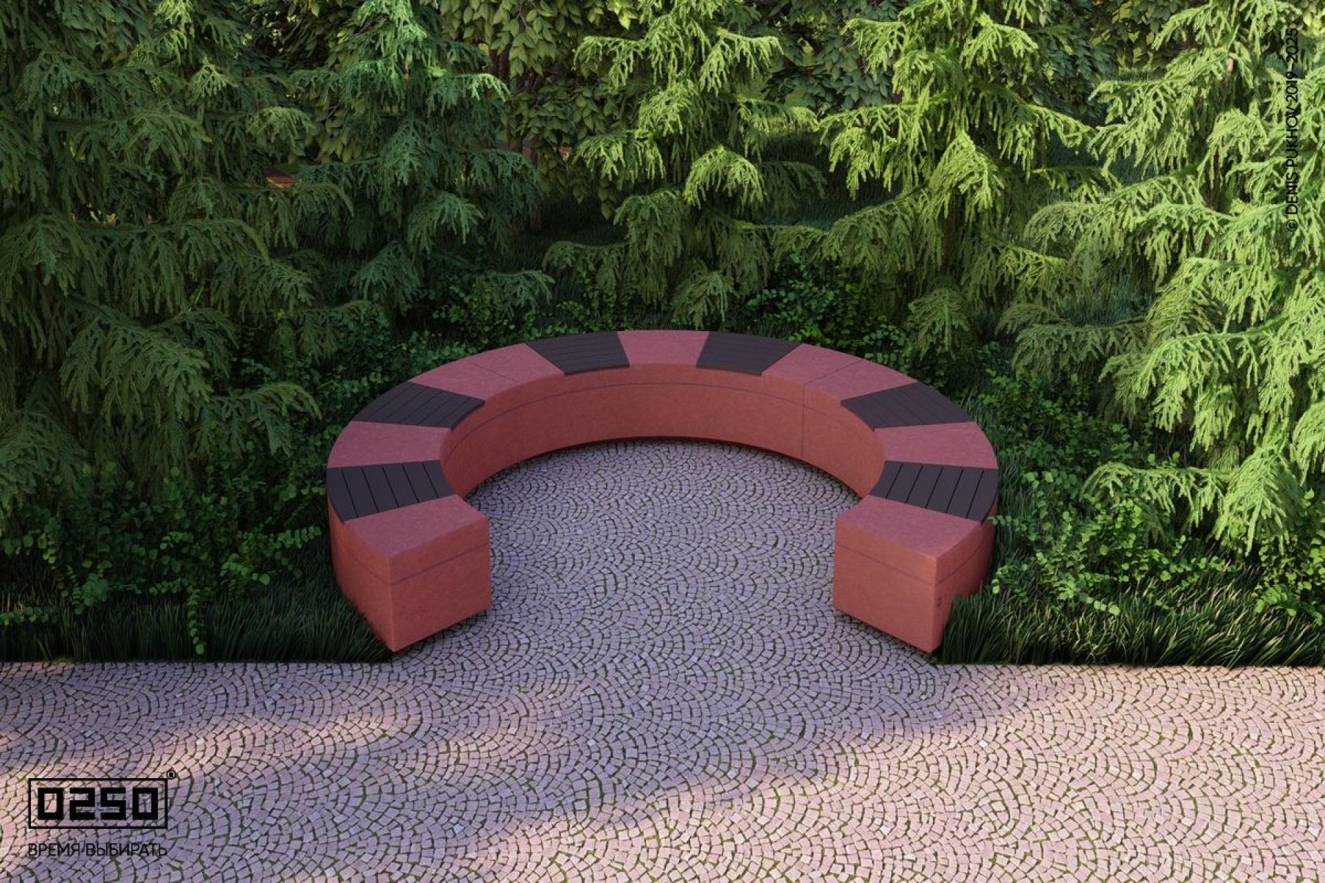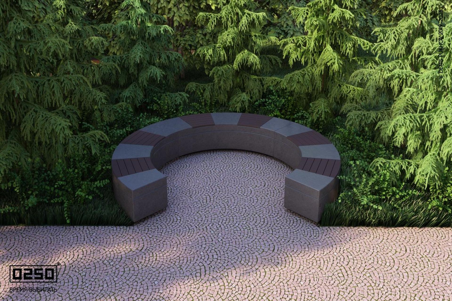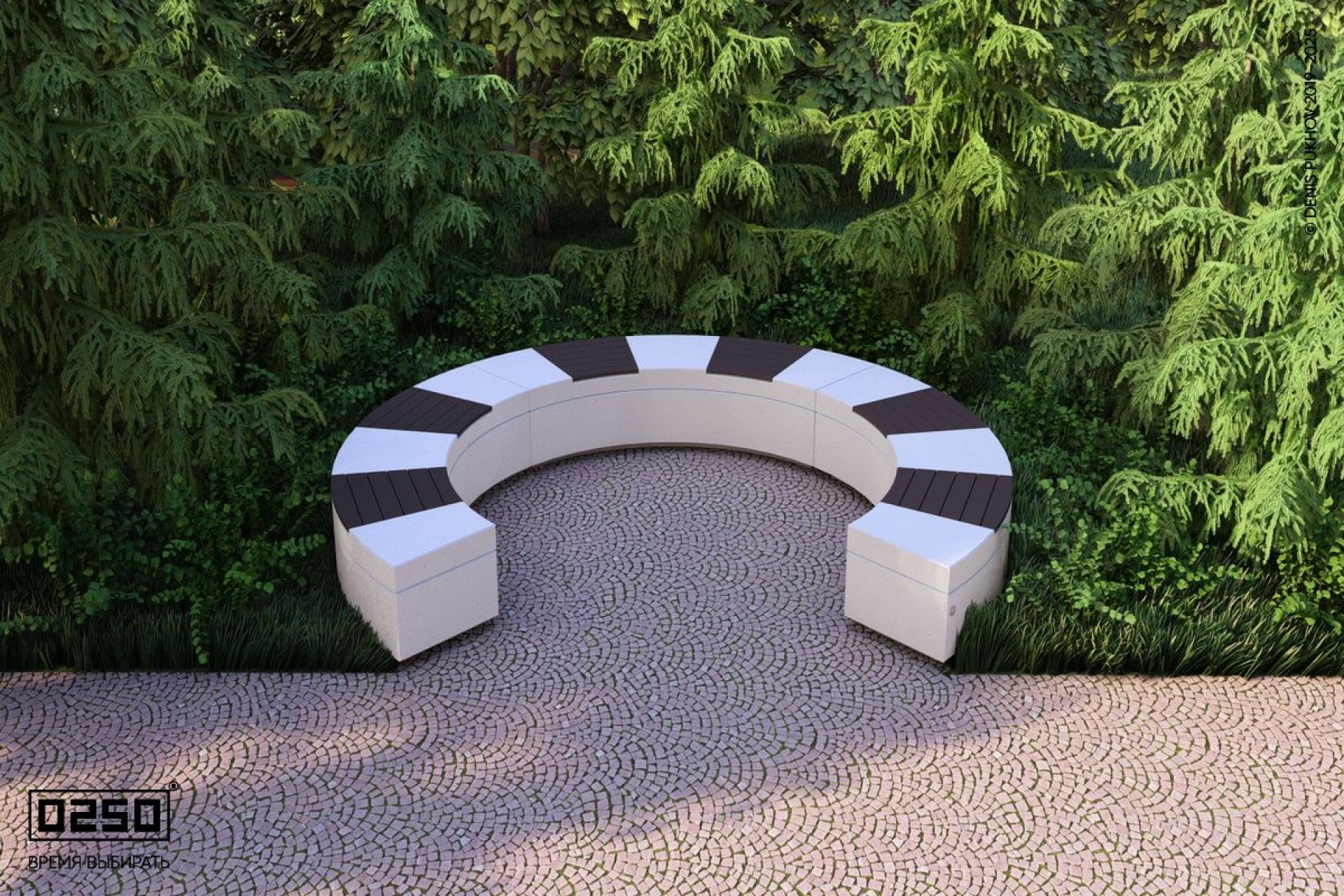 - Описание: Уличная для благоустройства общественных мест. Сверху напоминает букву с. Состоит из трех последовательно соединённых скамеек. Состоит из частей кольца с углом дуги 90 градусов диаметром 3 метра. Опора на блоке из полированного до глянца ультра-прочного бетона.