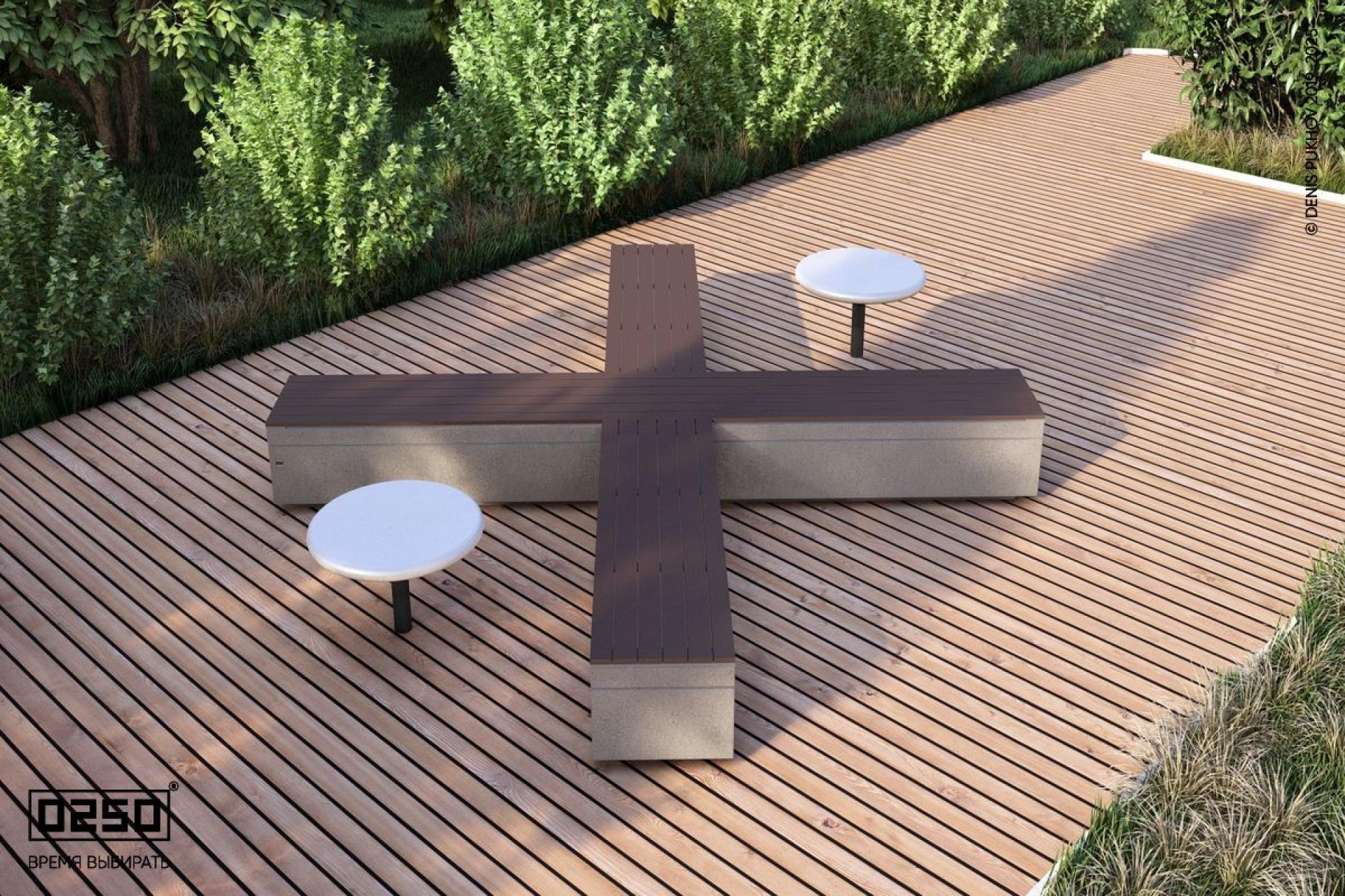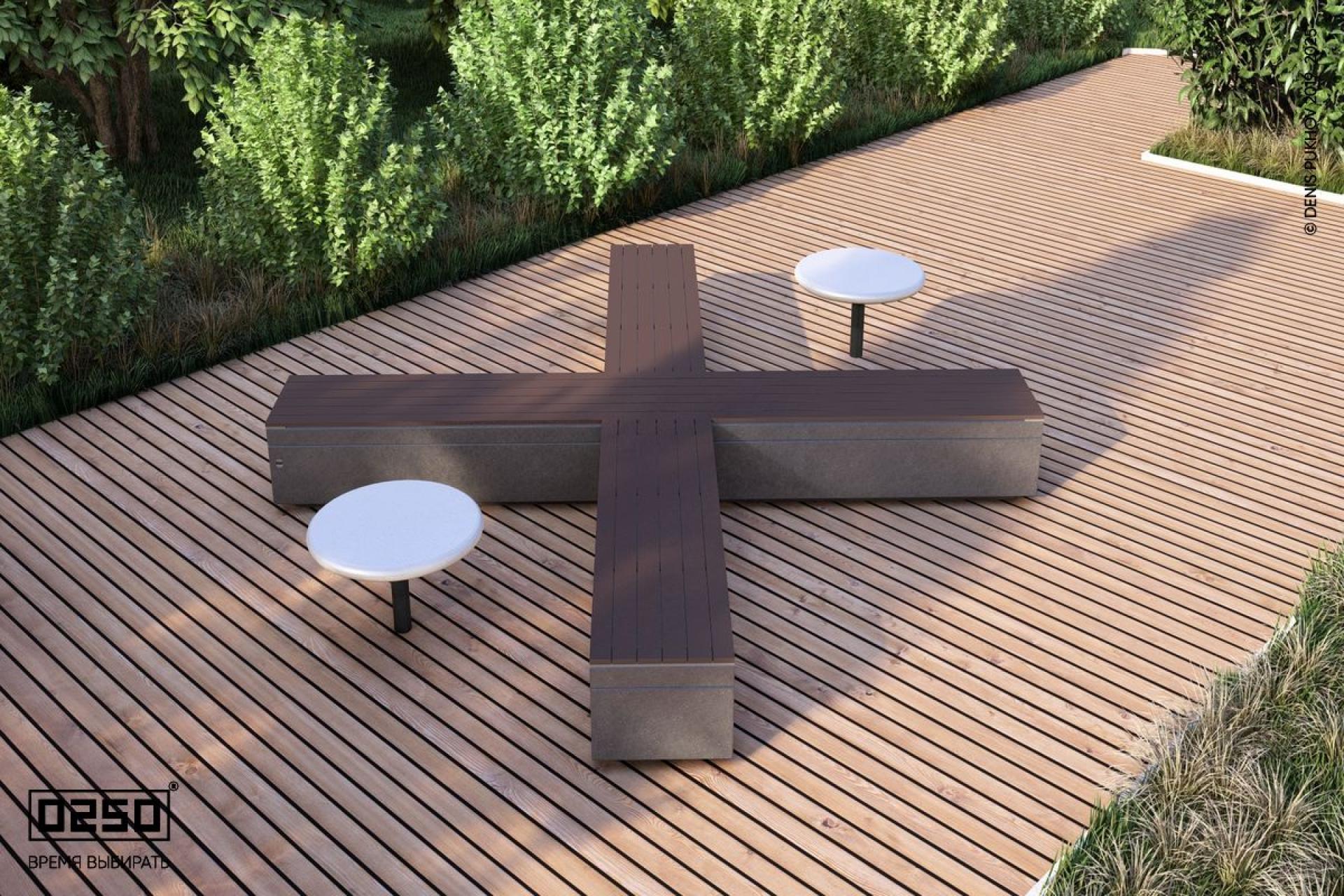 - Описание: Лучевая модульная образующая фигуру состоящею из четырех скамеек, расходящиеся от центра. (состоит из прямых и скошенных скамеек). Уличная для благоустройства общественных мест. Опора на блоке из полированного до глянца ультра-прочного бетона. с двумя столами Рондо