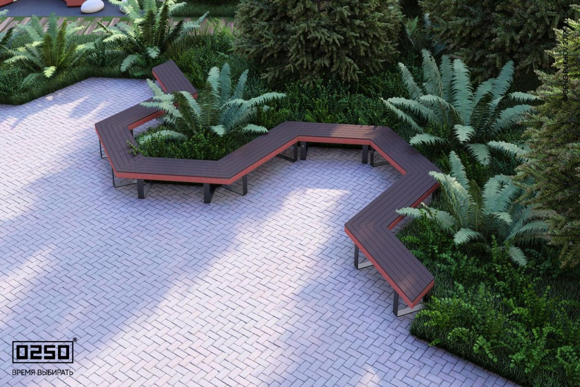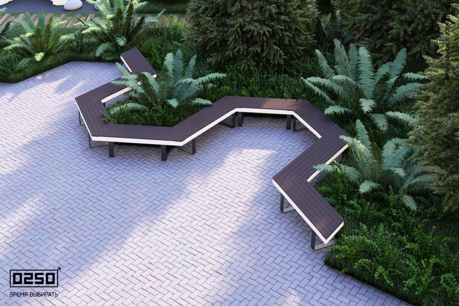 - Описание: Сверху напоминает букву n. Периодические модульные скамейки в форме гексагональной волны сочетающие геометрию шестиугольников с волнообразными формами (состоит из повторяющихся трехугловых скамеек). Уличная для благоустройства общественных мест. Опора на ножках из полимеризированного алюминия.