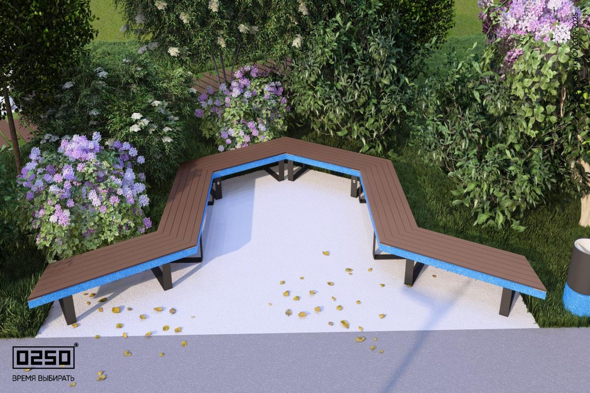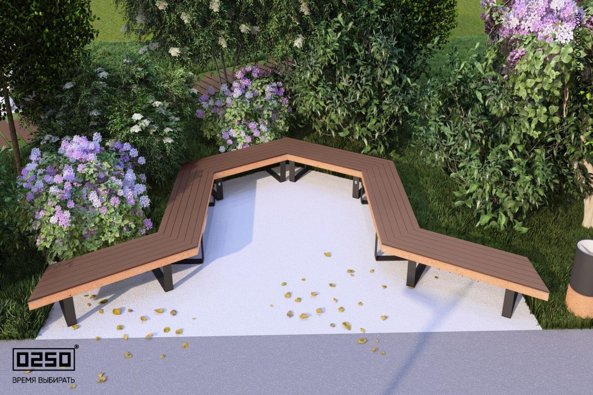 - Описание: Сверху напоминает букву u. Периодические модульные скамейки в форме гексагональной волны сочетающие геометрию шестиугольников с волнообразными формами (состоит из повторяющихся трехугловых скамеек). Уличная для благоустройства общественных мест. Опора на ножках из полимеризированного алюминия.