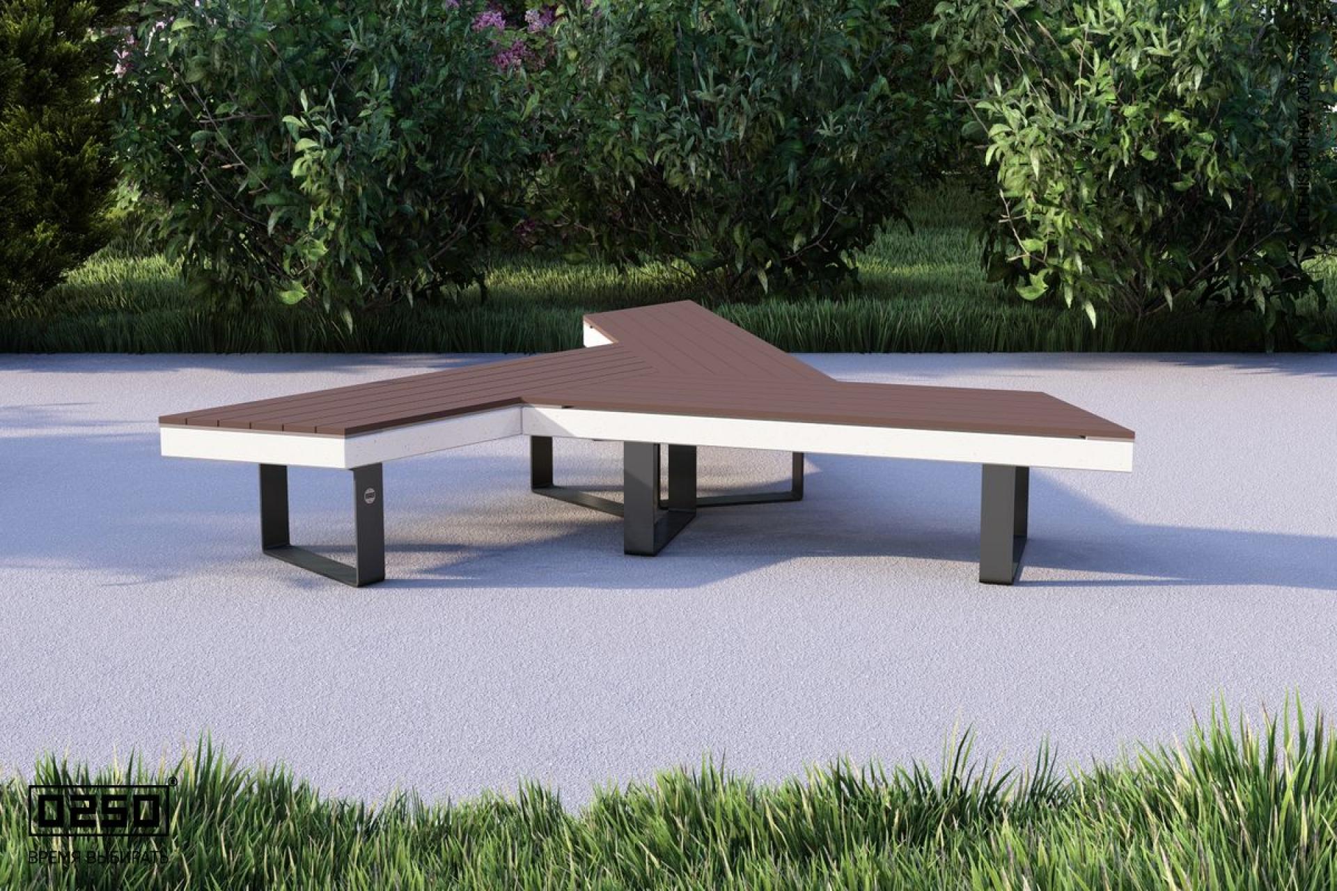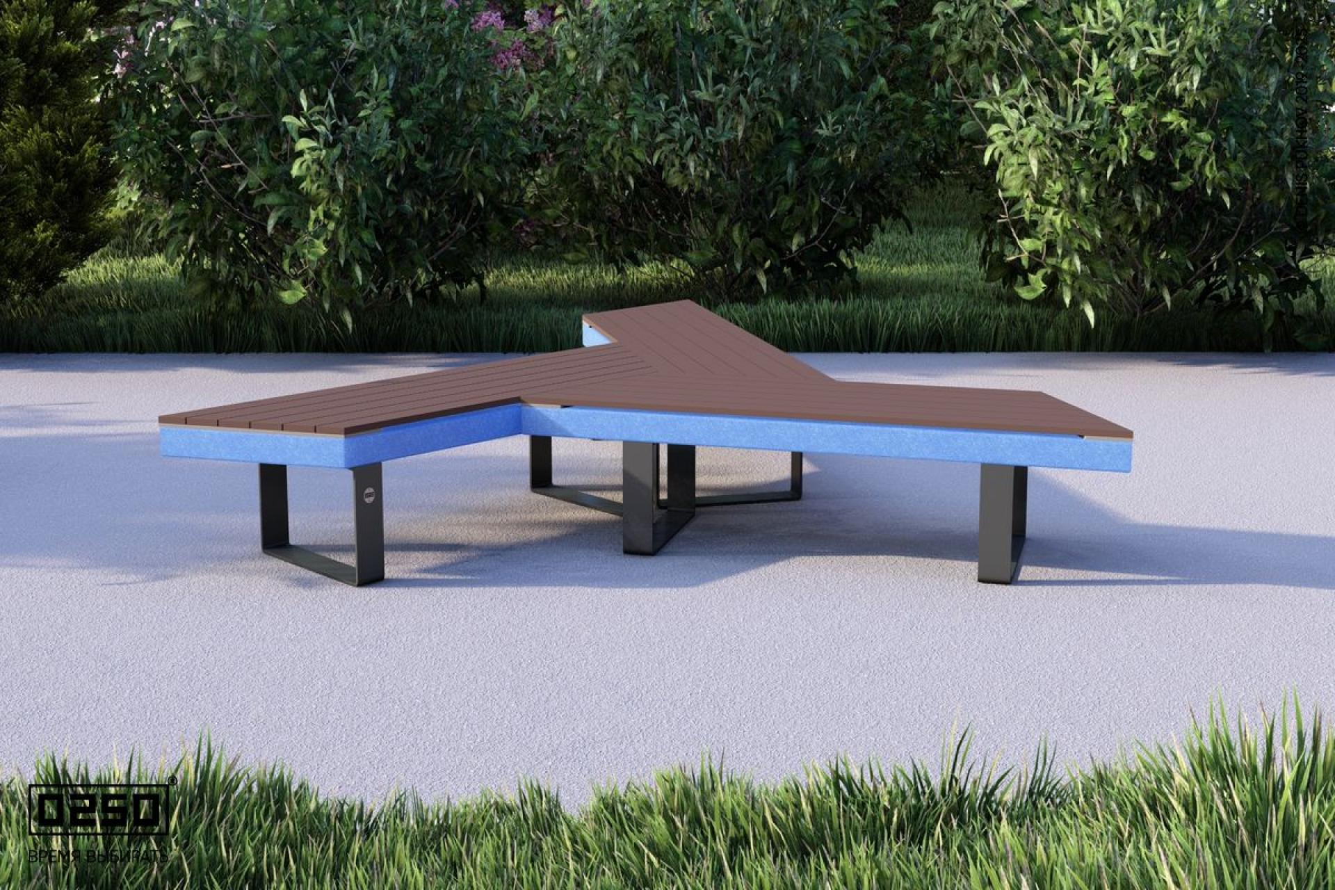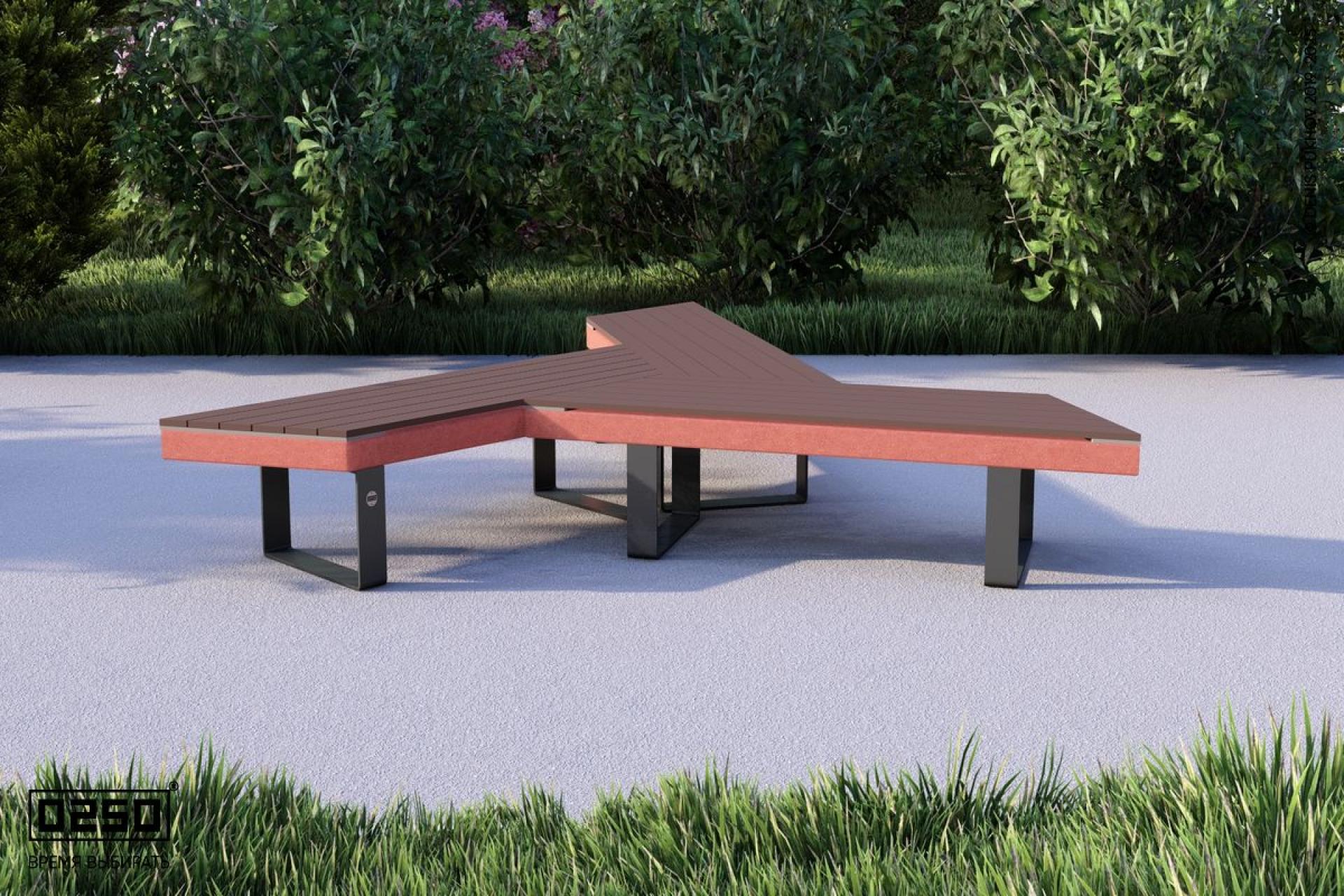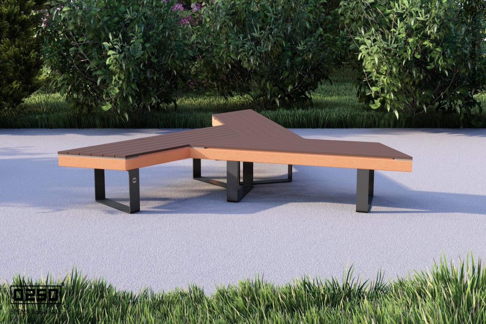 - Описание: Уличная для благоустройства общественных мест. Лучевая модульная образующая фигуру состоящею из трех скамеек, расходящиеся от центра.(состоит из прямых и скошенных скамеек). Имеет форму трапециевидной равнобедренной призмы. Опора на ножках из полимеризированного алюминия.