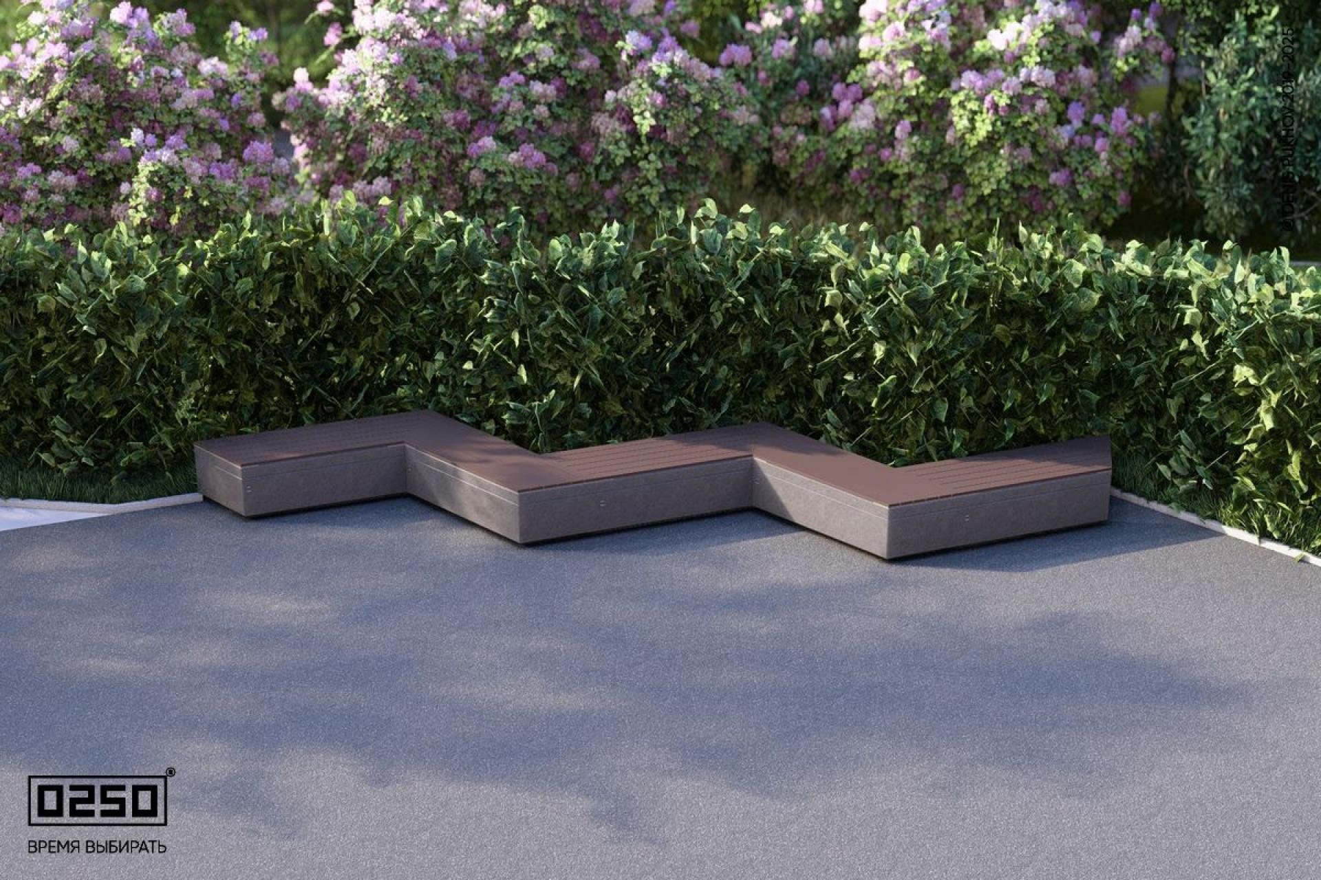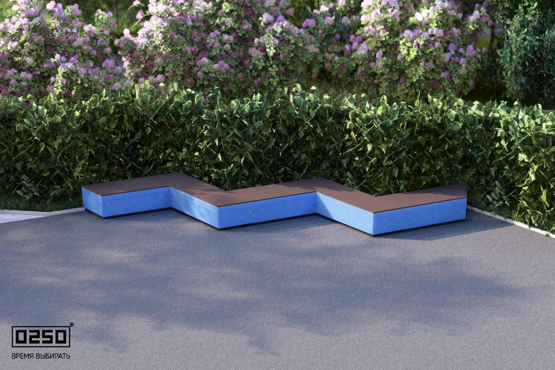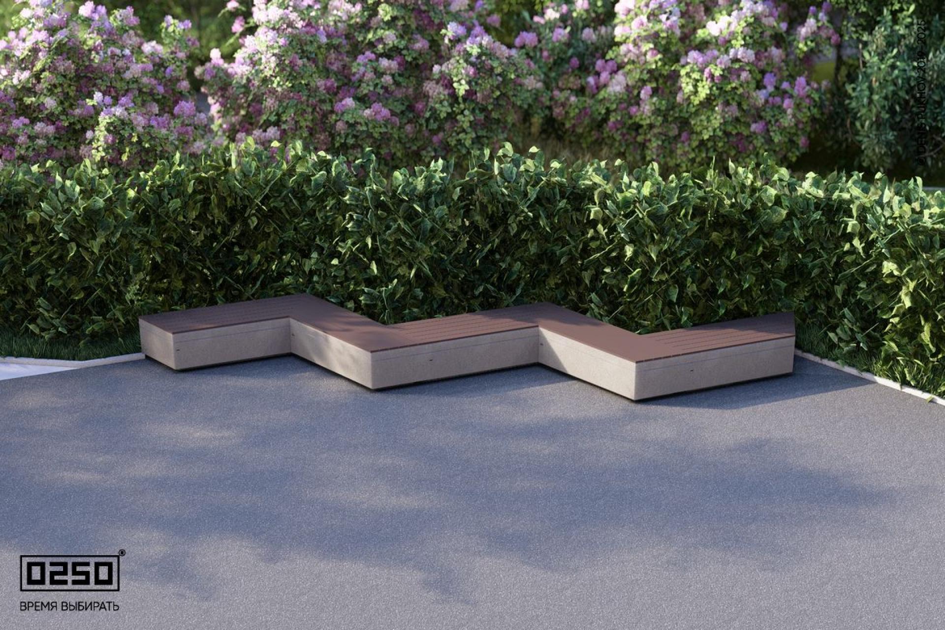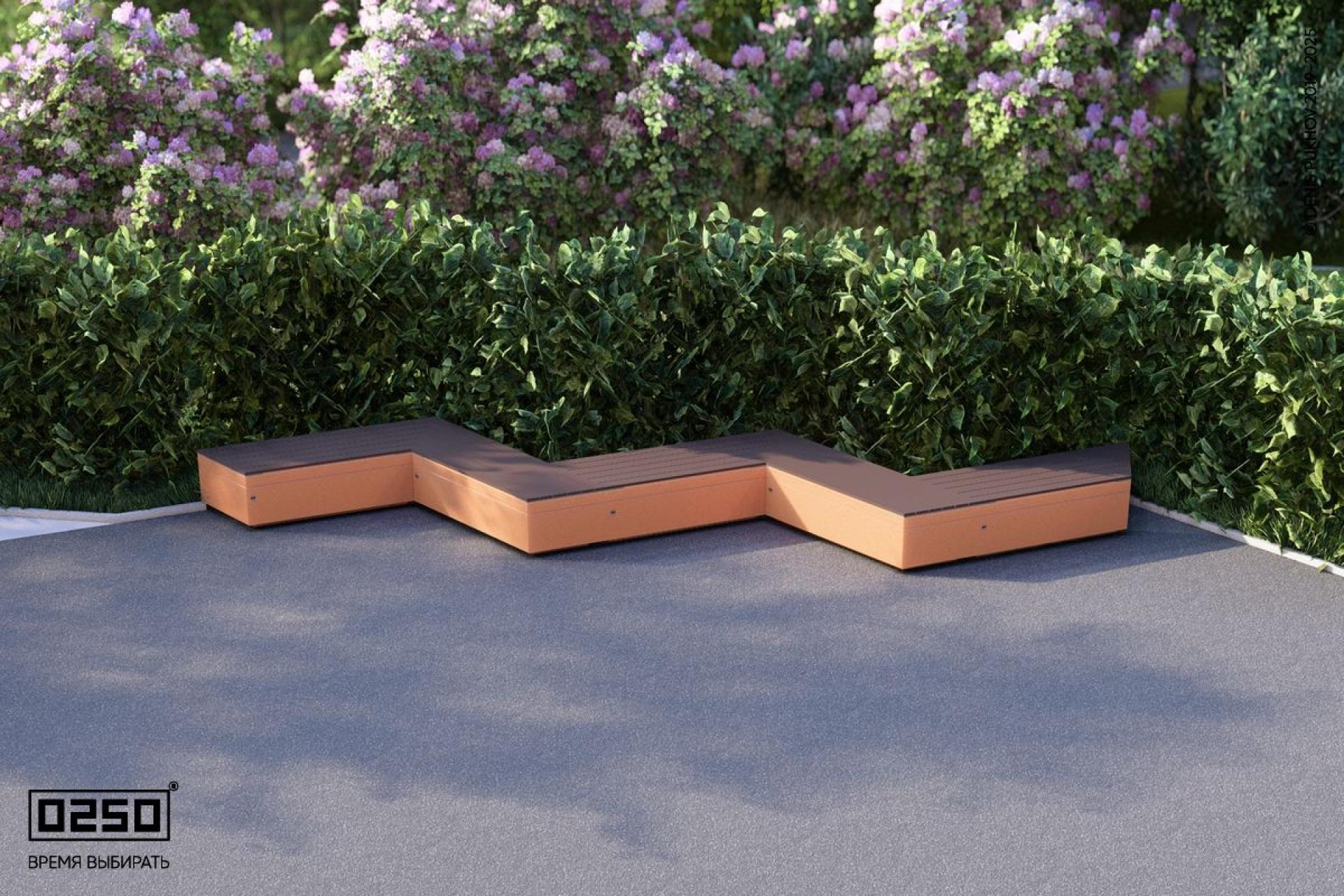 - Описание: Периодическая модульная скамейки в форме треугольной волны сочетающие геометрию трегольника с волнообразными формами (состоит из скошенных скамеек). Вписывающиеся в повторяющейся геометрический рисунок трапецеидальной волны. Состоит из пяти последовательно соединённых скамеек. Уличная для благоустройства общественных мест. Опора на блоке из полированного до глянца ультра-прочного бетона.