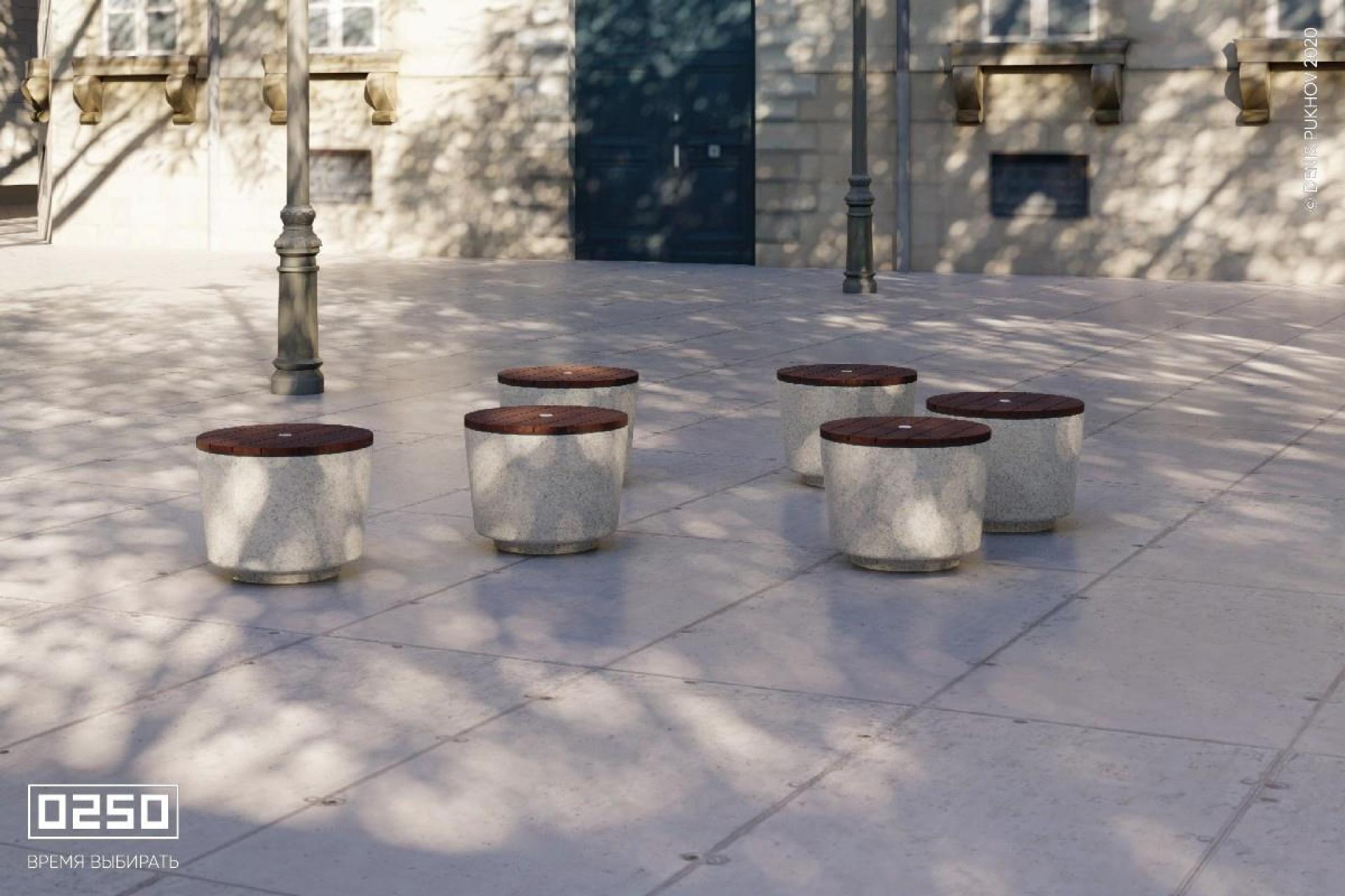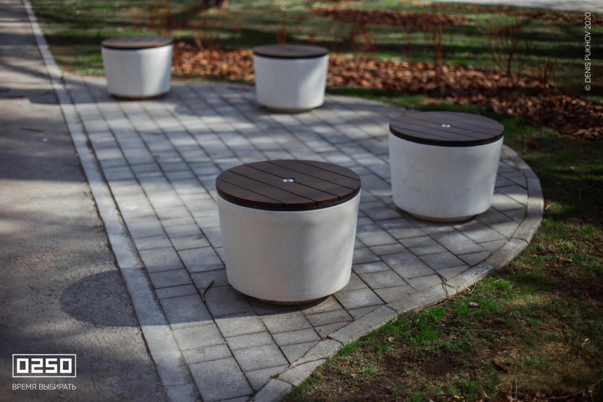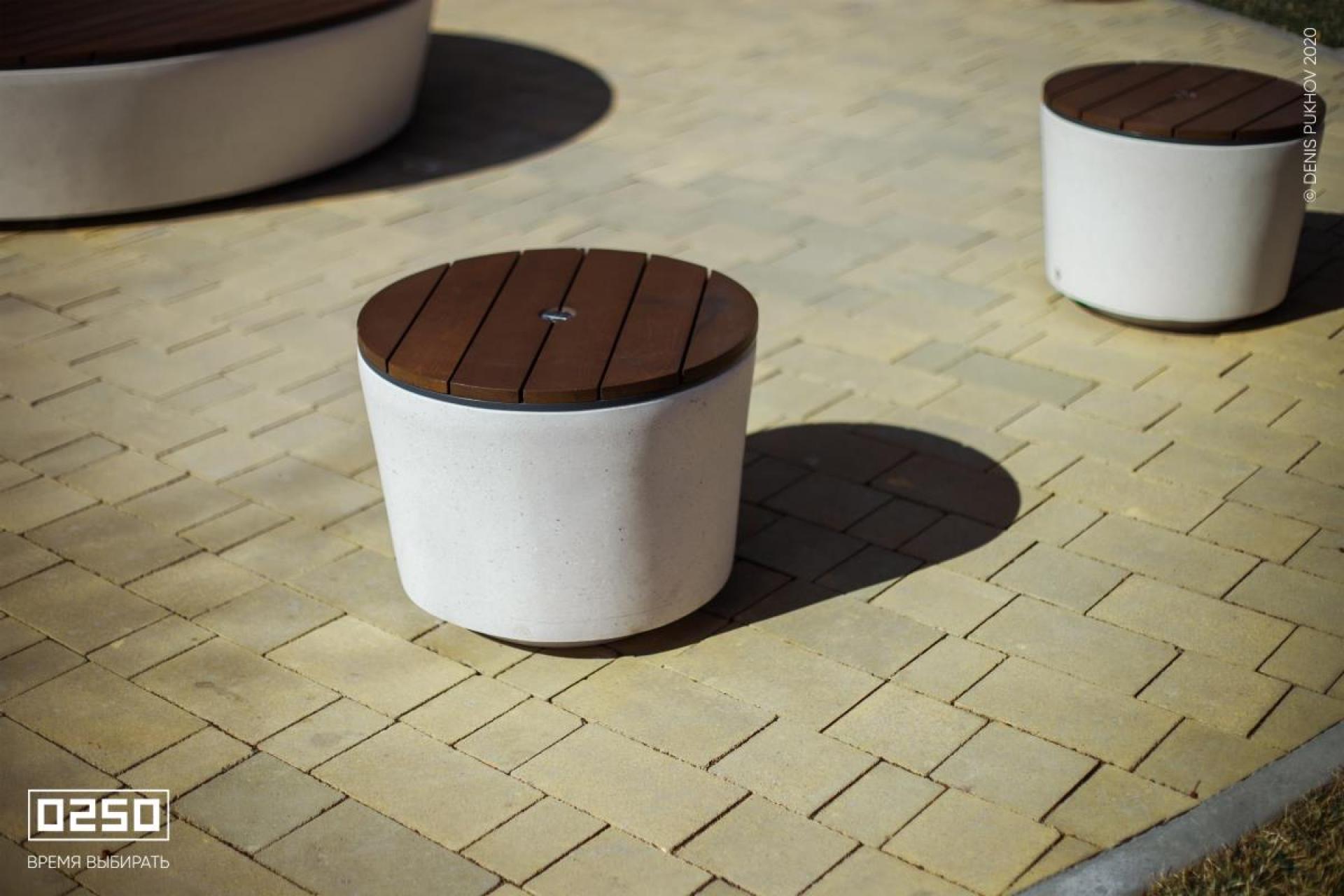 Фактуры гладкого камня и насыщенных оттенков дерева гармонируют с городскими объектами. Круглые скамейки в виде шайбы особенно эффектно выглядят