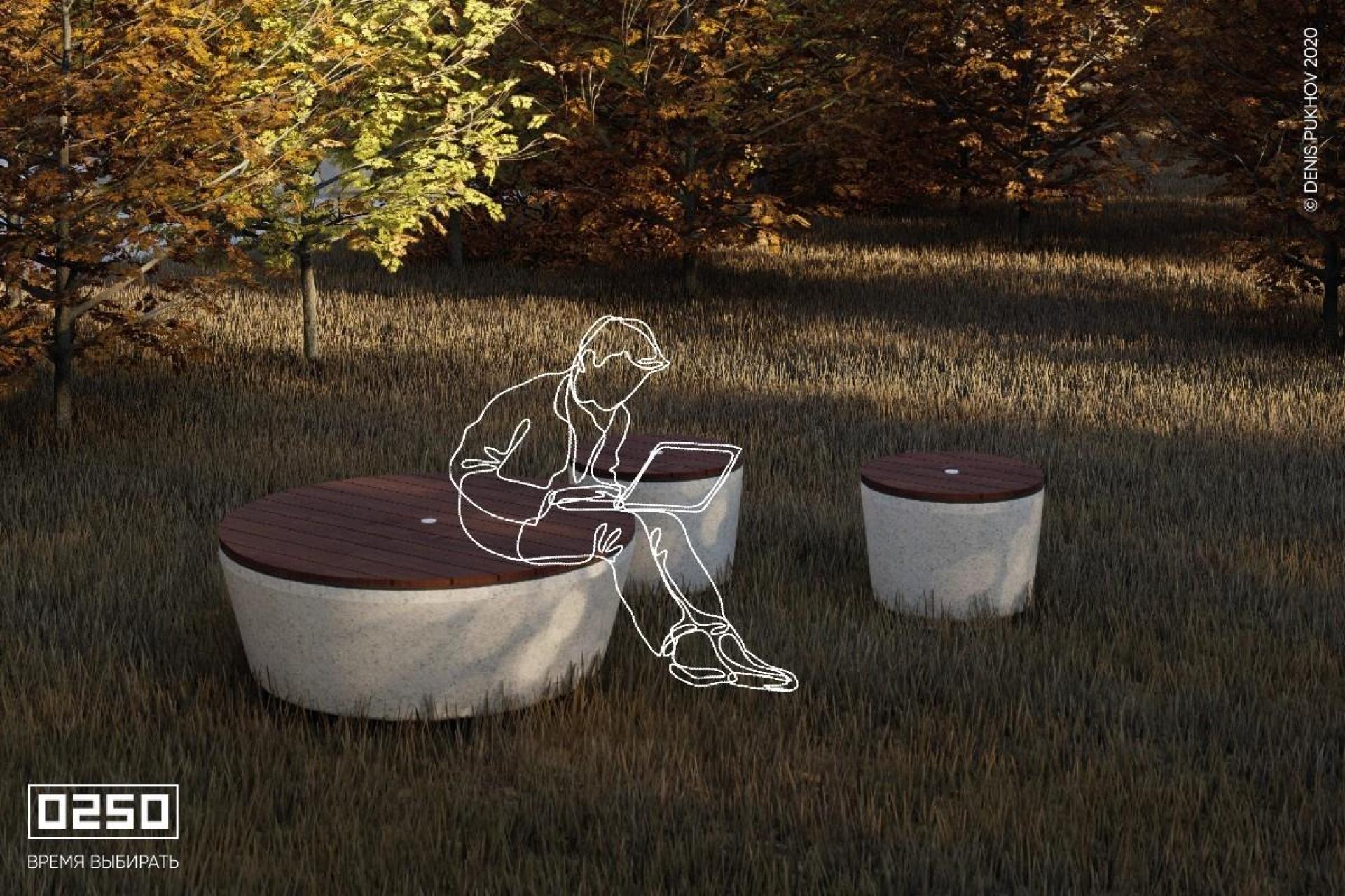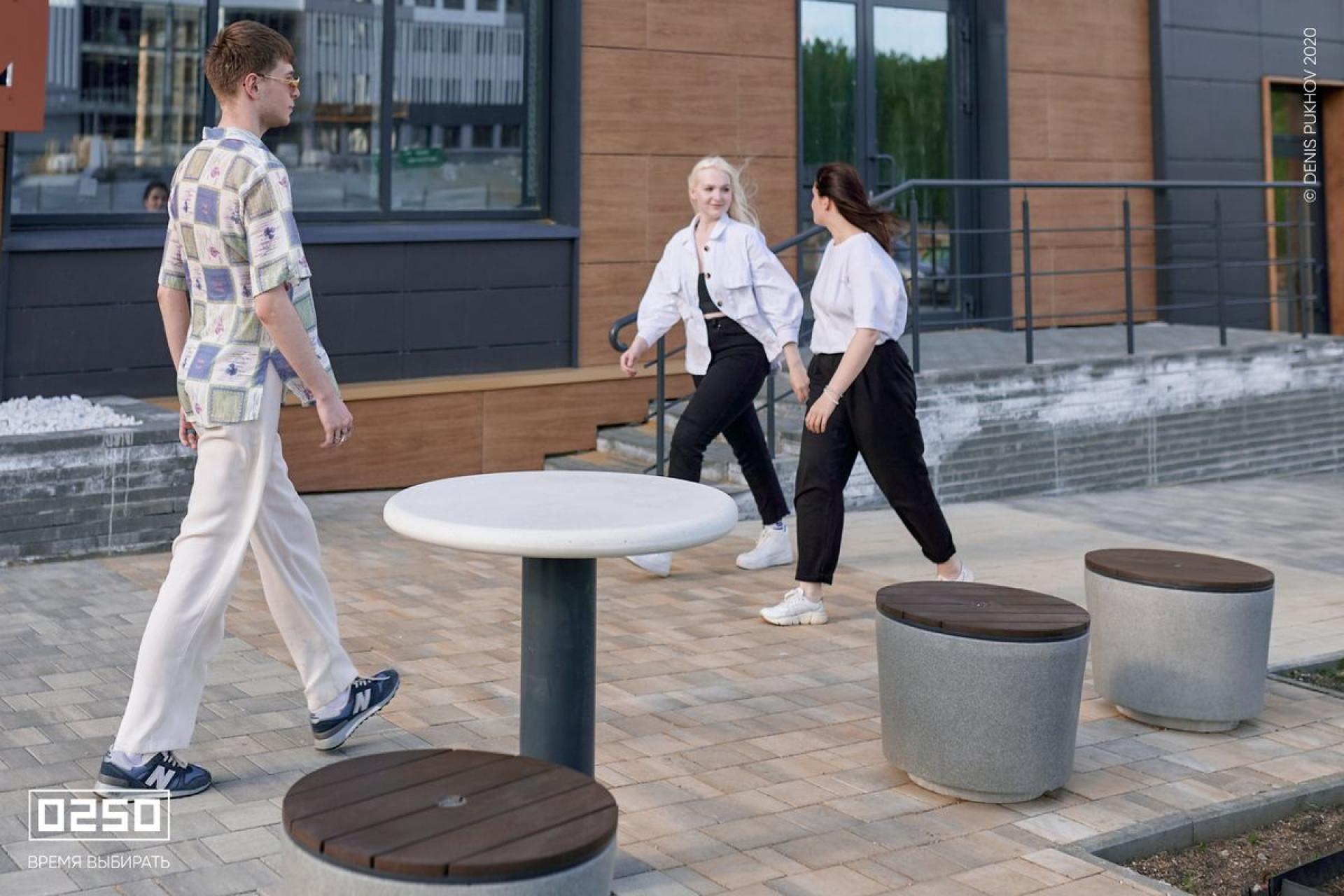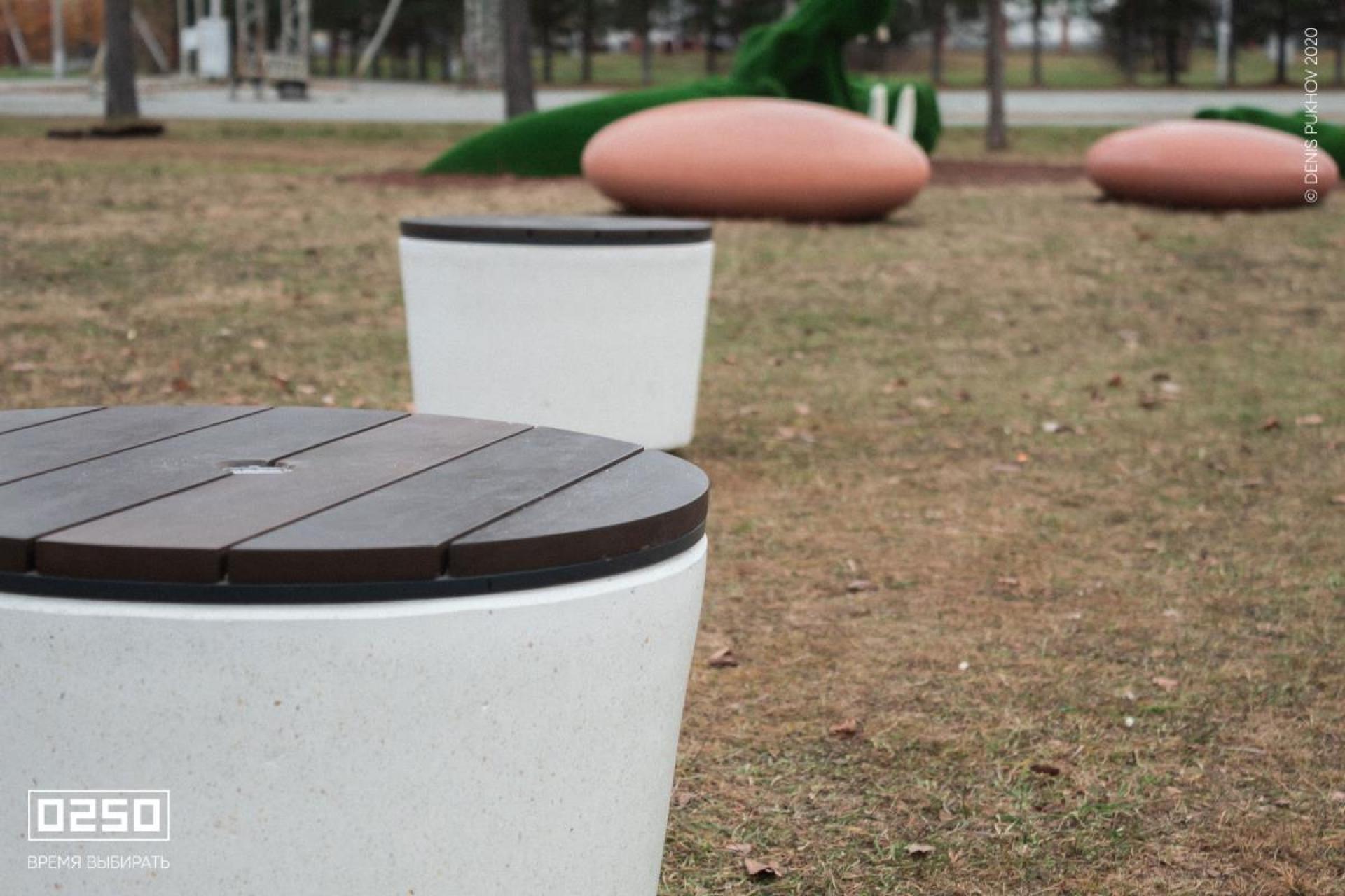 Фактуры гладкого камня и насыщенных оттенков дерева гармонируют с городскими объектами. Круглые скамейки в виде шайбы особенно эффектно выглядят