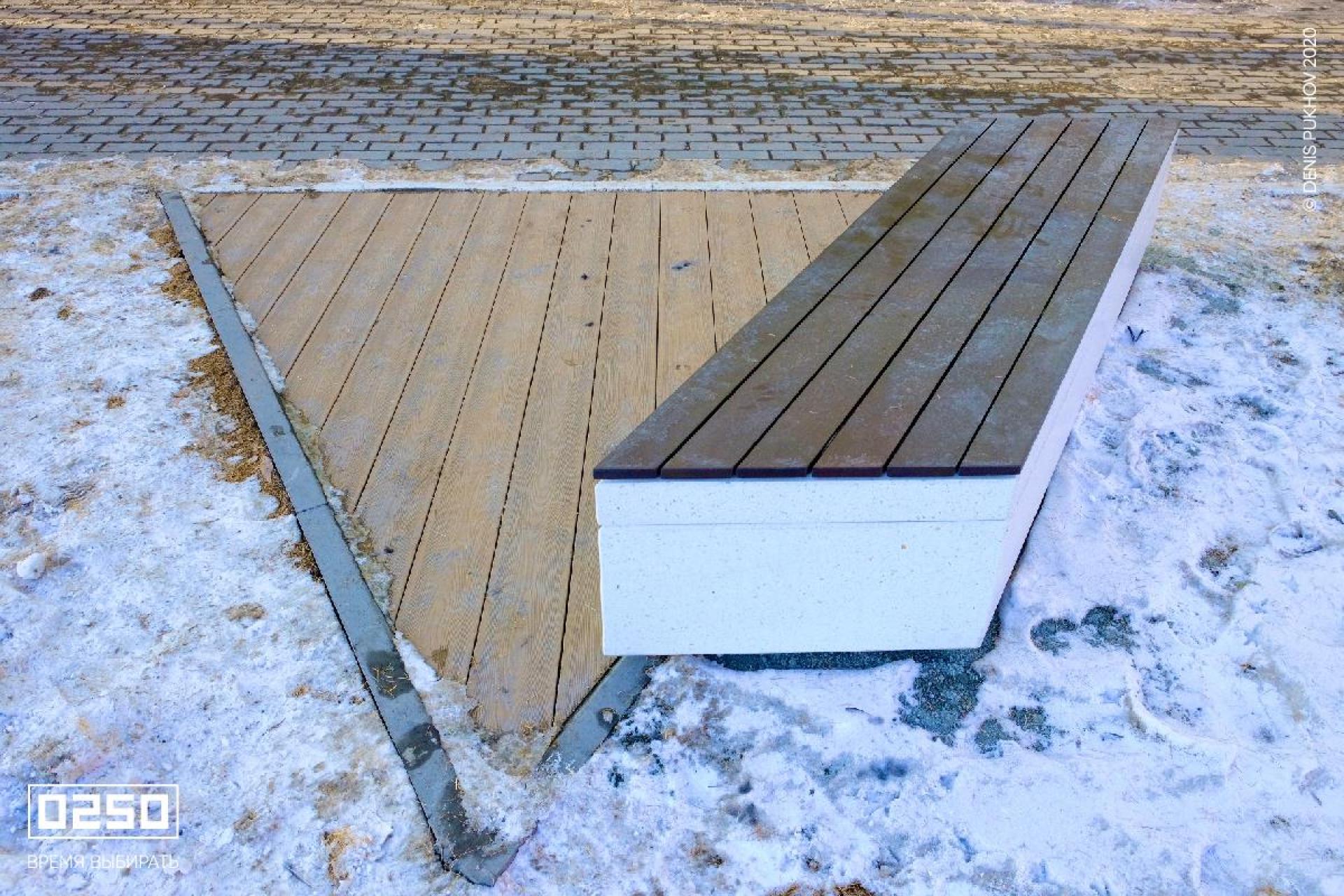 - Материалы скамейки: Скамейка из бетона и древесины (полированный ультра-прочный UHPС бетон 6 — цветов, уф-защищенная термодревесина темного цвета)