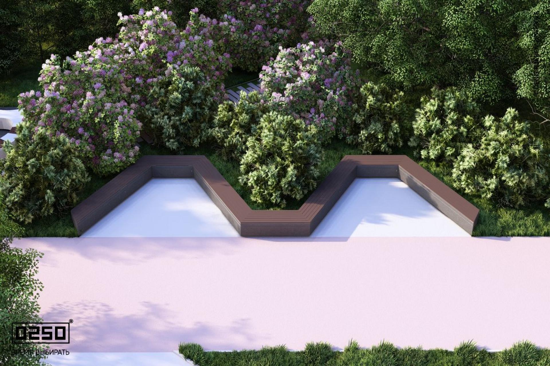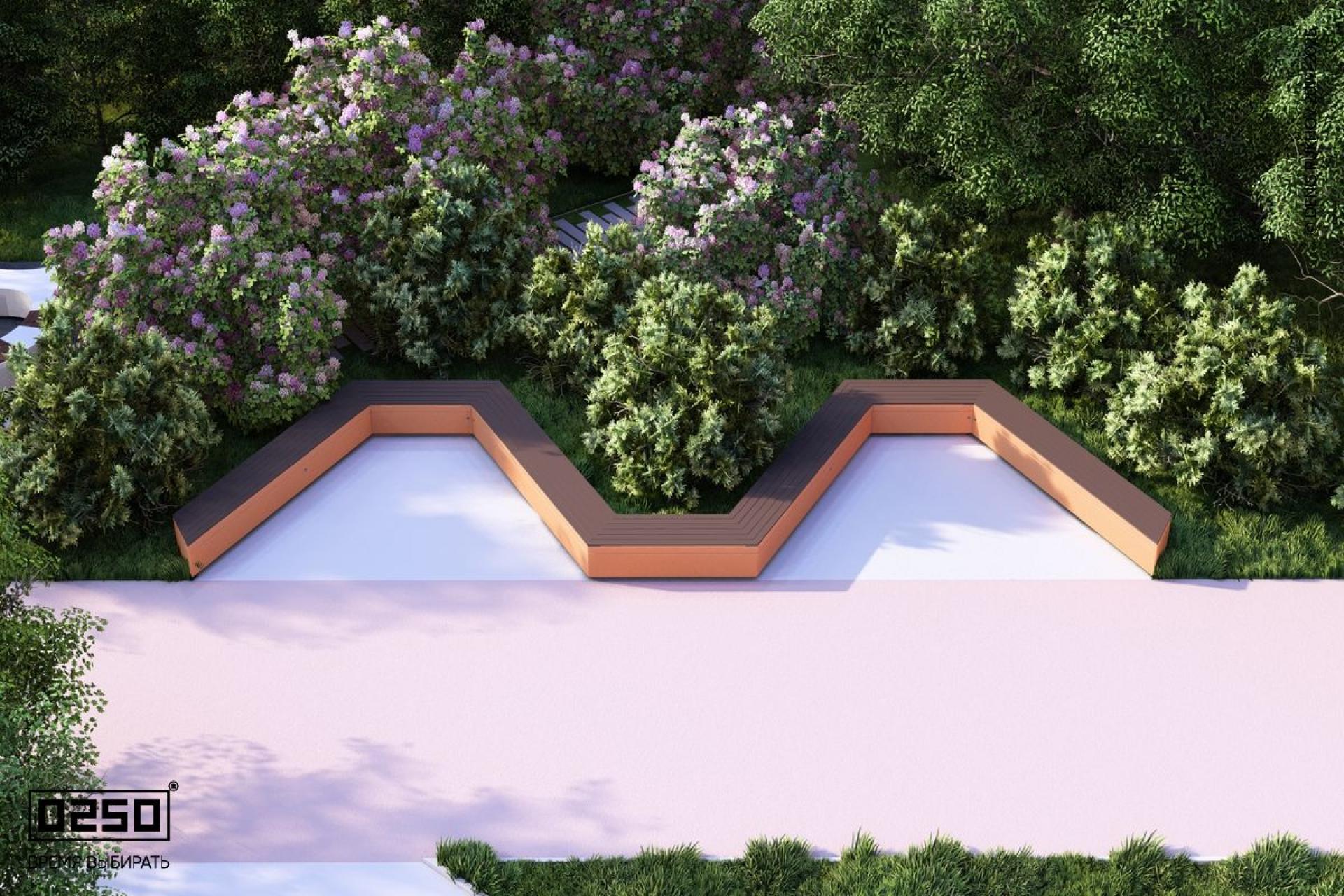 - Сиденья скамейки: Щелевой настил из термодревесины, не контактирующий с бетоном.