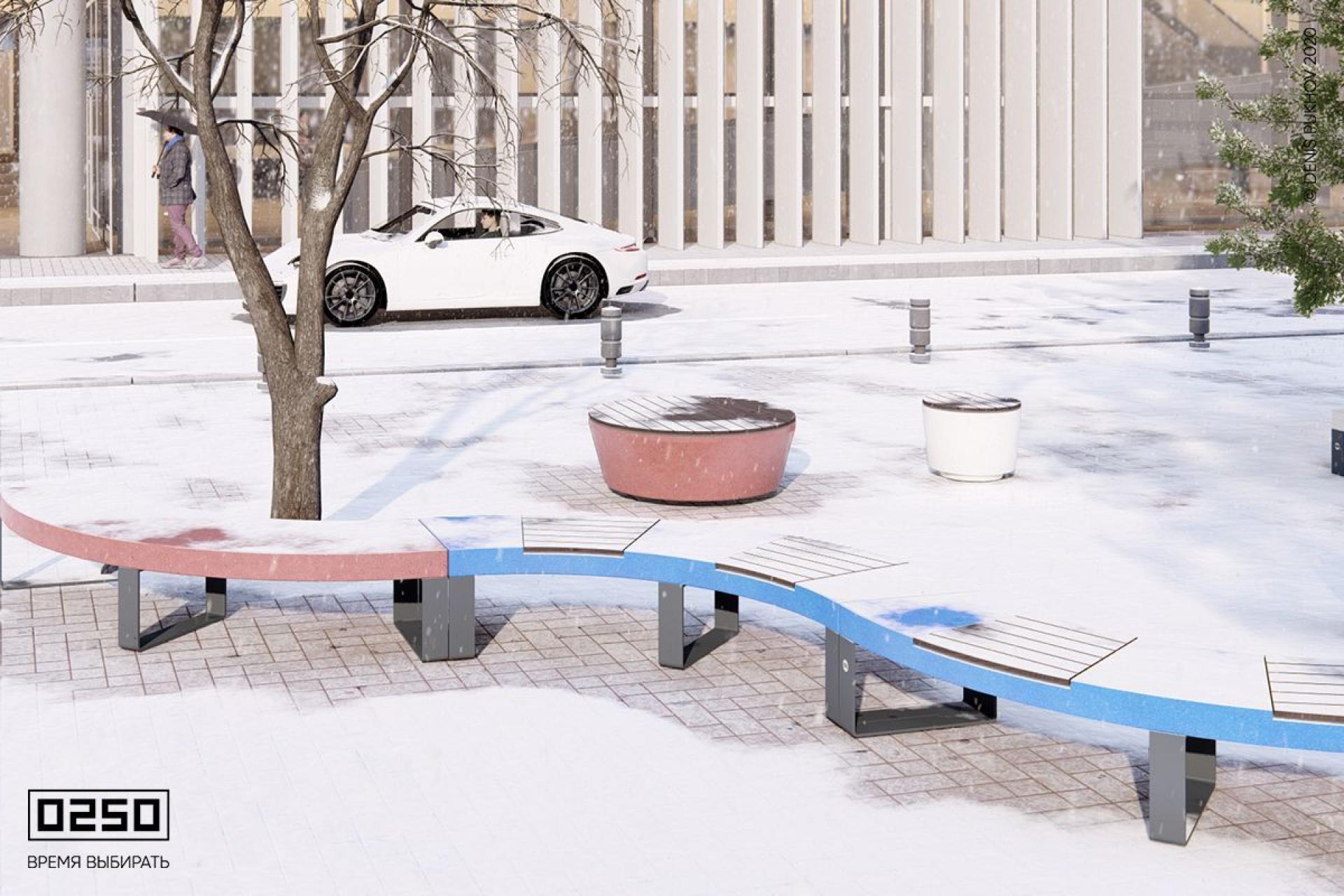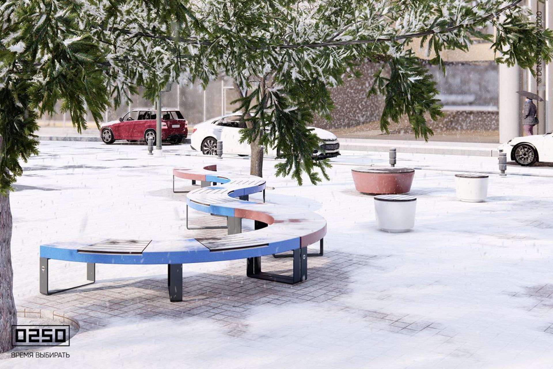 Радиальные скамьи соединяются с другими модулями с любой стороны. В конструкциях используют модульные скамьи 0250, вазоны, урны — любые МАФ.