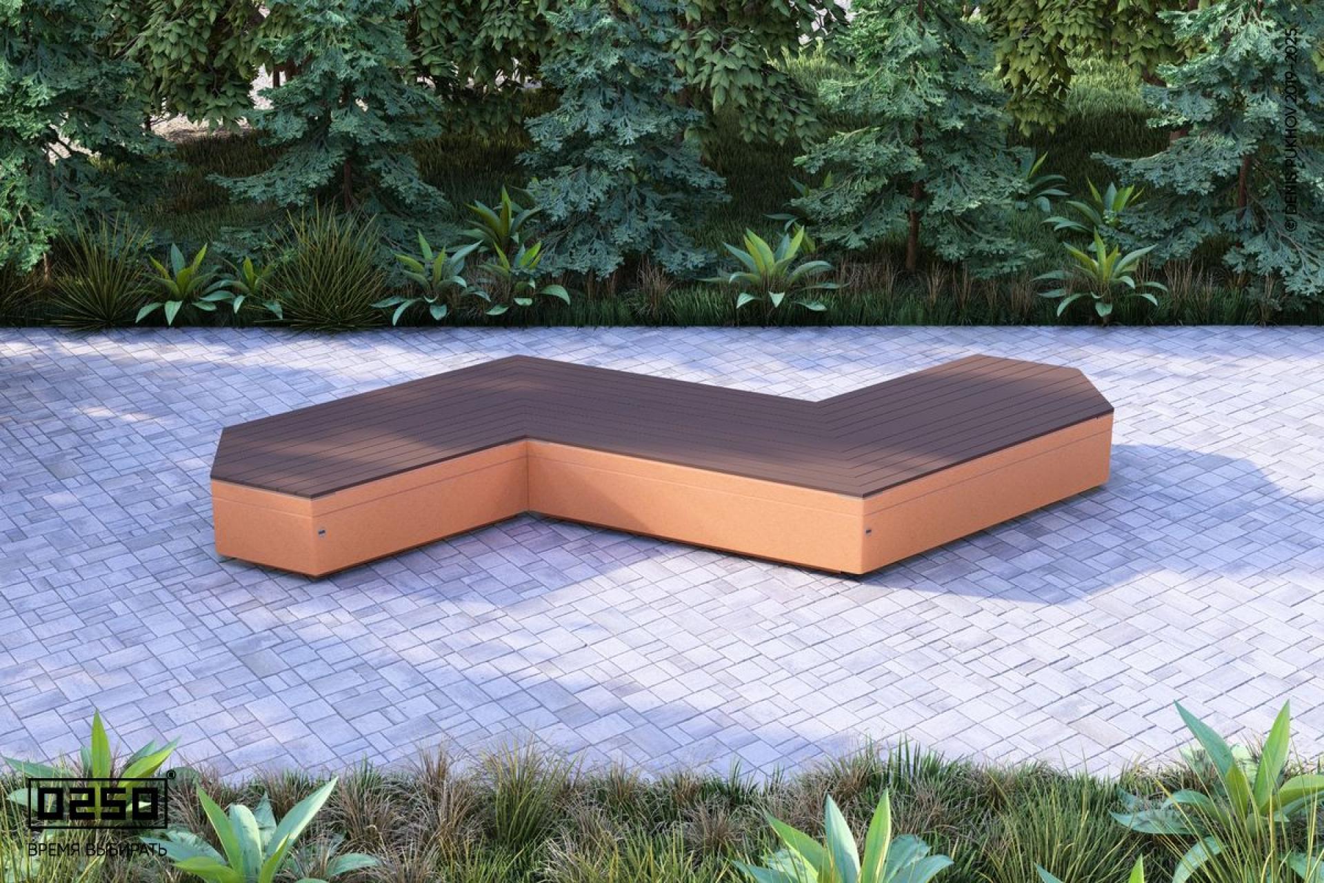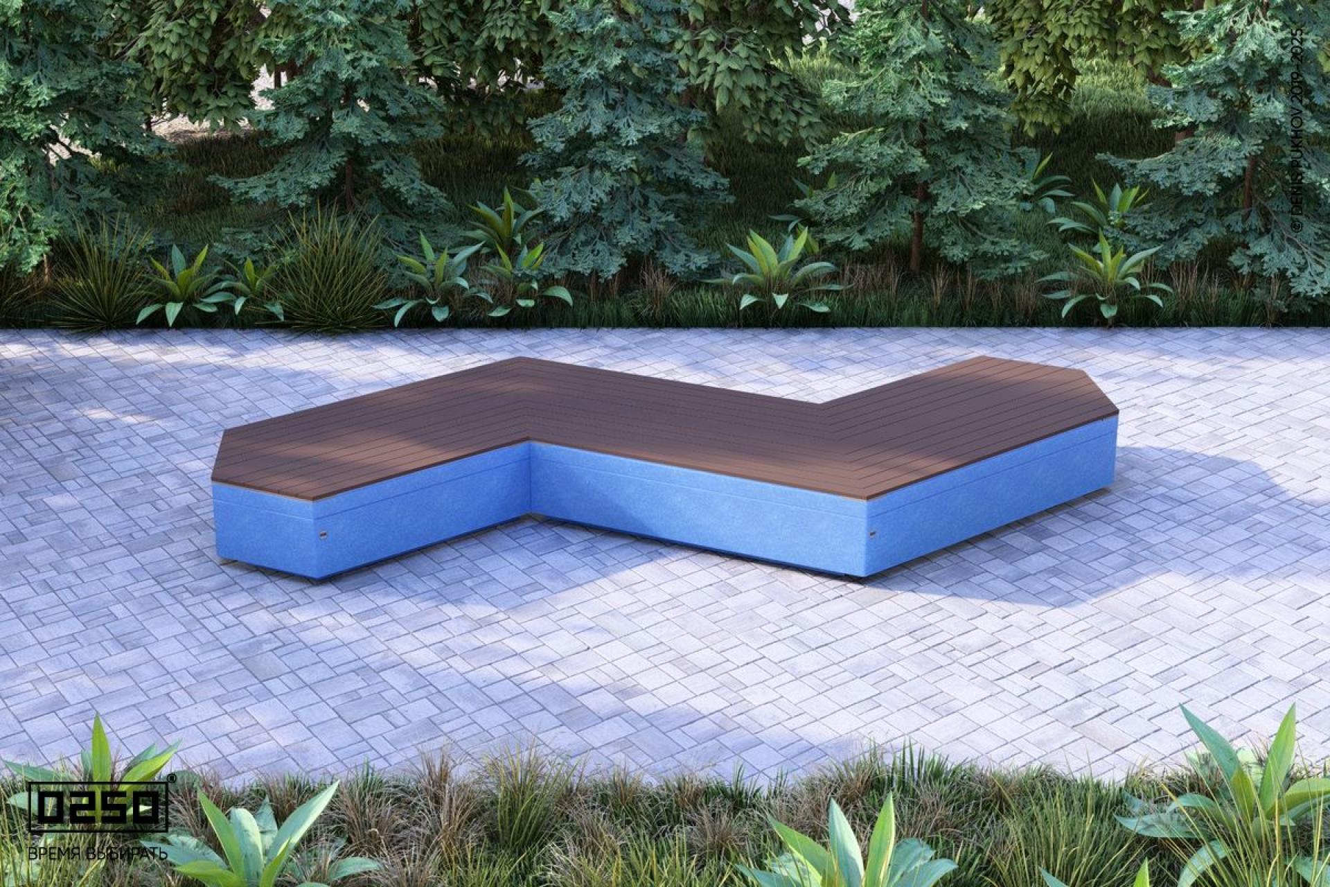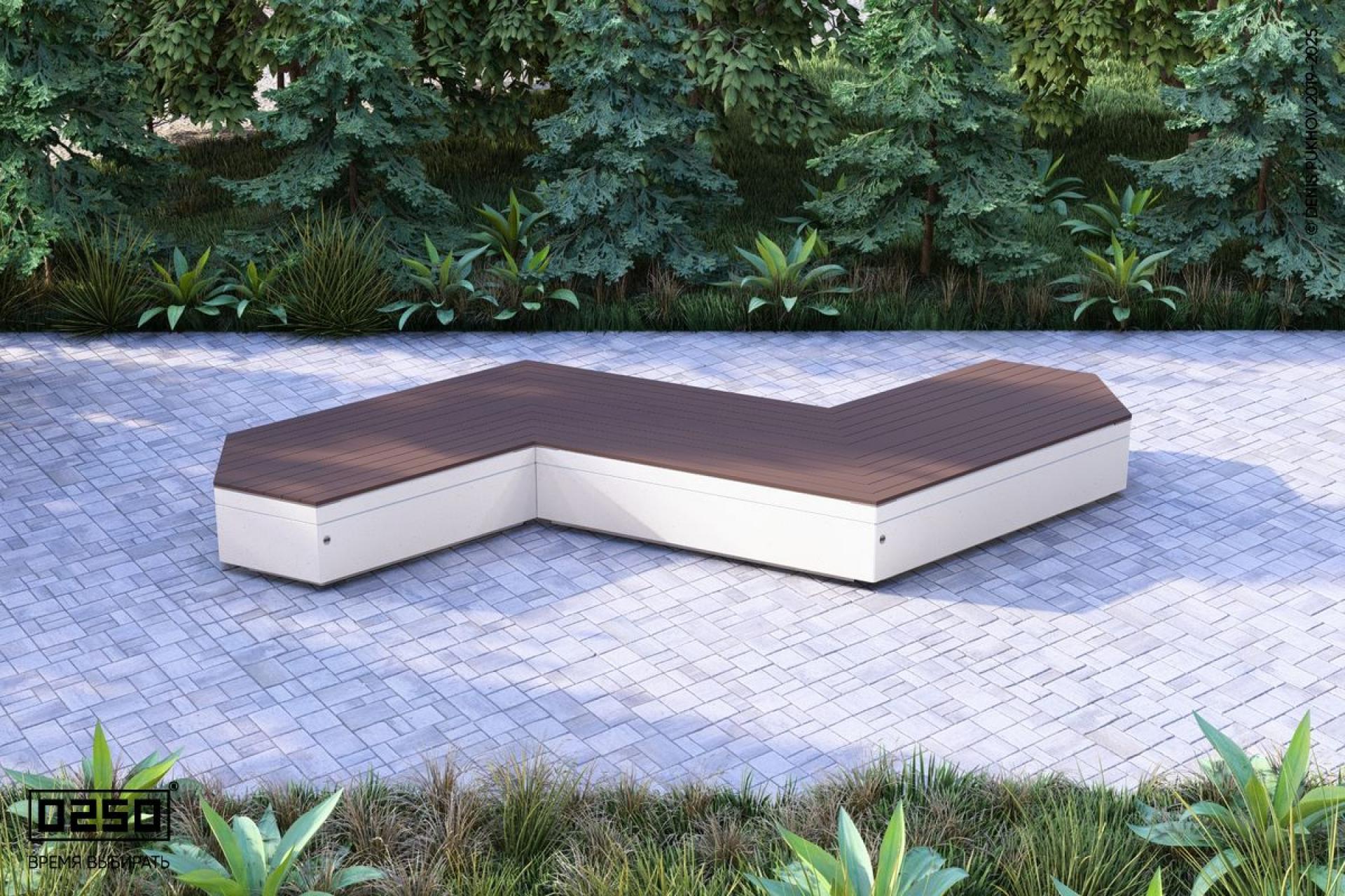 - Описание: Сверху напоминает букву z. Лучевая модульная в два ряда, прикасающиеся тыльной стороной. (состоит из прямых и скошенных скамеек). Вписывающиеся в повторяющейся геометрический рисунок трапецеидальной волны. Уличная для благоустройства общественных мест. Опора на блоке из полированного до глянца ультра-прочного бетона. Оба торца сужаются и формирует угол 120 градусов.