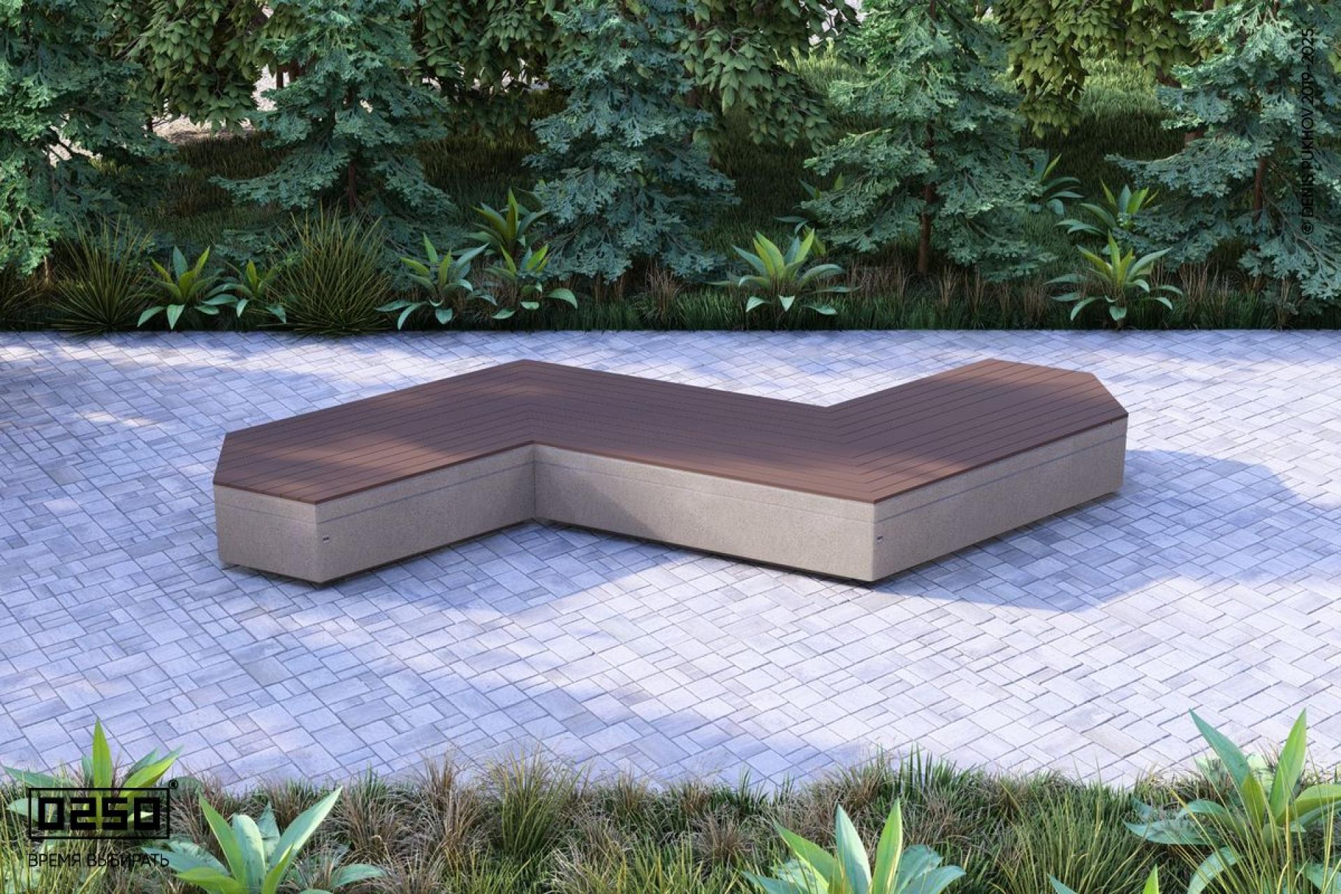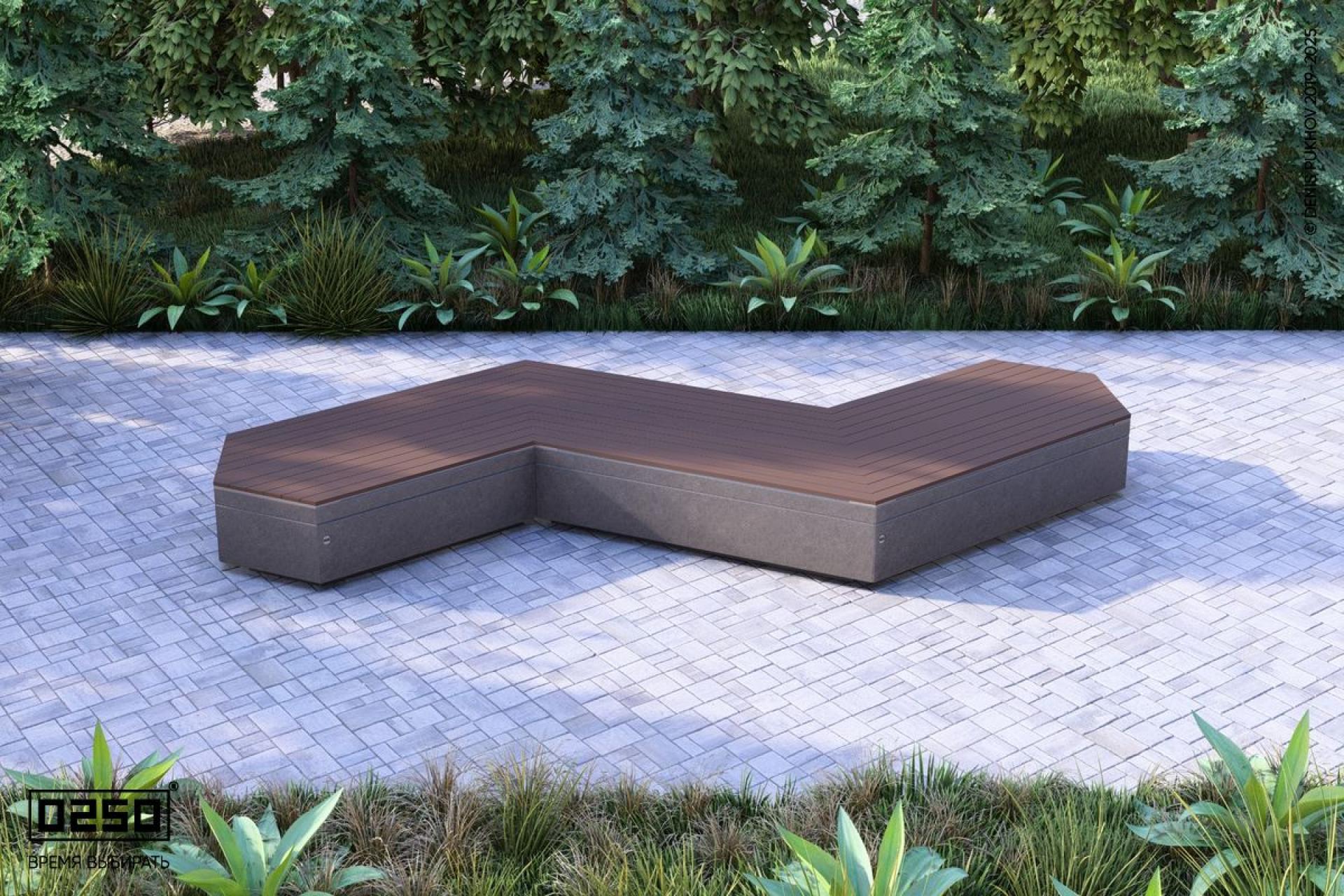 - Материалы скамейки: Скамейка из бетона и древесины (полированный ультра-прочный UHPС бетон 6 — цветов, уф-защищенная термодревесина темного цвета)